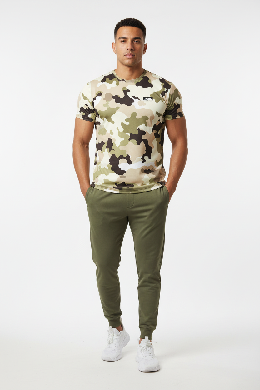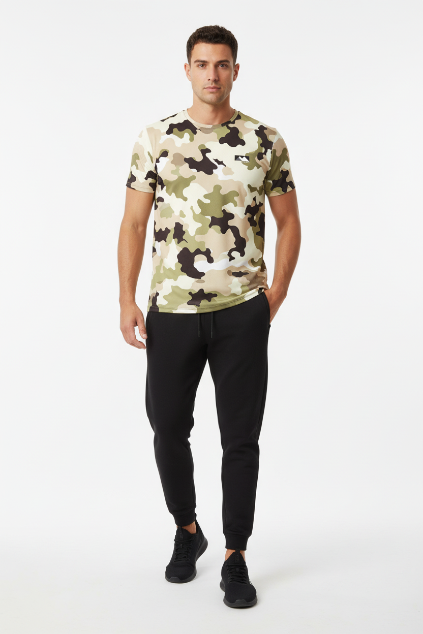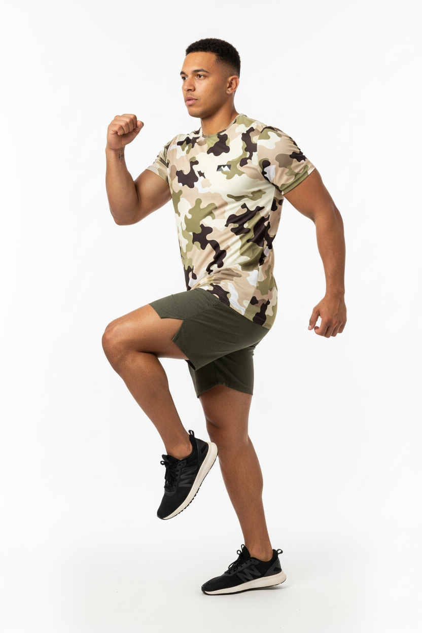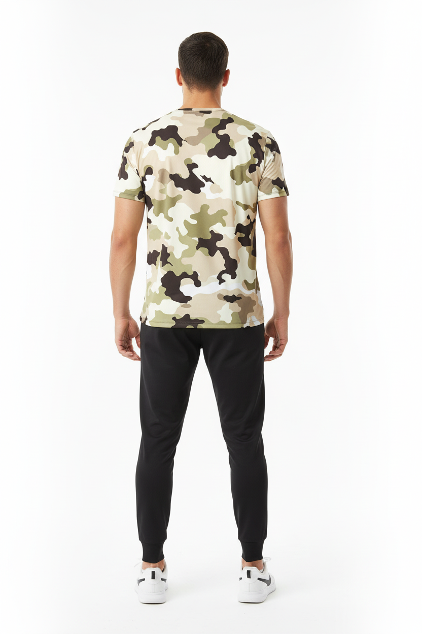 Blend into your environment with the Desert Camo Tactical Tee, featuring an authentic all-over desert camouflage pattern in tan, beige, olive green, and brown tones. This tactical-inspired performance tee combines military-grade aesthetics with athletic functionality, making it perfect for outdoor adventures, training sessions, or urban exploration.