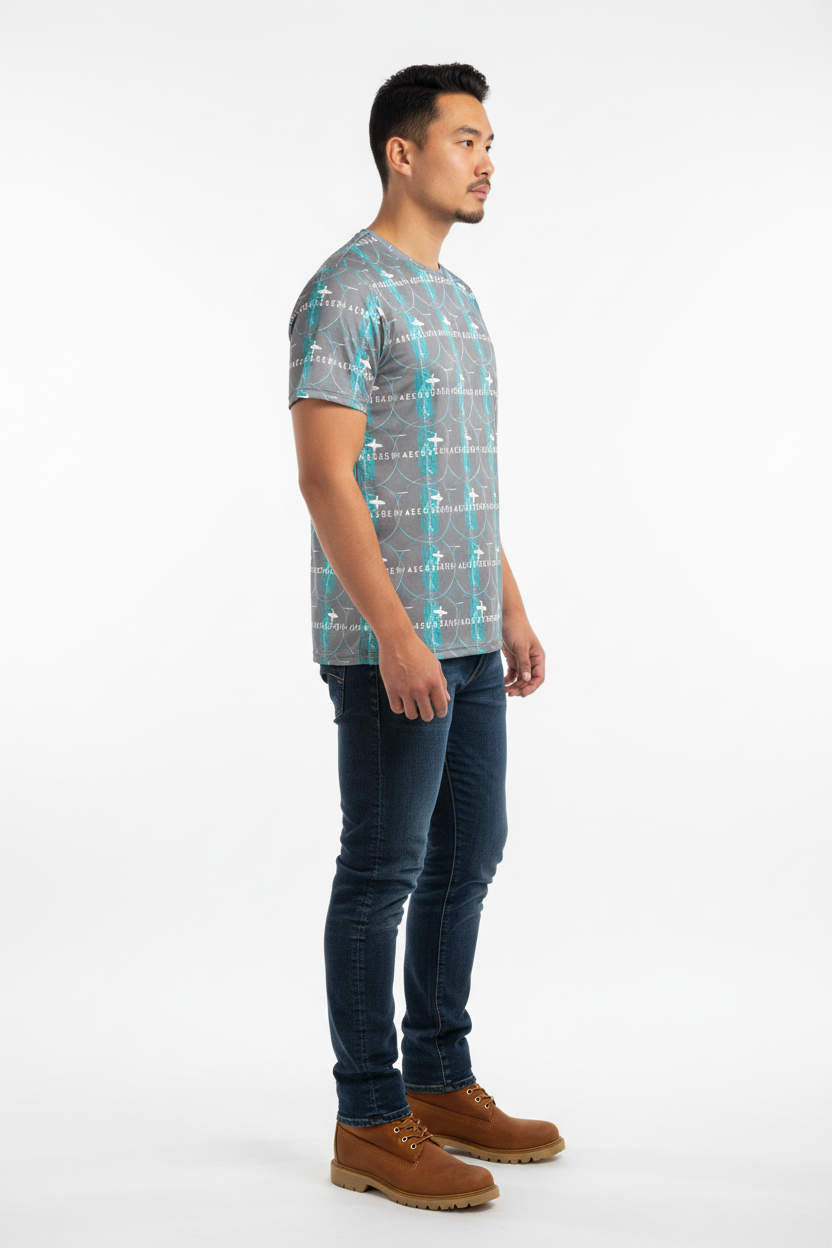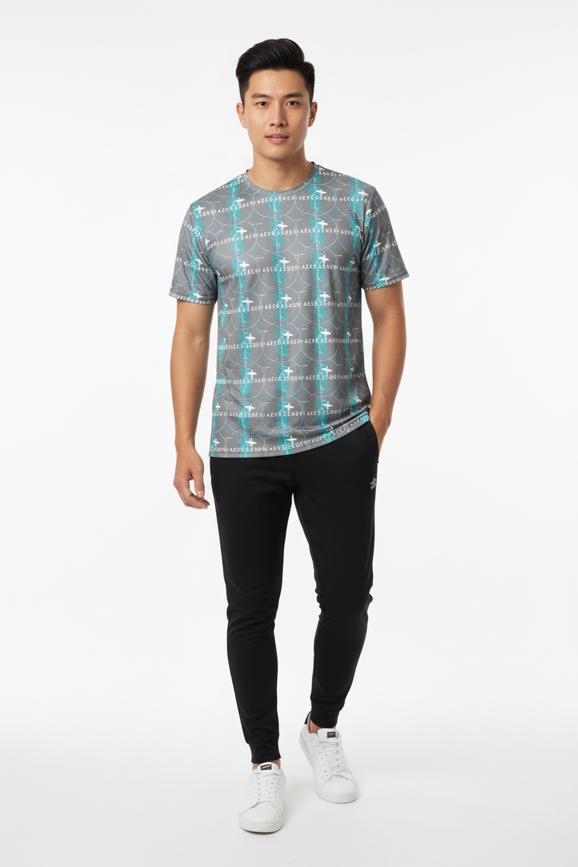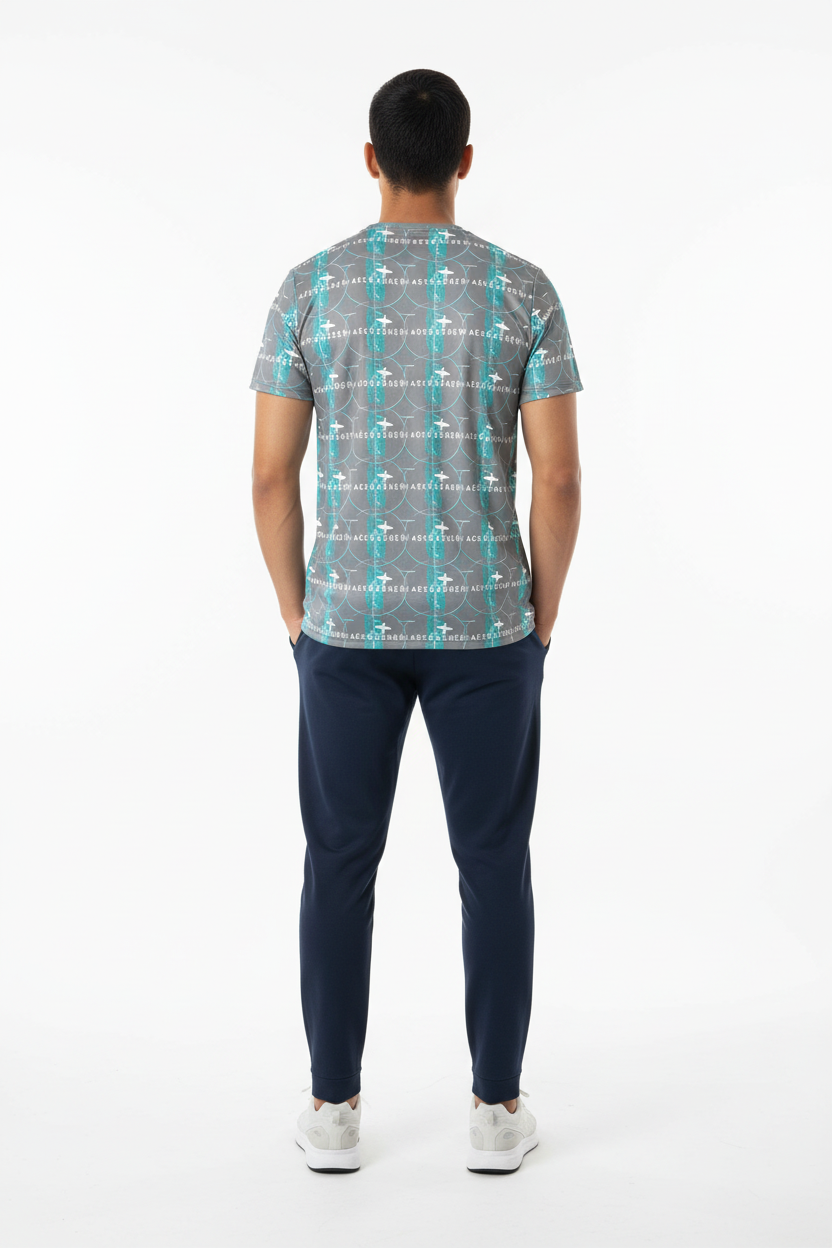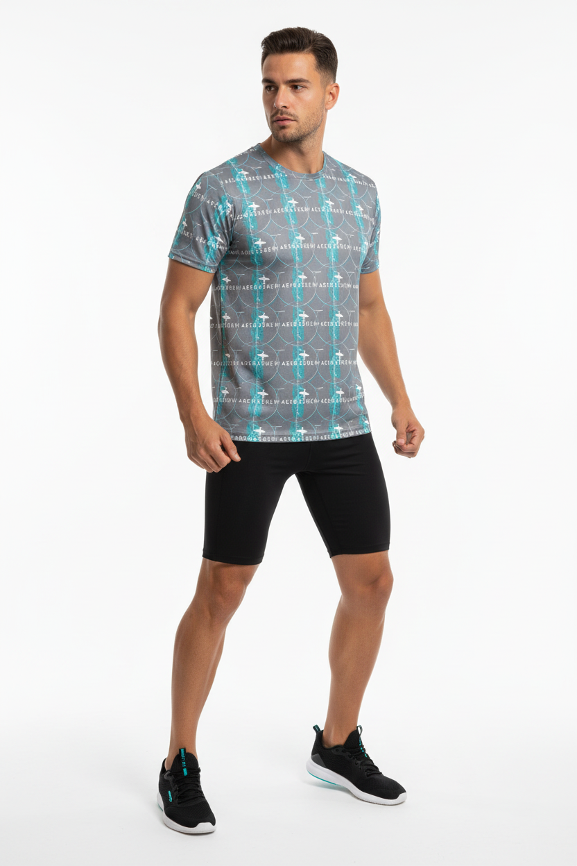 Introducing the WaveCrasher Athletic Tee—where dynamic design meets serious performance. Featuring a bold pattern of flowing waves, geometric elements, and vibrant turquoise accents on a sleek gray background, this isn't just an athletic shirt; it's your go-to gear for crushing workouts in style.
