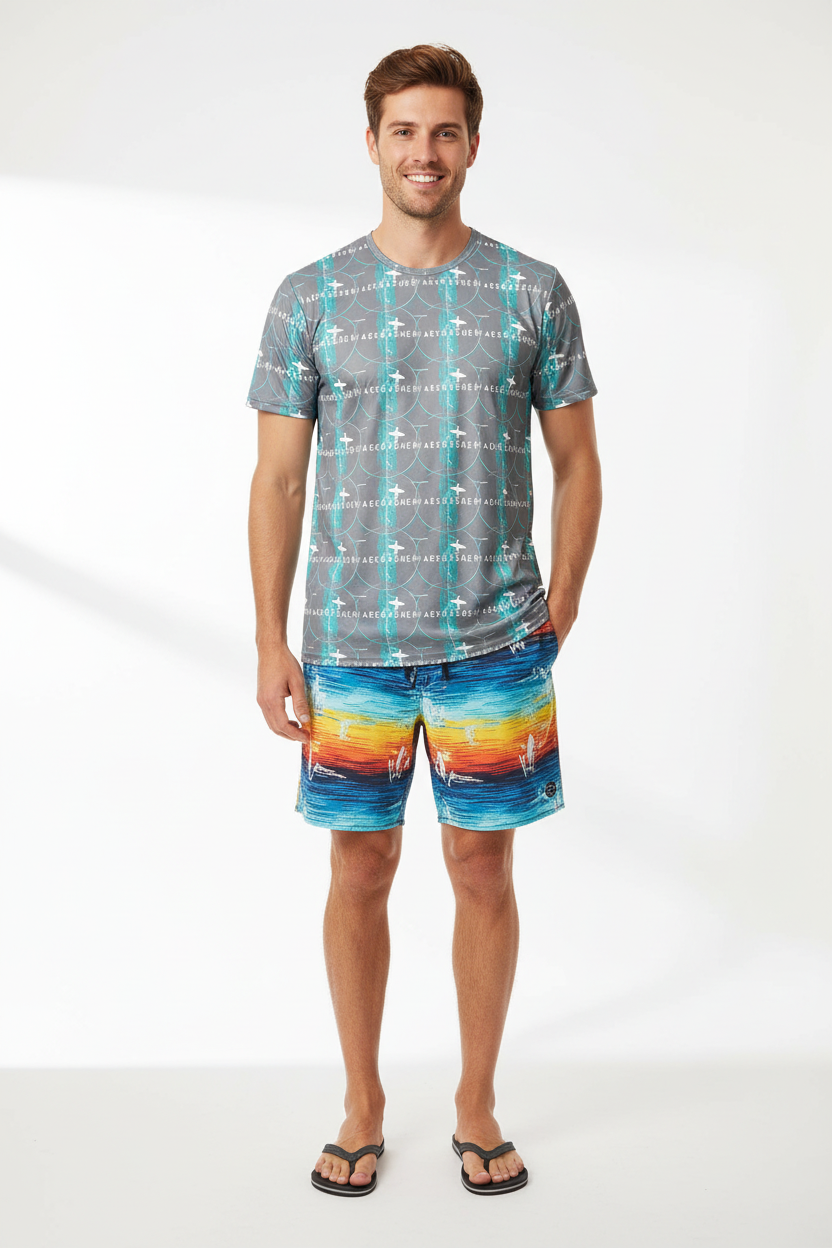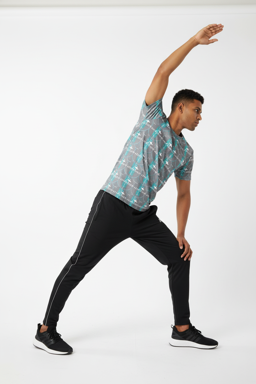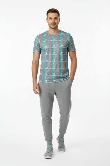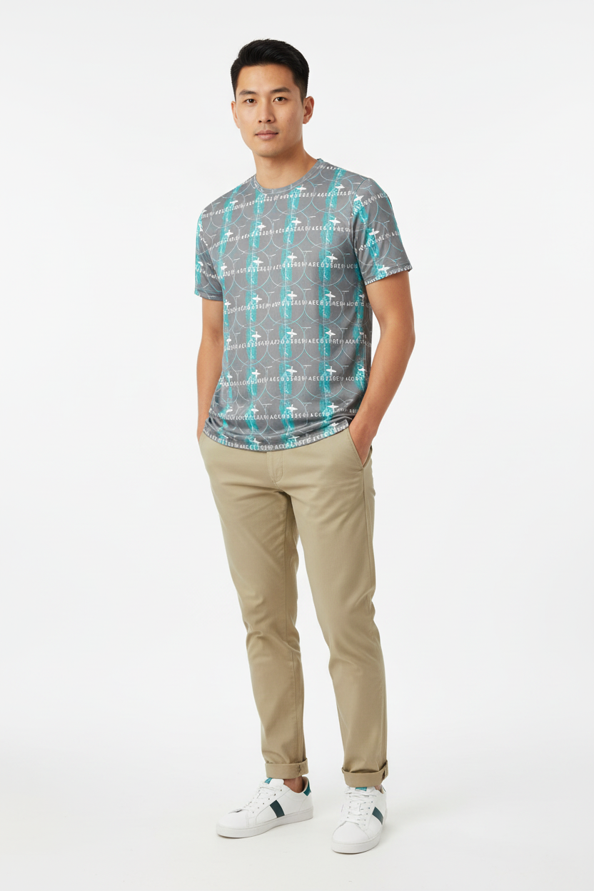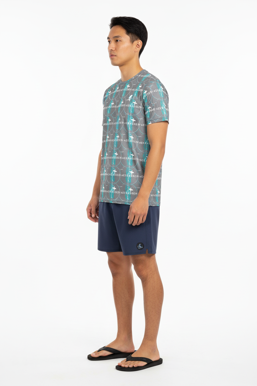 Introducing the WaveCrasher Athletic Tee—where dynamic design meets serious performance. Featuring a bold pattern of flowing waves, geometric elements, and vibrant turquoise accents on a sleek gray background, this isn't just an athletic shirt; it's your go-to gear for crushing workouts in style.