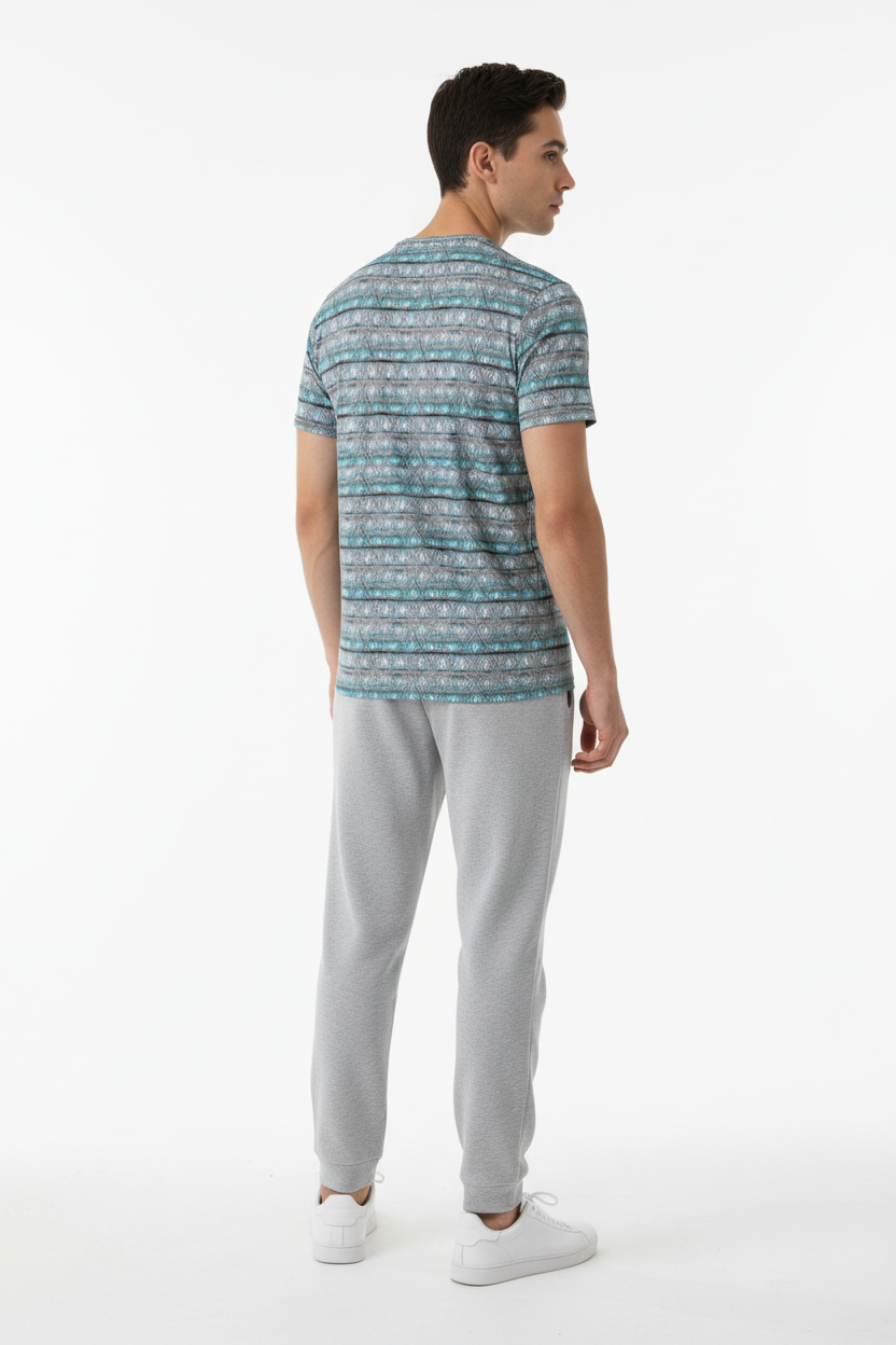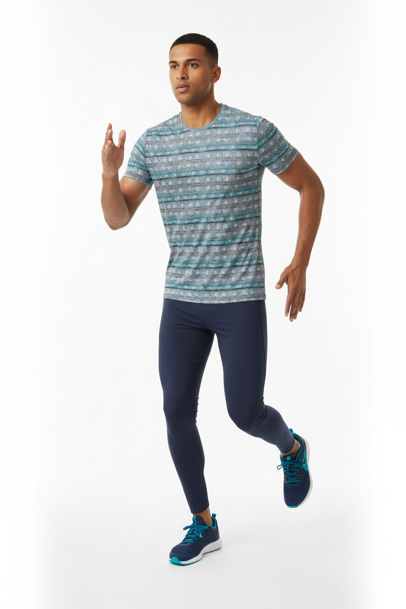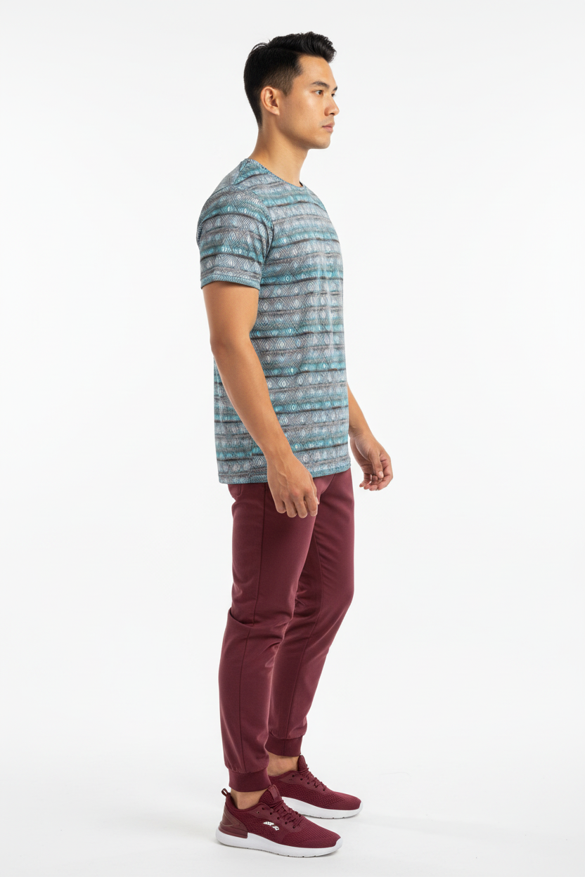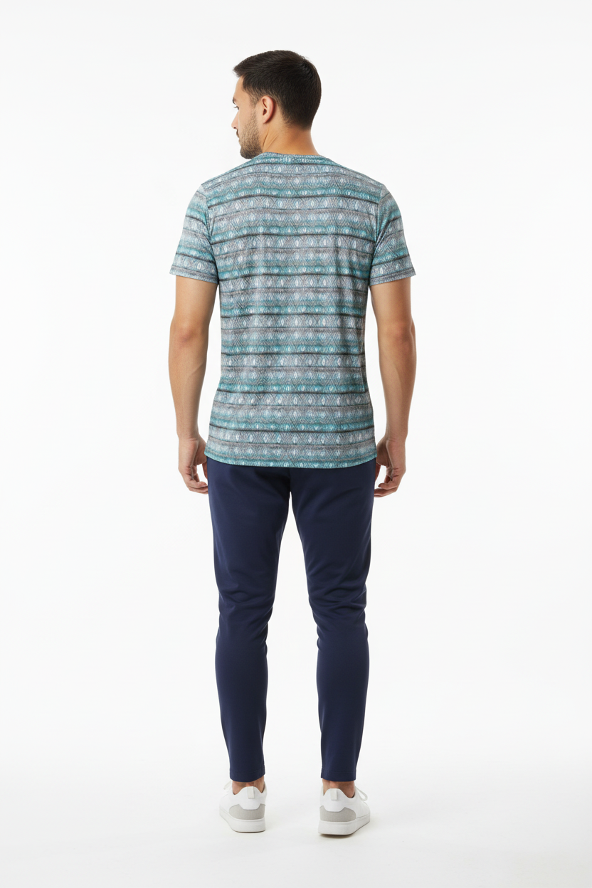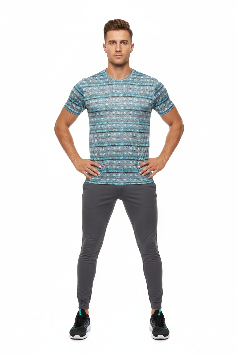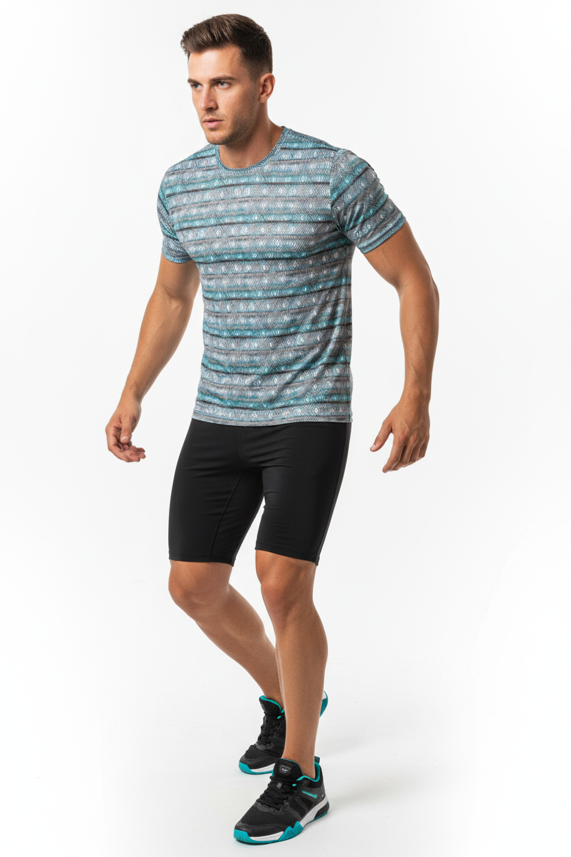Introducing the Diamond Wave Athletic Performance Tee—where striking geometric design meets serious athletic performance. Featuring a mesmerizing diamond pattern in turquoise, gray, and white tones that creates a dynamic wave effect, this isn't just a workout shirt; it's your performance partner that keeps you cool, dry, and looking sharp.