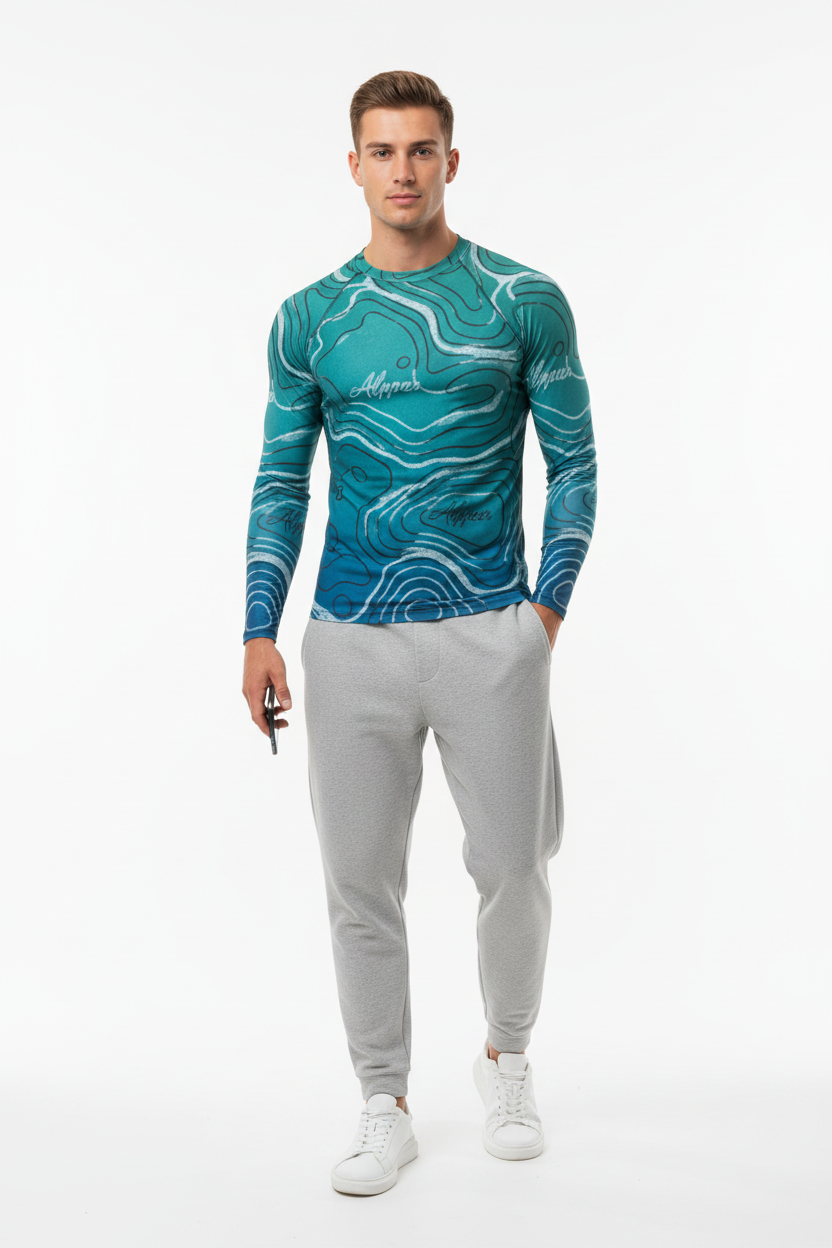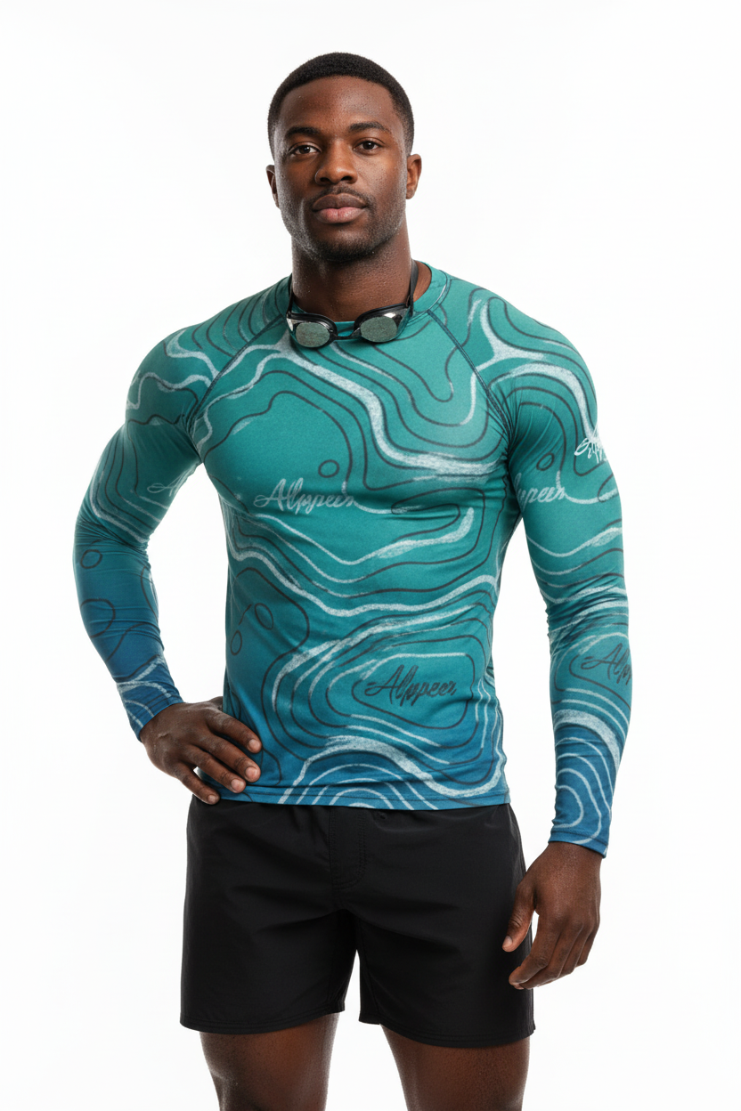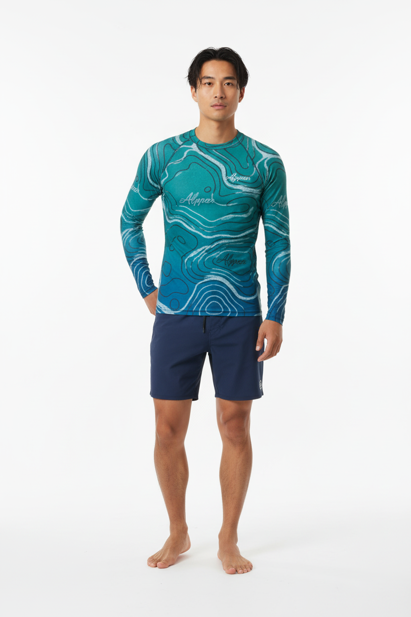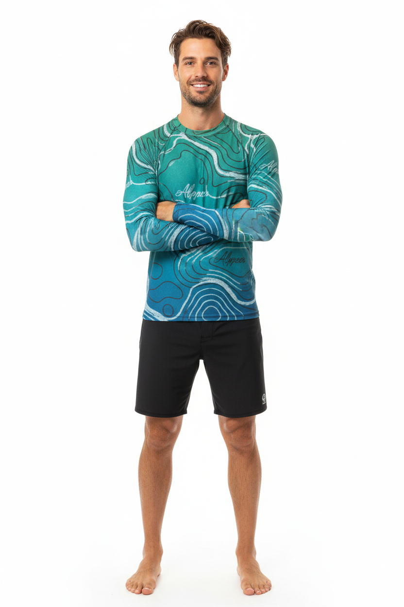The Topo Flow Long Sleeve Rash Guard brings topographic artistry to your active lifestyle with extended coverage and protection. Whether you're catching waves, paddleboarding, or enjoying outdoor adventures, this eco-conscious performance piece keeps you protected and looking sharp with its flowing turquoise contour map design.