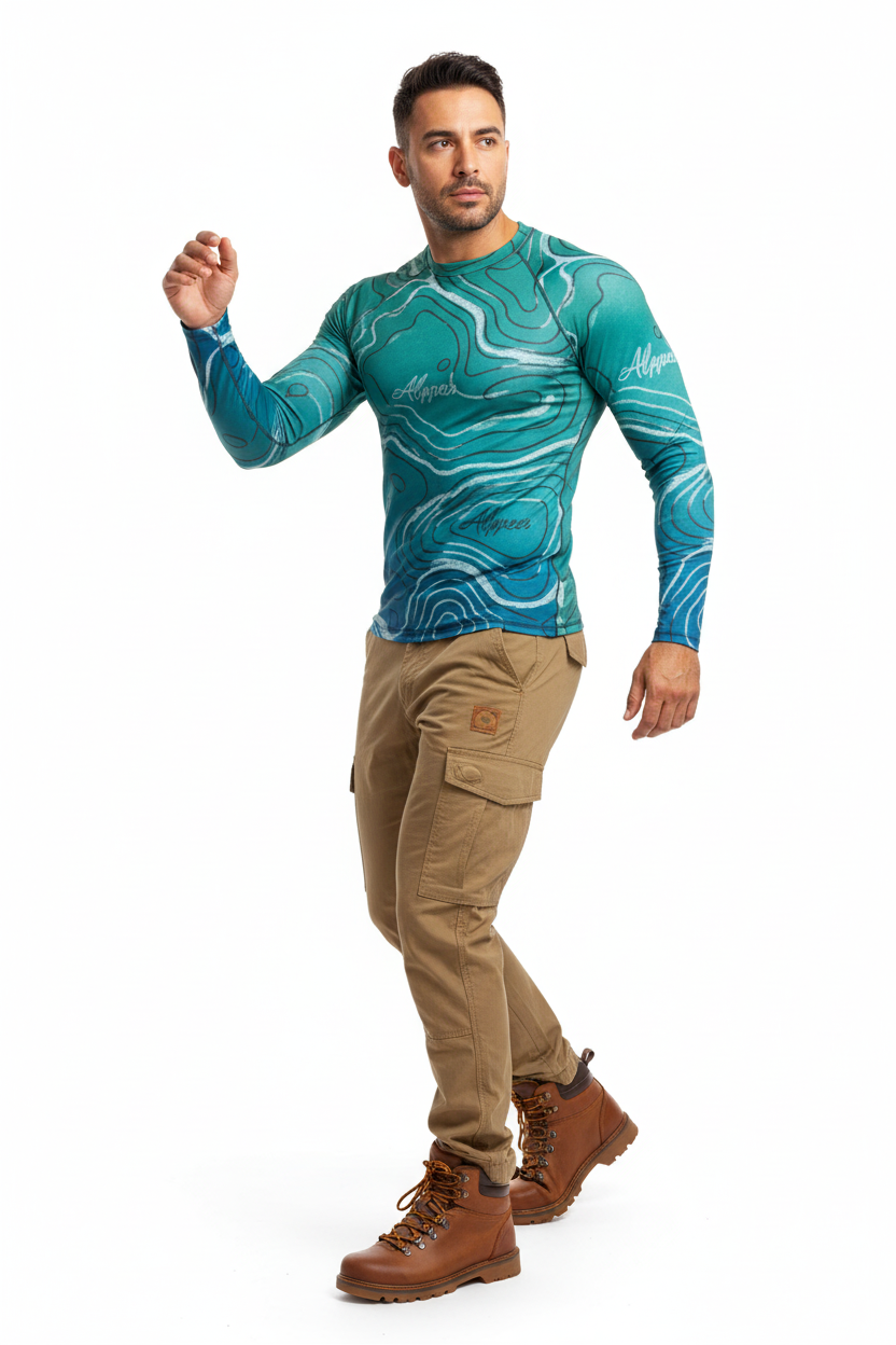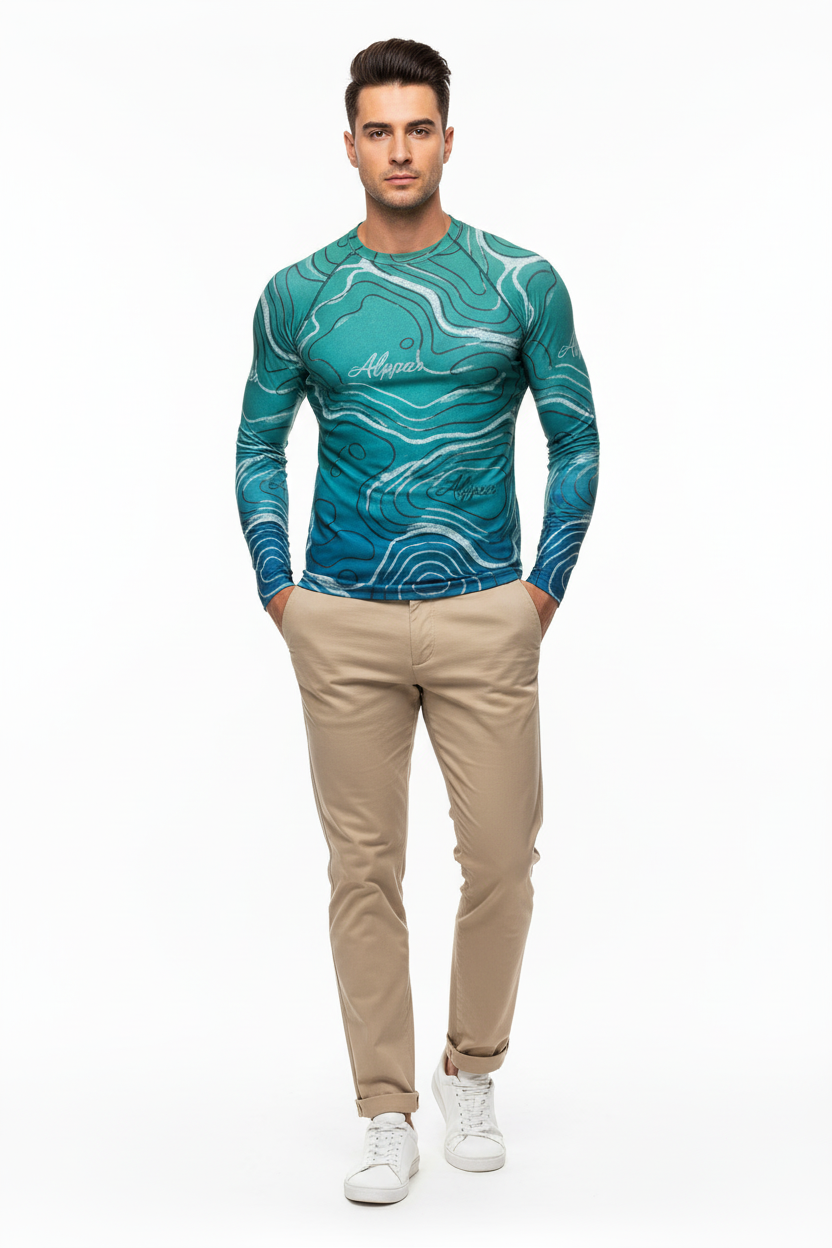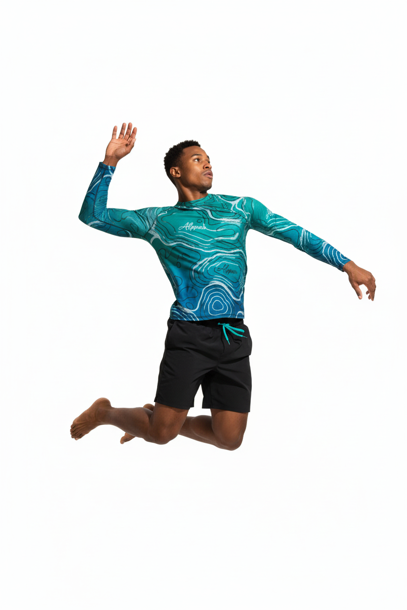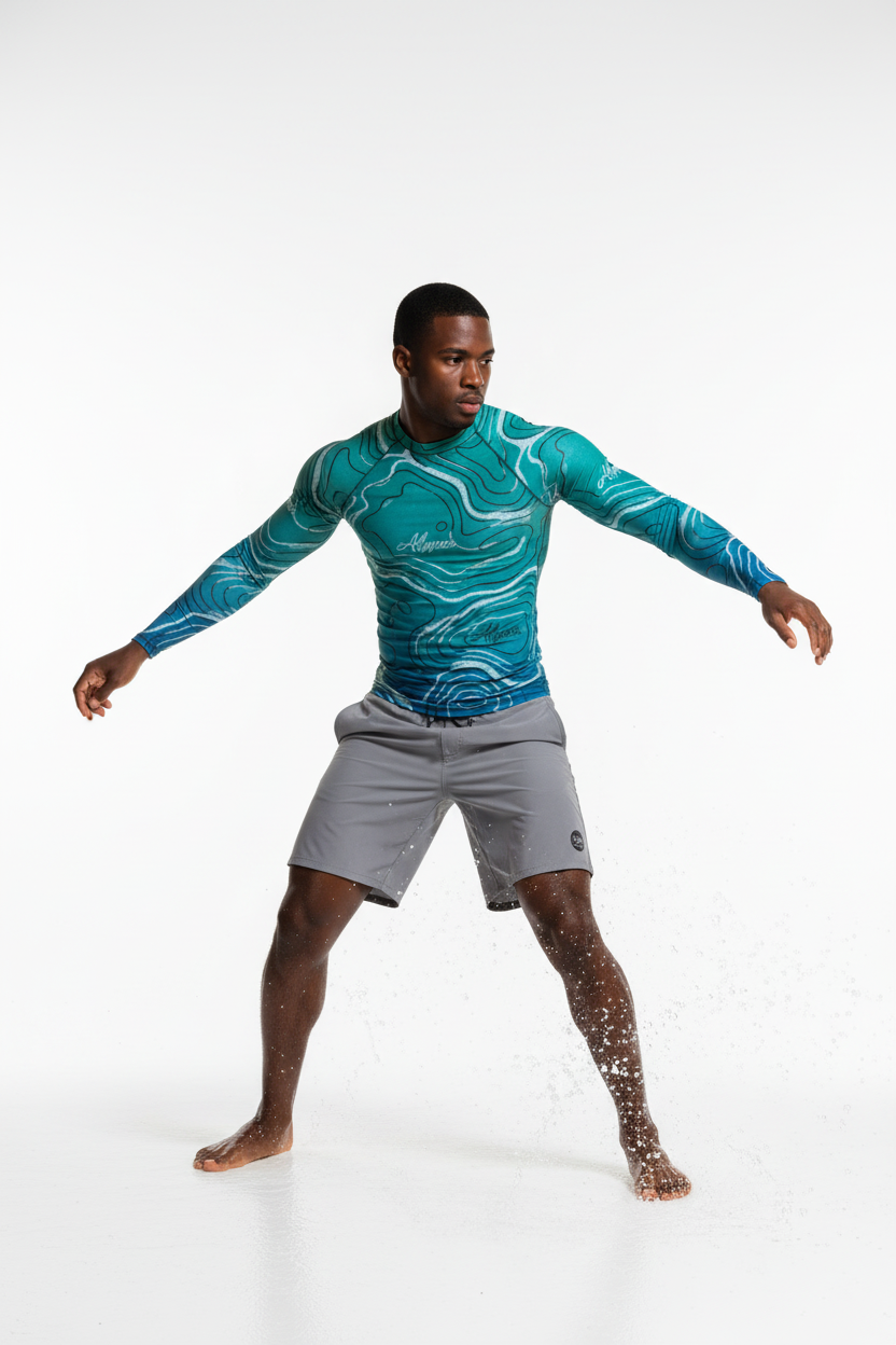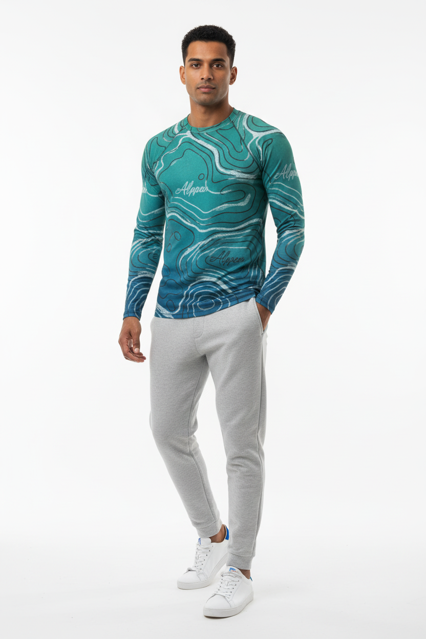 The Topo Flow Long Sleeve Rash Guard brings topographic artistry to your active lifestyle with extended coverage and protection. Whether you're catching waves, paddleboarding, or enjoying outdoor adventures, this eco-conscious performance piece keeps you protected and looking sharp with its flowing turquoise contour map design.