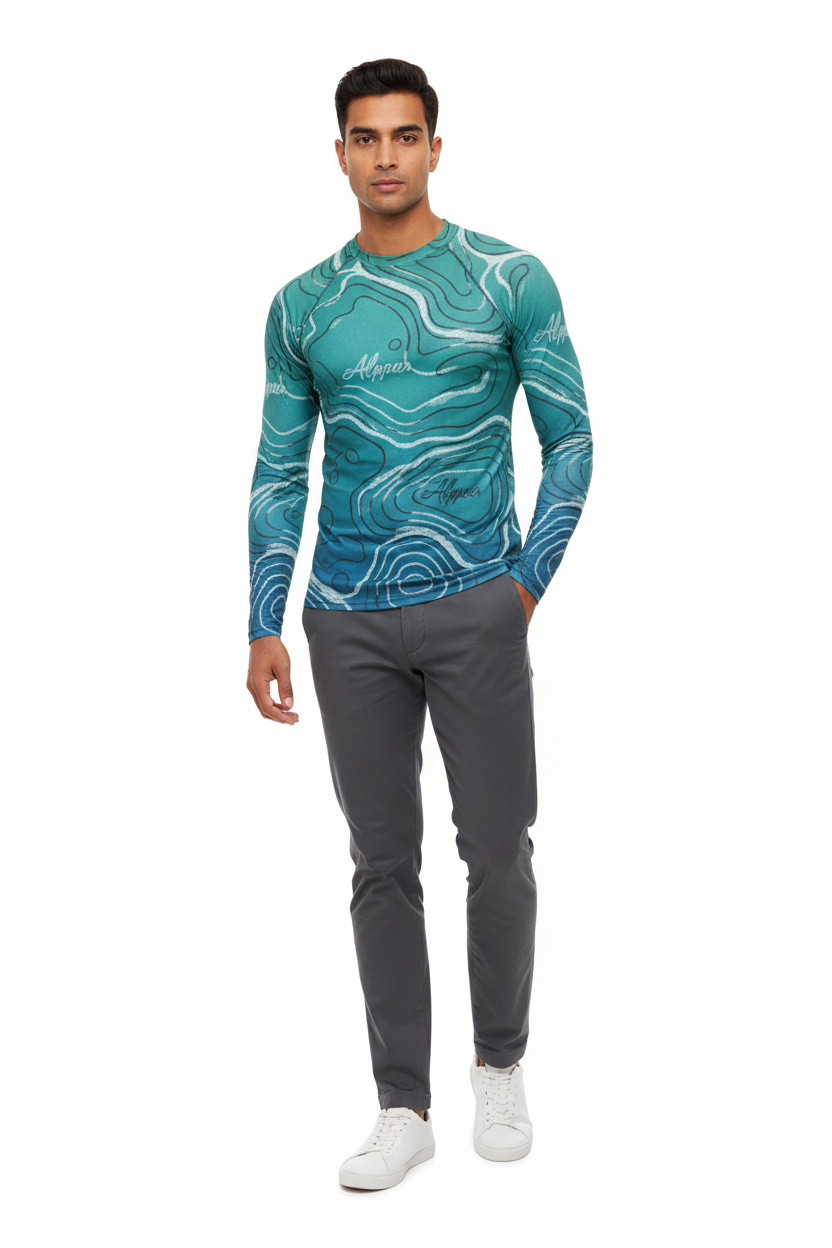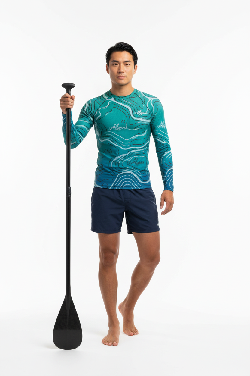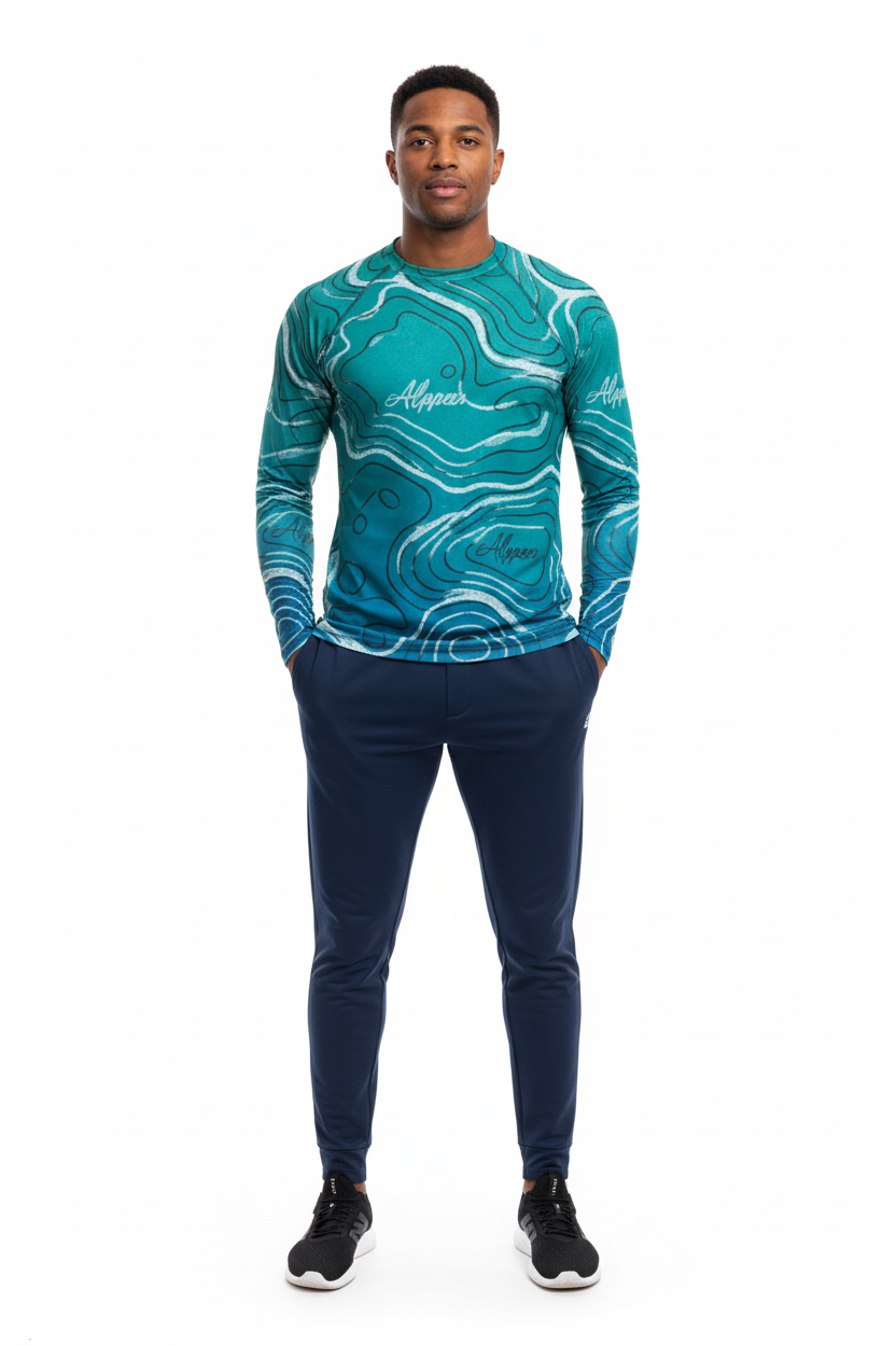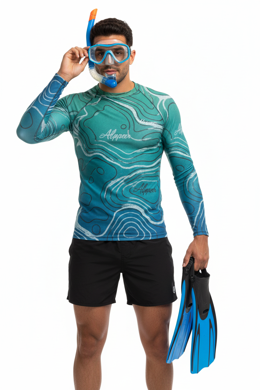 The Topo Flow Long Sleeve Rash Guard brings topographic artistry to your active lifestyle with extended coverage and protection. Whether you're catching waves, paddleboarding, or enjoying outdoor adventures, this eco-conscious performance piece keeps you protected and looking sharp with its flowing turquoise contour map design.