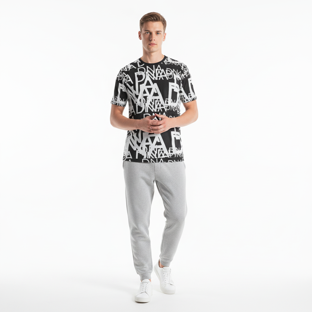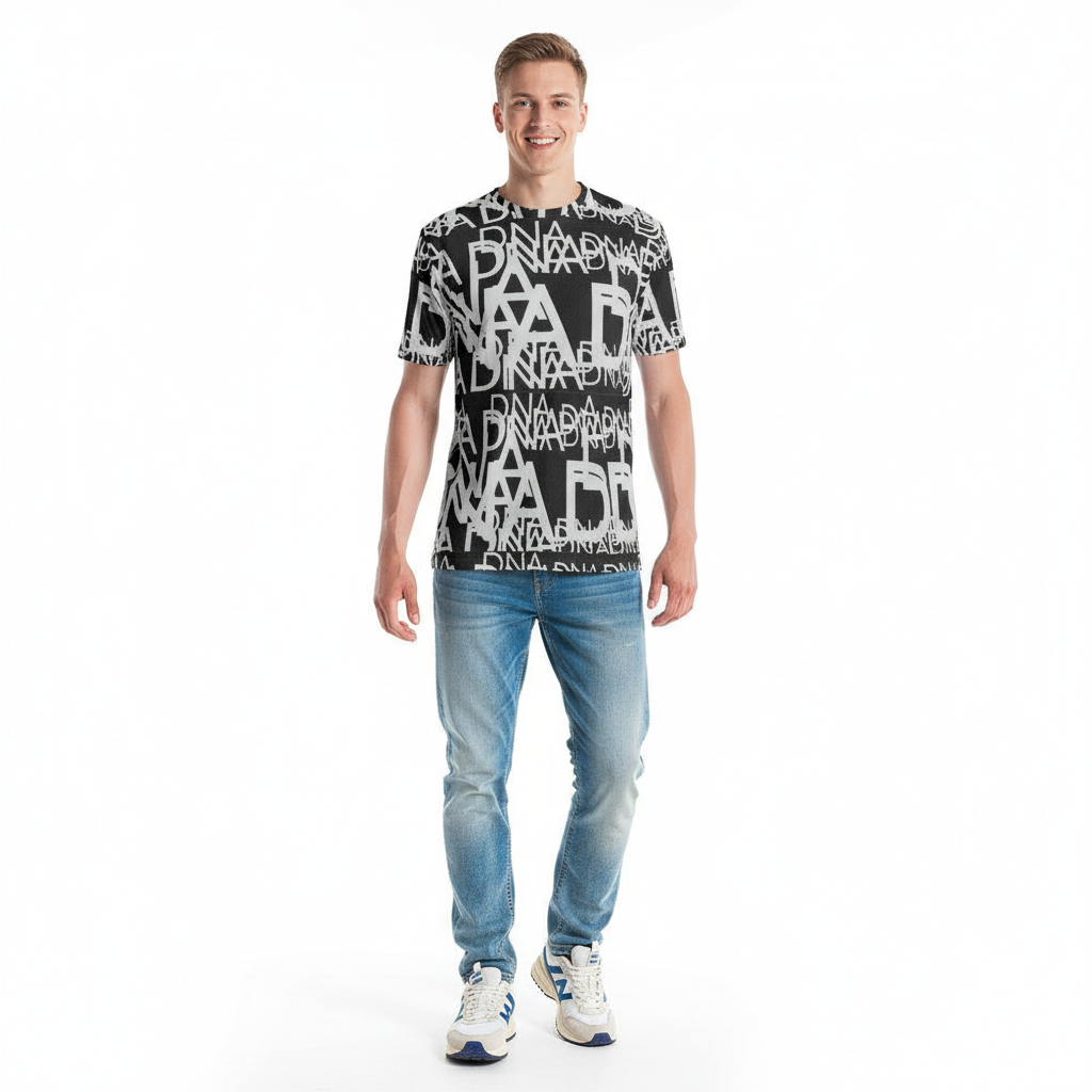 The DNA (GOD IS IN THE DETAILS) Men's t-shirt isn't just apparel—it's a conversation starter. Featuring a bold all-over print pattern with striking black and white DNA typography, this tee celebrates the beauty found in life's intricate details and the philosophy that excellence lives in the small things.