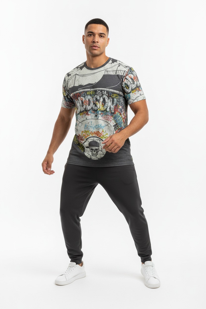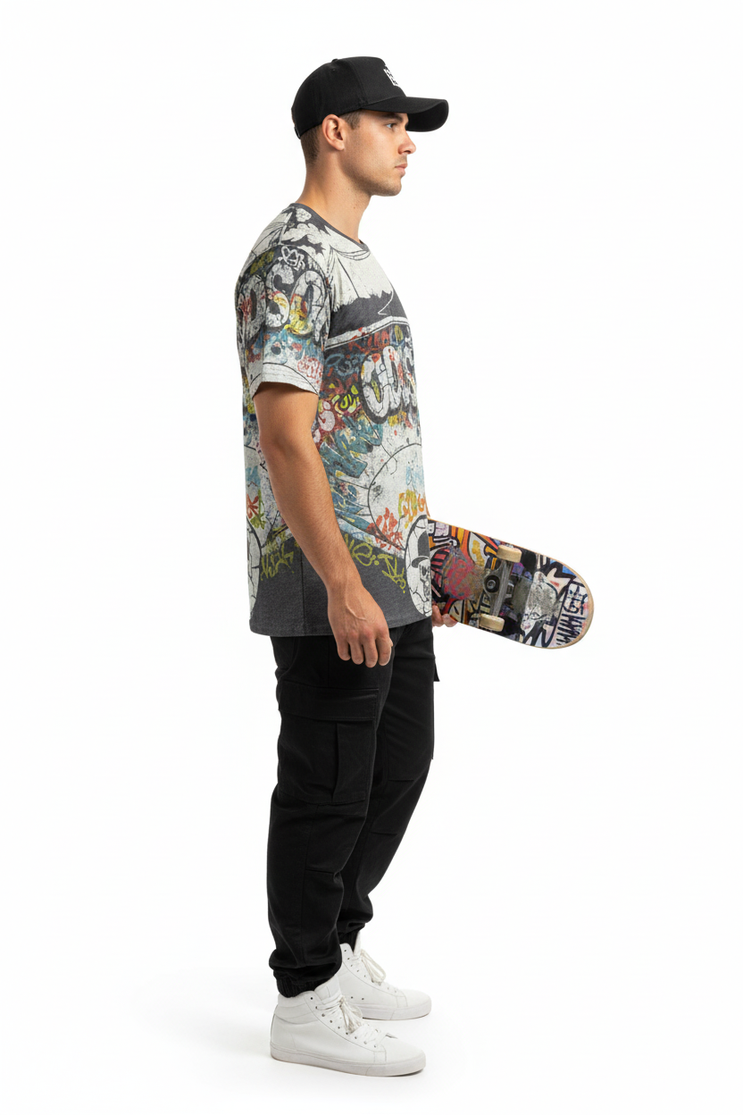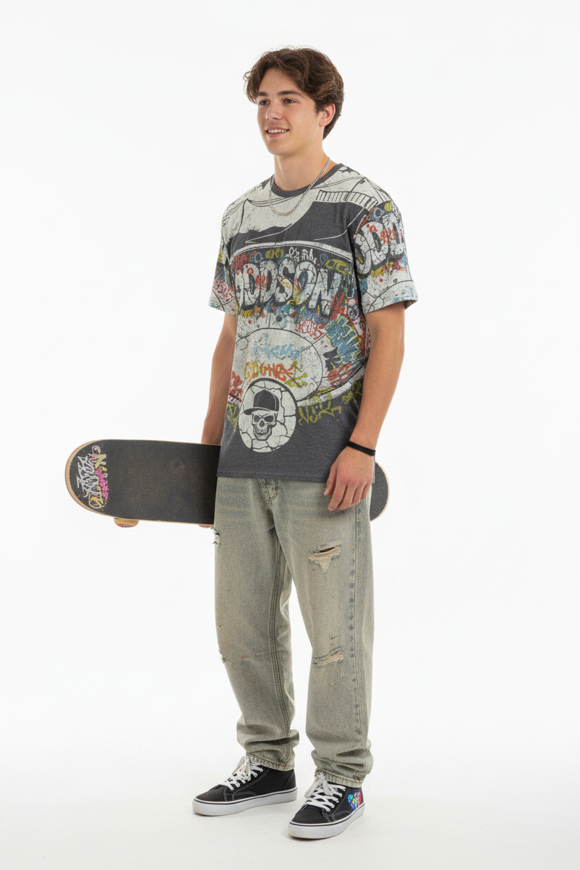 Transform into a walking canvas of skate culture with the ODDSON Skate Park Graffiti All-Over Print Tee—where authentic street art meets premium apparel. This isn't just a graphic tee; it's an immersive experience that wraps your entire body in the raw, unfiltered energy of underground skate parks.