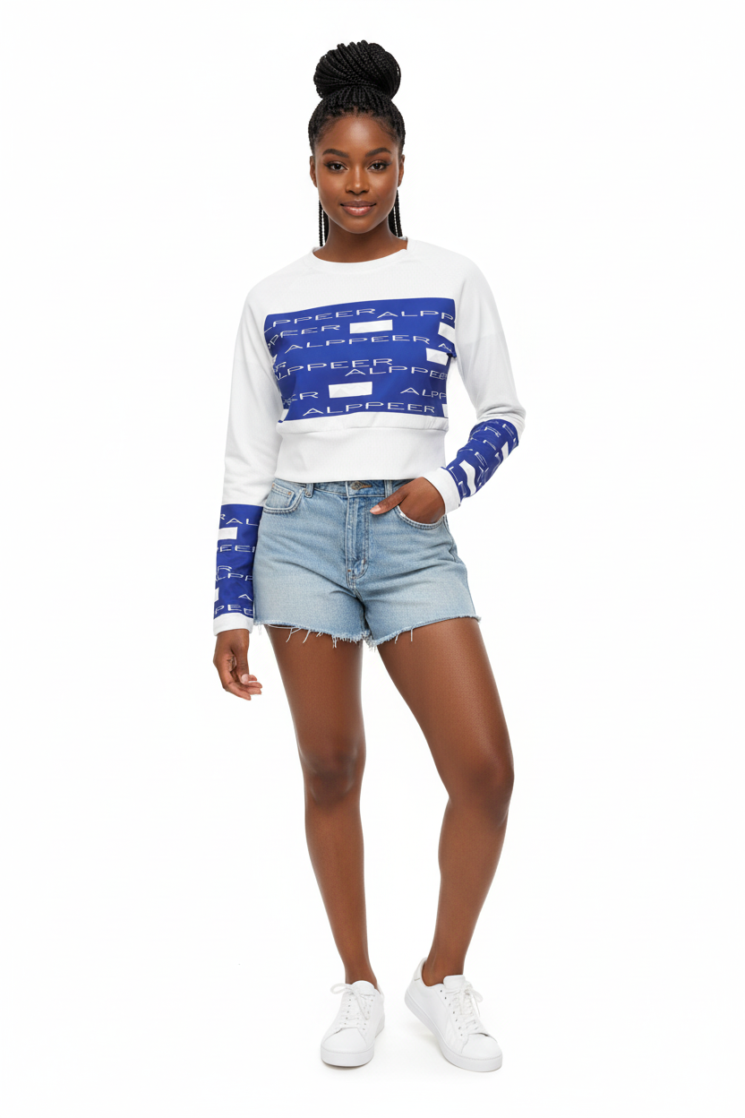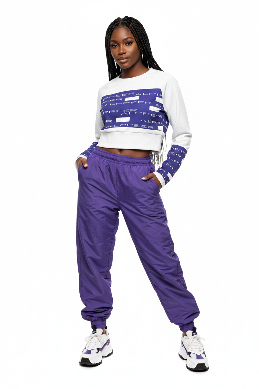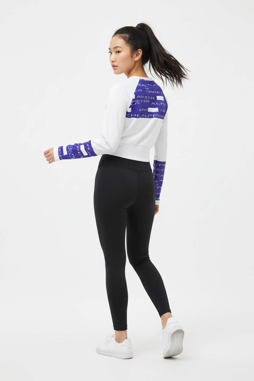 Make a bold statement with this eco-conscious long-sleeve crop top featuring the signature Alppeer brand pattern in striking purple and white. The modern design wraps across the chest and sleeves, creating a dynamic athletic aesthetic that transitions seamlessly from workout to weekend.