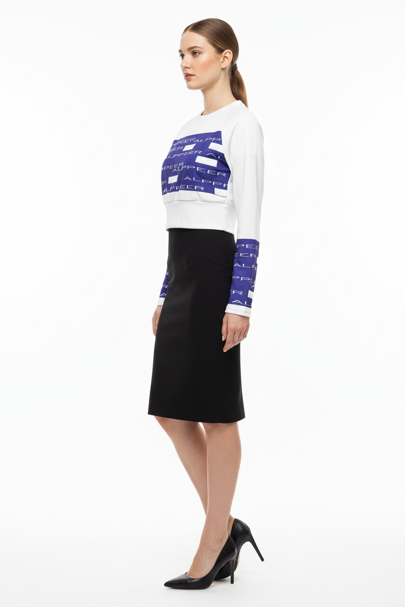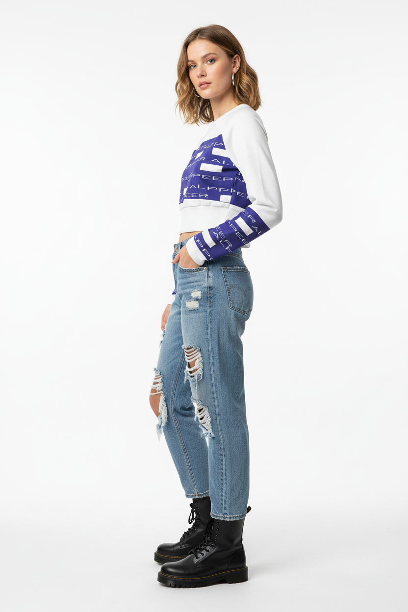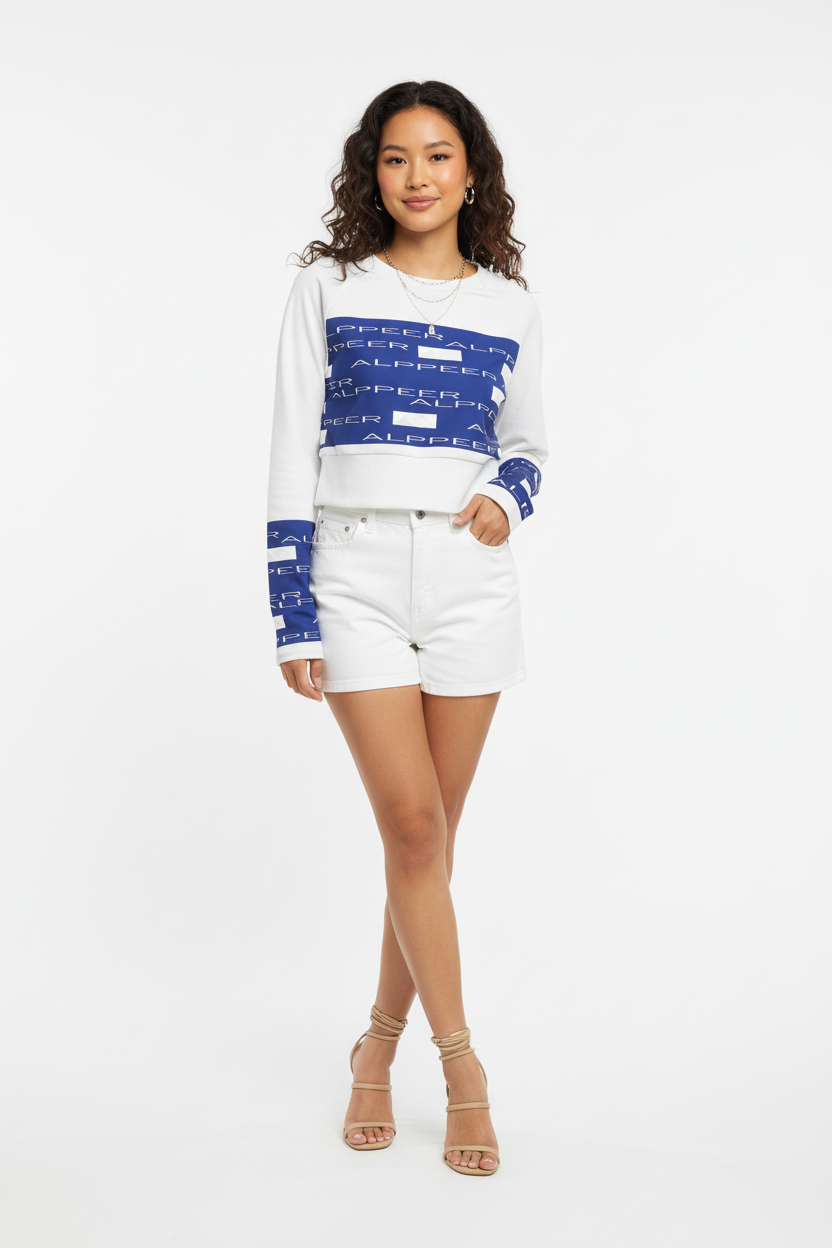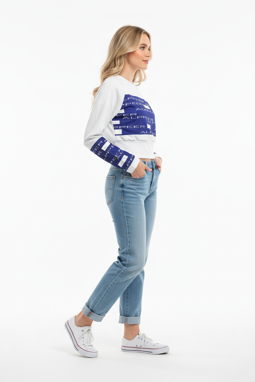 Make a bold statement with this eco-conscious long-sleeve crop top featuring the signature Alppeer brand pattern in striking purple and white. The modern design wraps across the chest and sleeves, creating a dynamic athletic aesthetic that transitions seamlessly from workout to weekend.