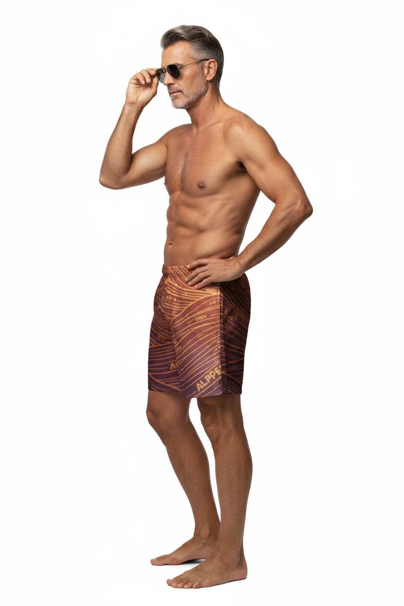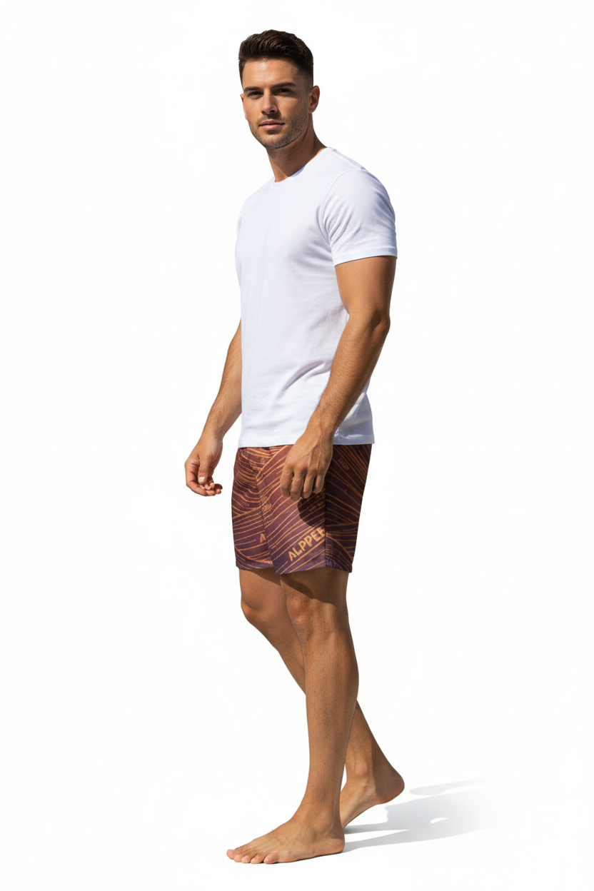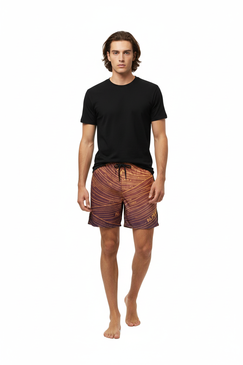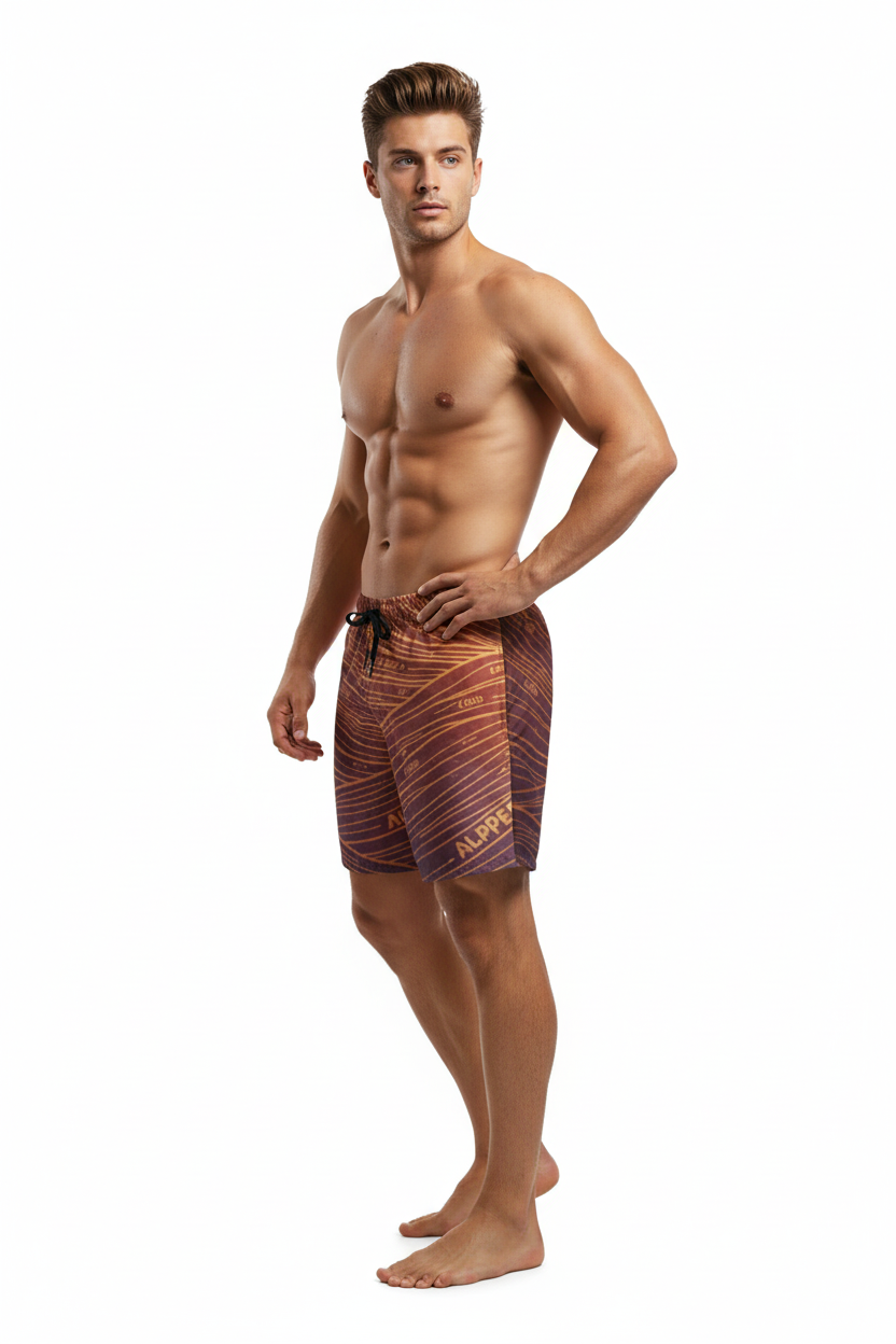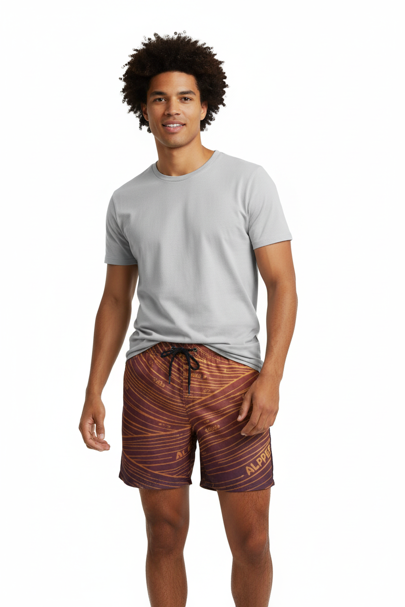 Description: Make waves in the Alppeer Sunset Stripe Swim Trunks. Featuring bold diagonal stripes in rich burgundy and golden hues, these eco-friendly recycled swim trunks bring premium style to every beach day, pool party, and coastal adventure.