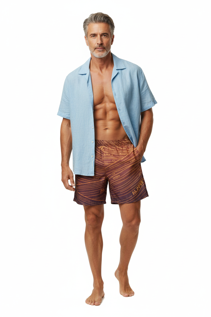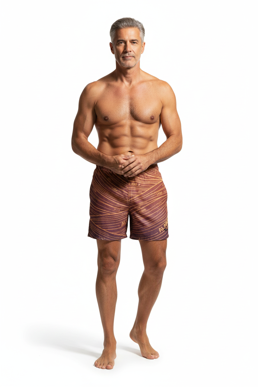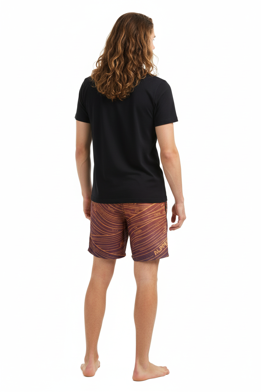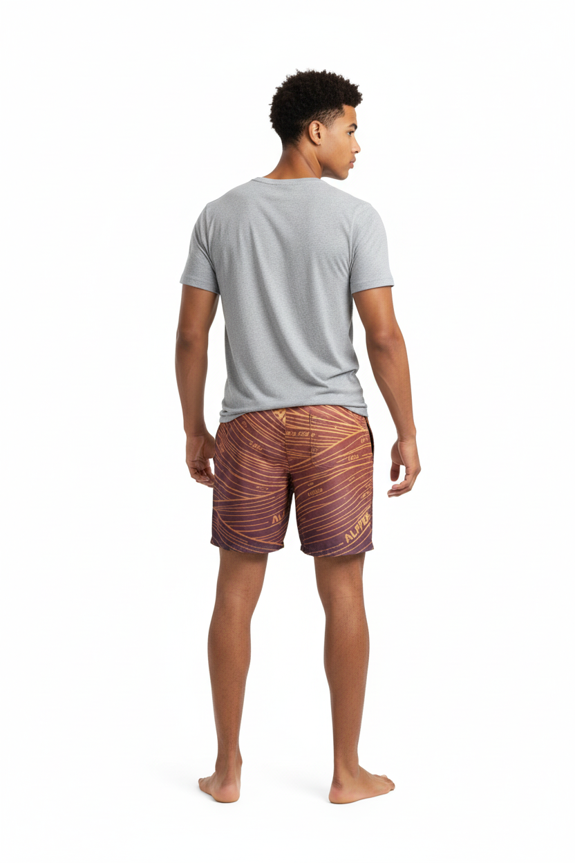 Description: Make waves in the Alppeer Sunset Stripe Swim Trunks. Featuring bold diagonal stripes in rich burgundy and golden hues, these eco-friendly recycled swim trunks bring premium style to every beach day, pool party, and coastal adventure.