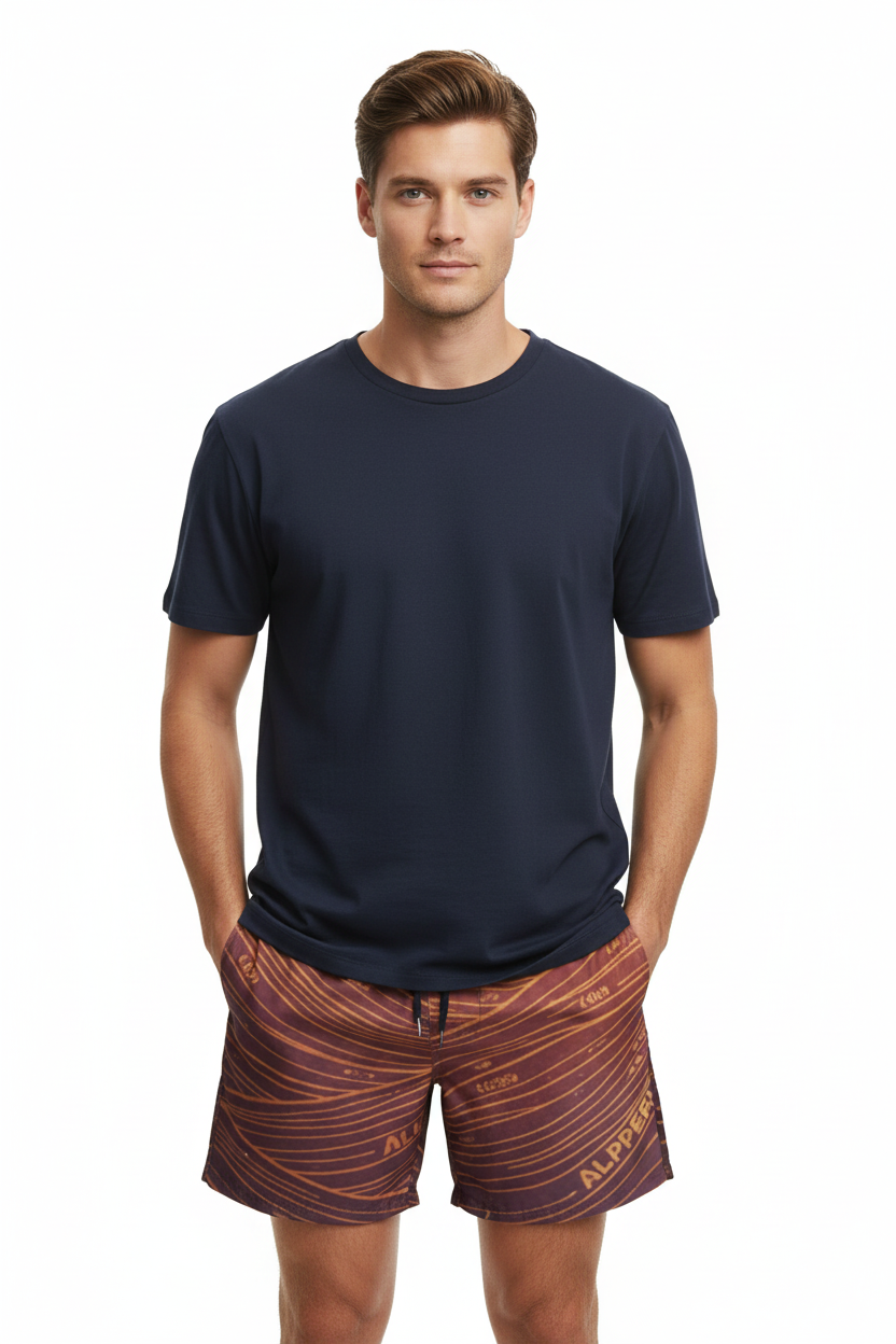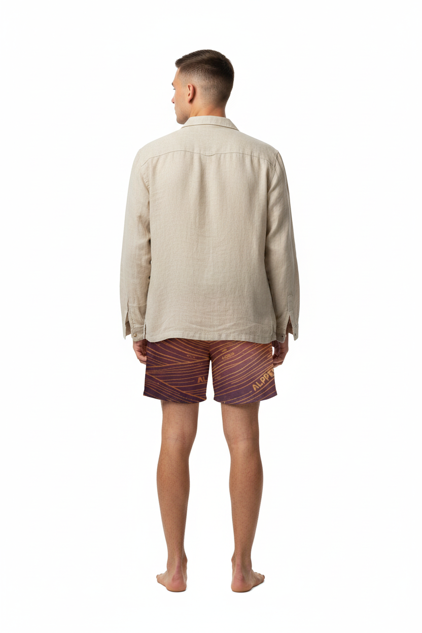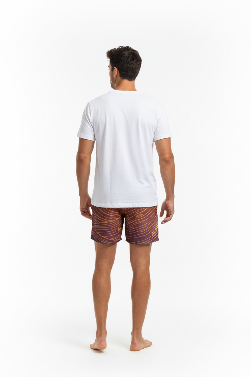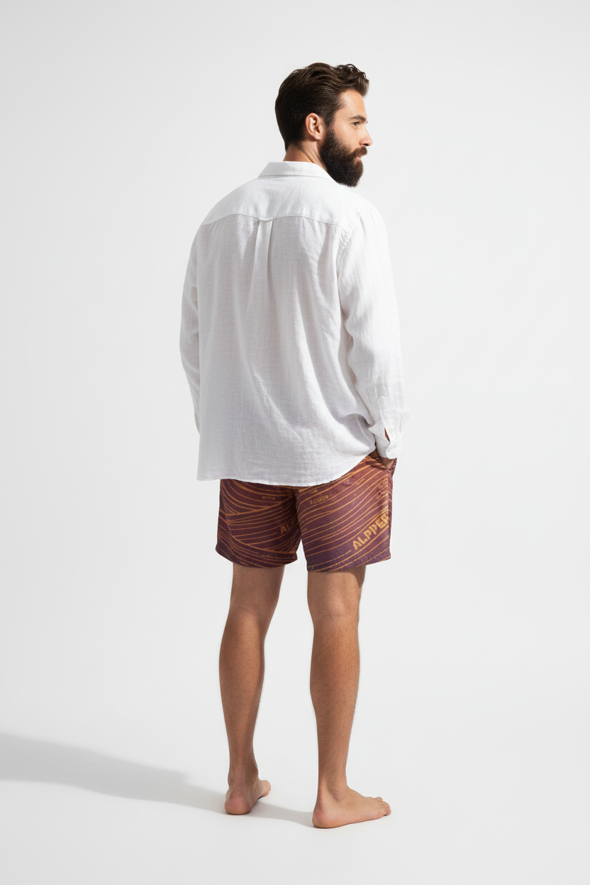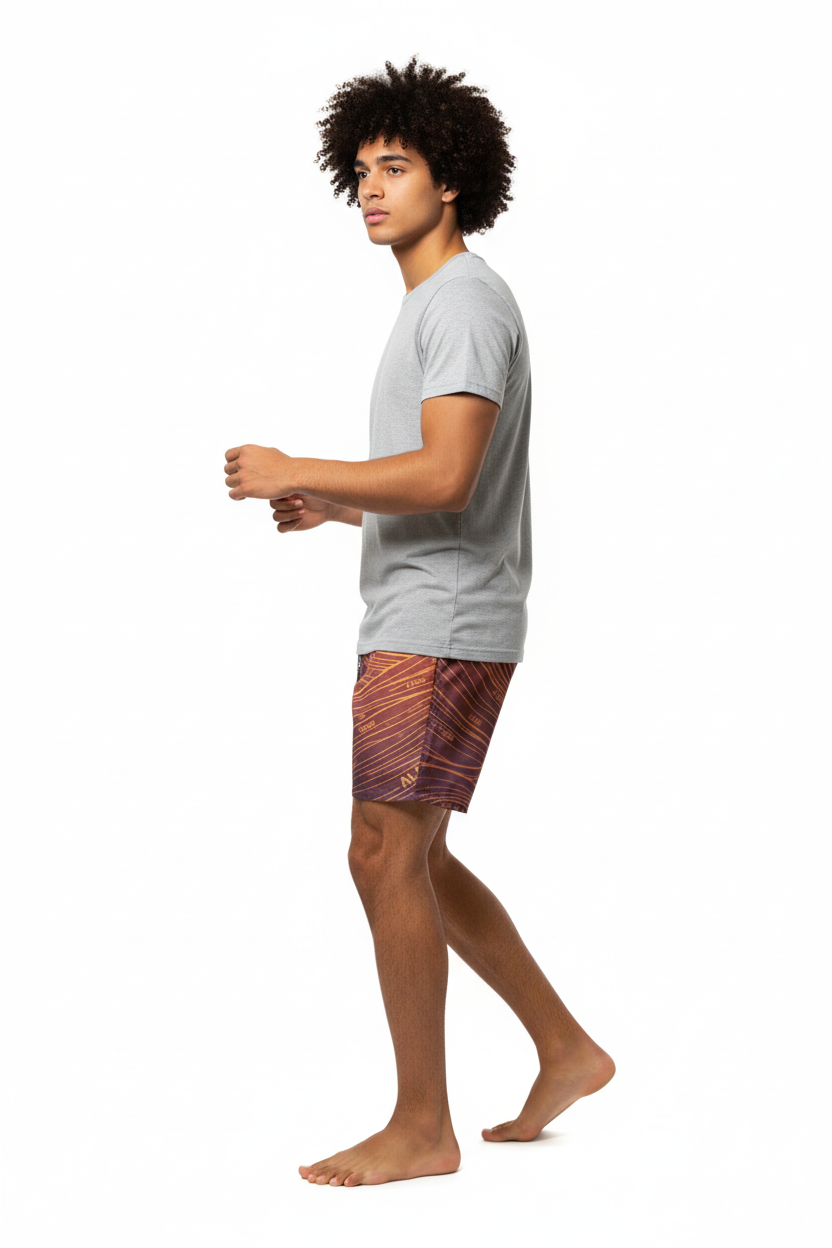 Description: Make waves in the Alppeer Sunset Stripe Swim Trunks. Featuring bold diagonal stripes in rich burgundy and golden hues, these eco-friendly recycled swim trunks bring premium style to every beach day, pool party, and coastal adventure.