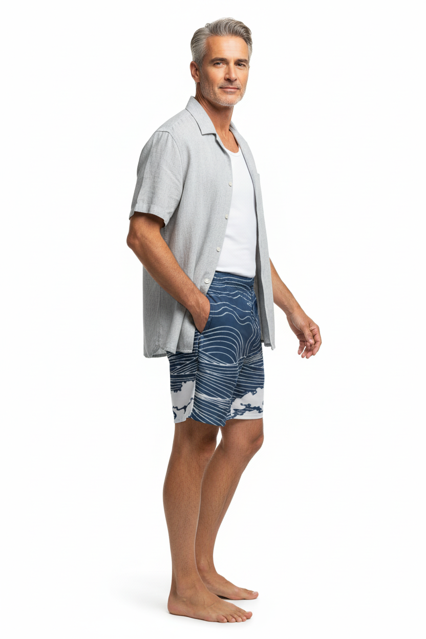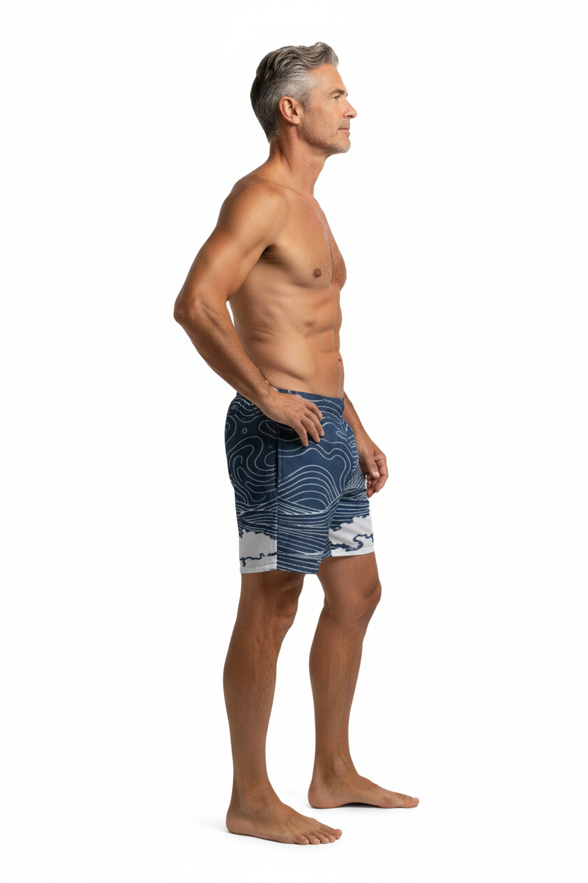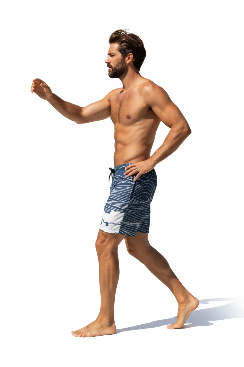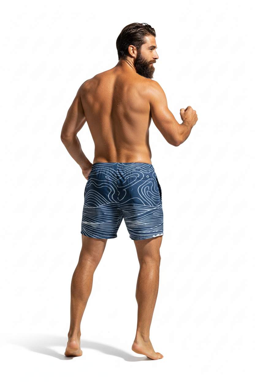 Dive into style with the Ocean Contour Eco Swim Trunks. Featuring an artistic topographic wave pattern in deep navy and white, these eco-friendly recycled swim trunks bring a unique coastal aesthetic to every beach day and pool session.