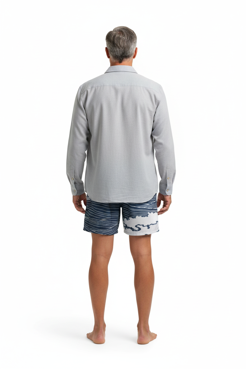 Whether you're catching waves, lounging poolside, or pairing with your favorite button-up for a beach-to-bar look, these versatile swim trunks deliver comfort and coastal sophistication. The artistic wave contour pattern makes a statement while the premium recycled construction supports a more sustainable future.