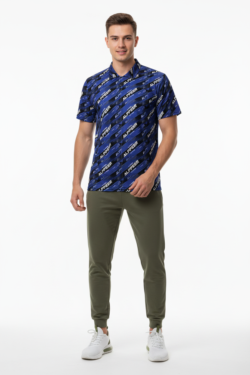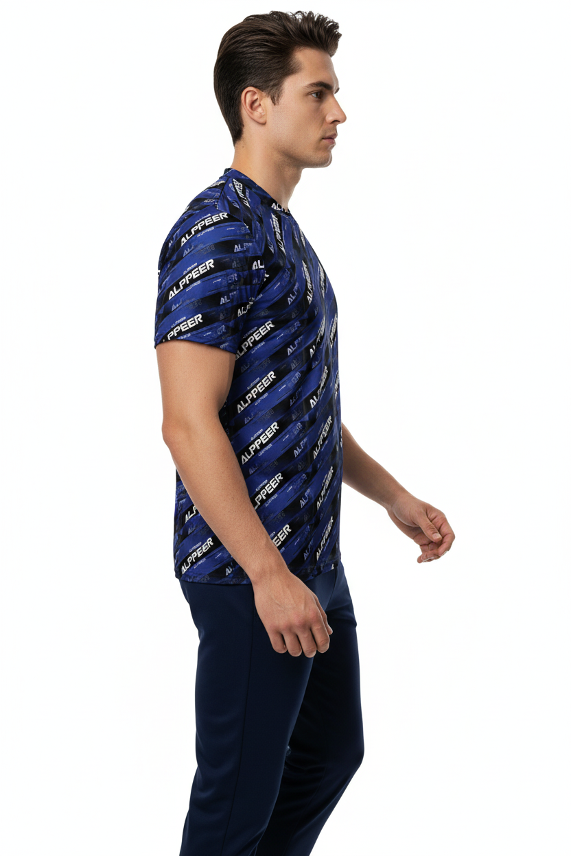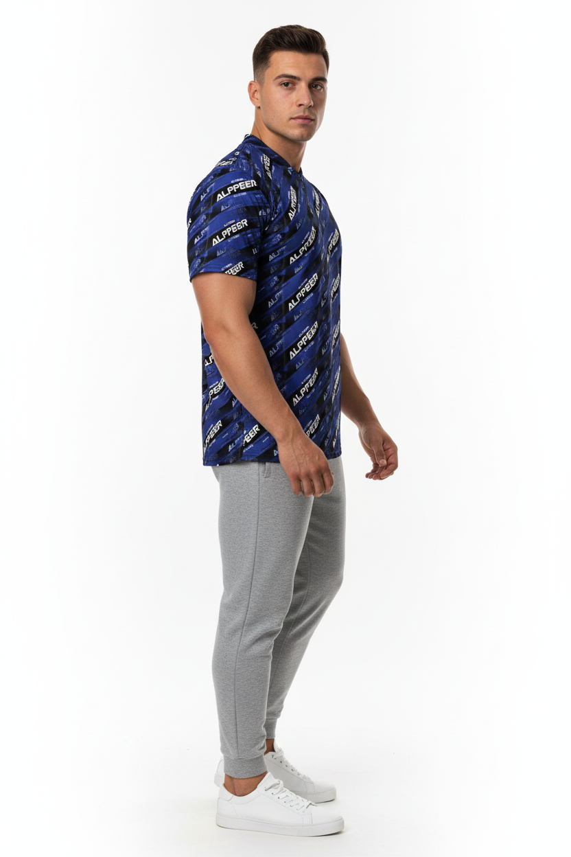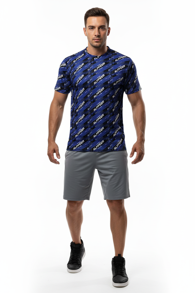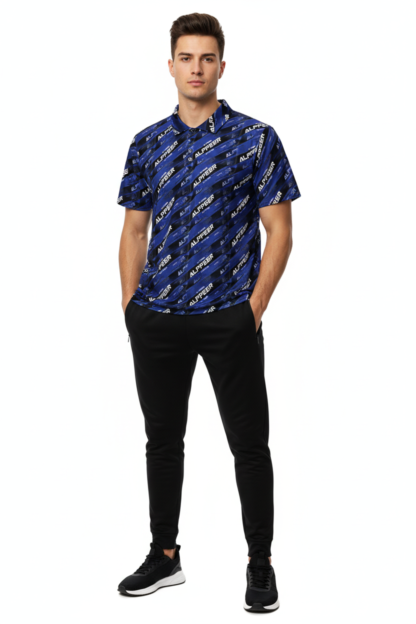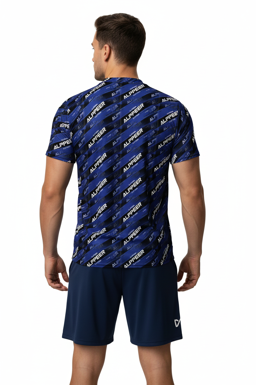 Dominate your game with the ALPPEER Performance Sports Jersey, featuring a bold diagonal branding pattern in navy blue that makes a powerful statement on and off the field. Made from 100% recycled polyester, this premium sports jersey combines eco-conscious design with advanced performance technology for athletes who demand the best.
