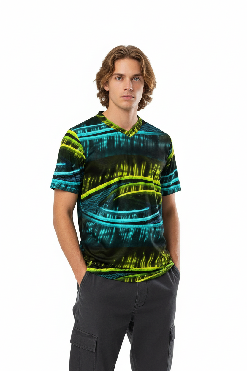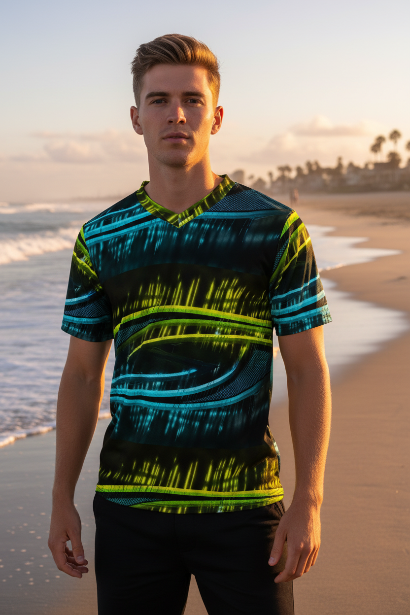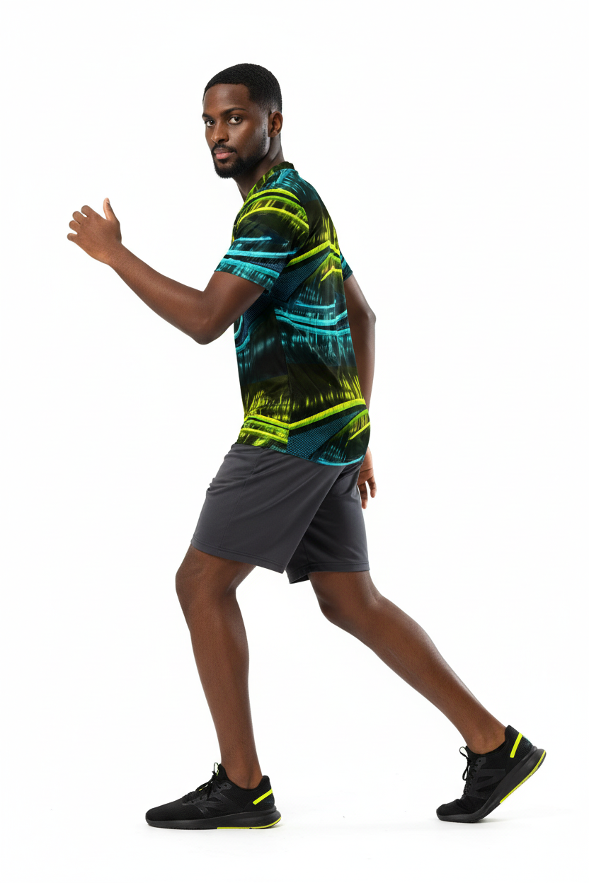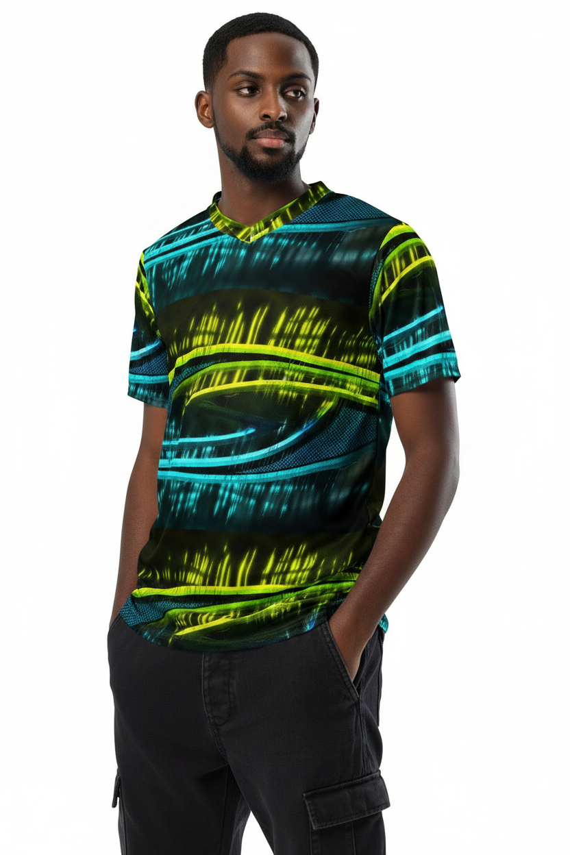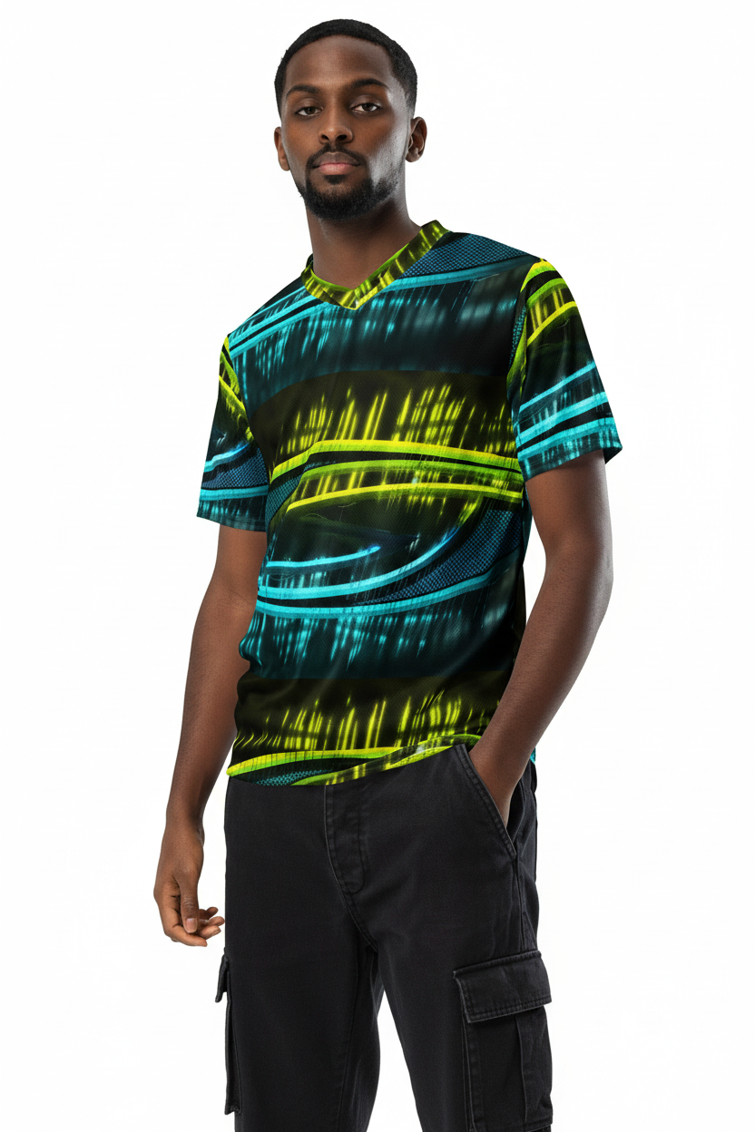 Make a statement on the field, at the gym, or on the streets with the Surfxion Recycled Sports Jersey. This premium performance piece features an electrifying geometric wave pattern in vibrant yellow and cyan that captures the energy of surf culture and modern streetwear.