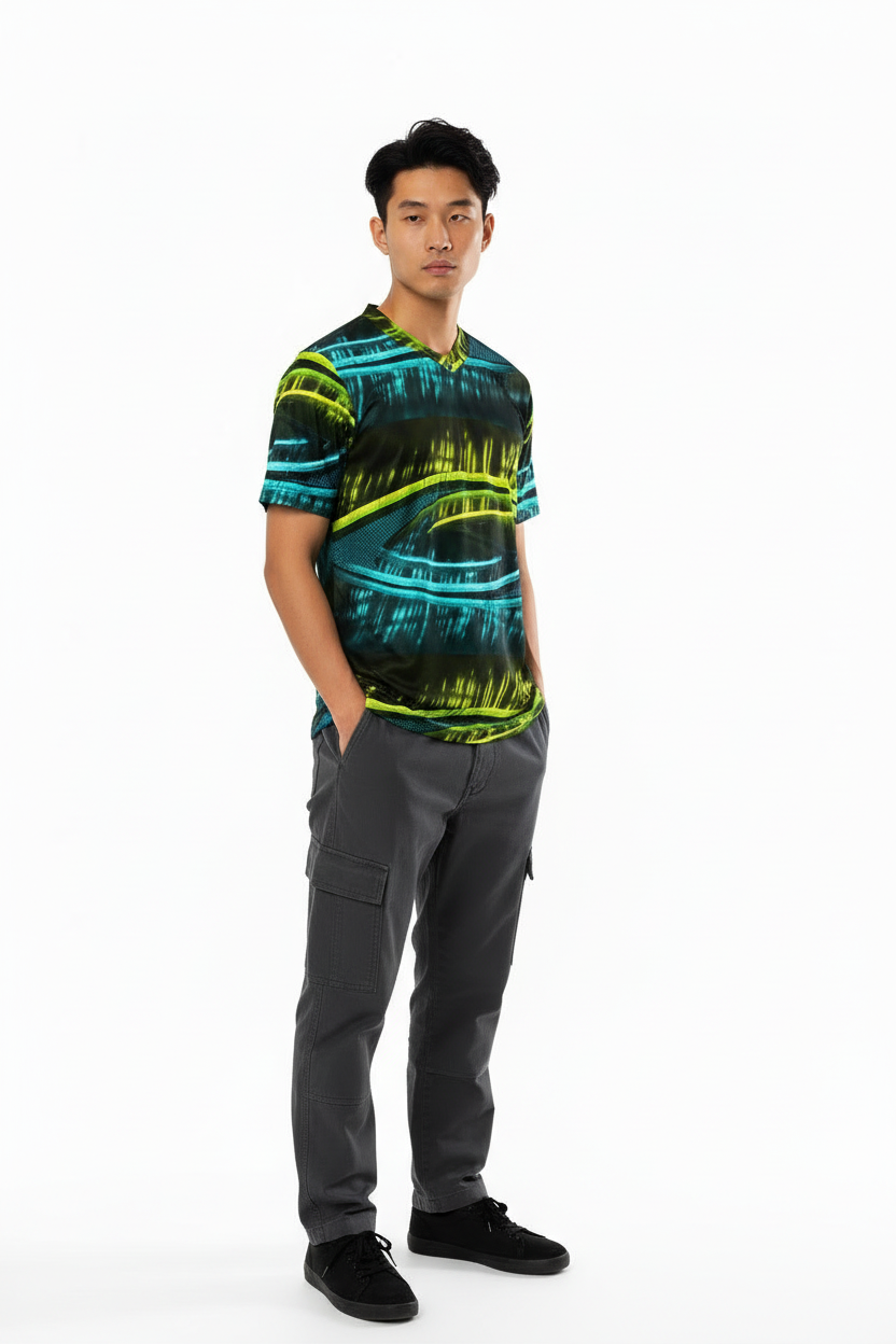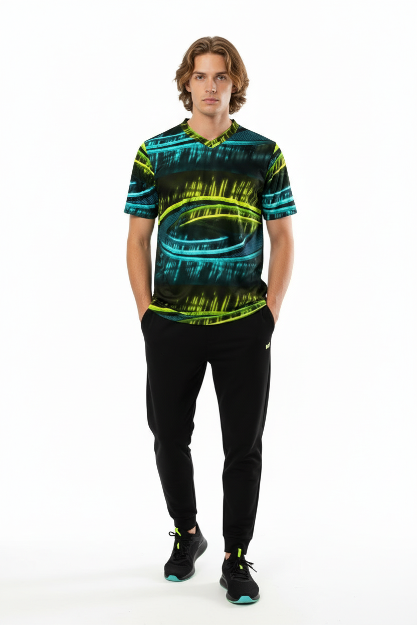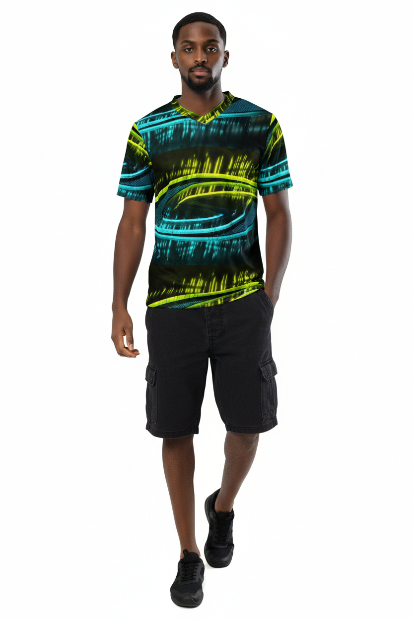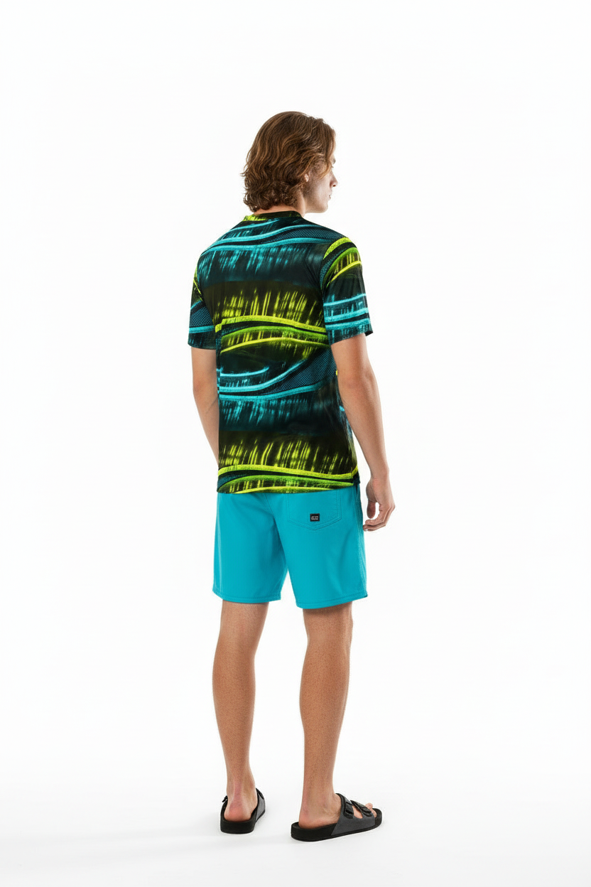 Make a statement on the field, at the gym, or on the streets with the Surfxion Recycled Sports Jersey. This premium performance piece features an electrifying geometric wave pattern in vibrant yellow and cyan that captures the energy of surf culture and modern streetwear.