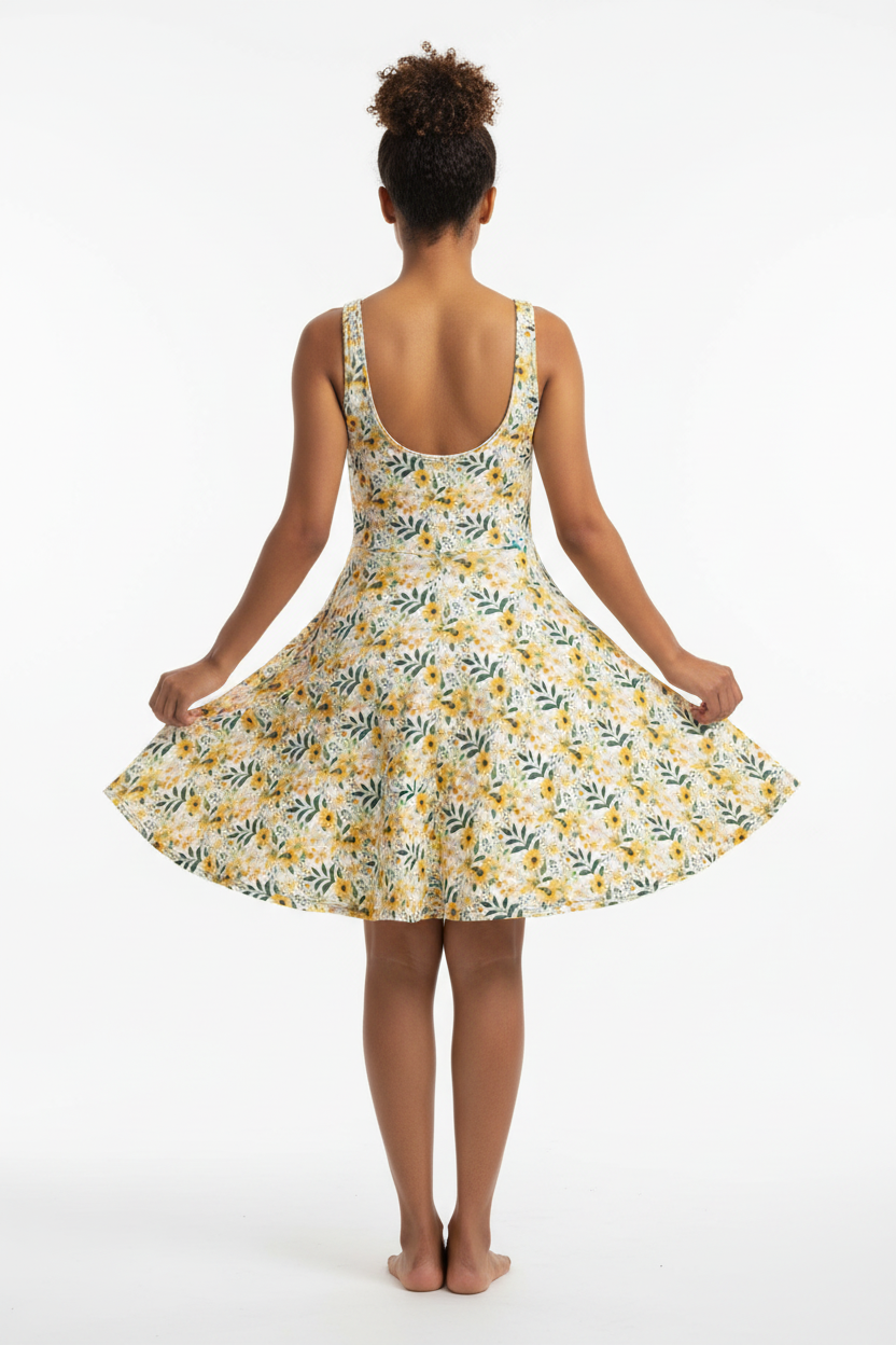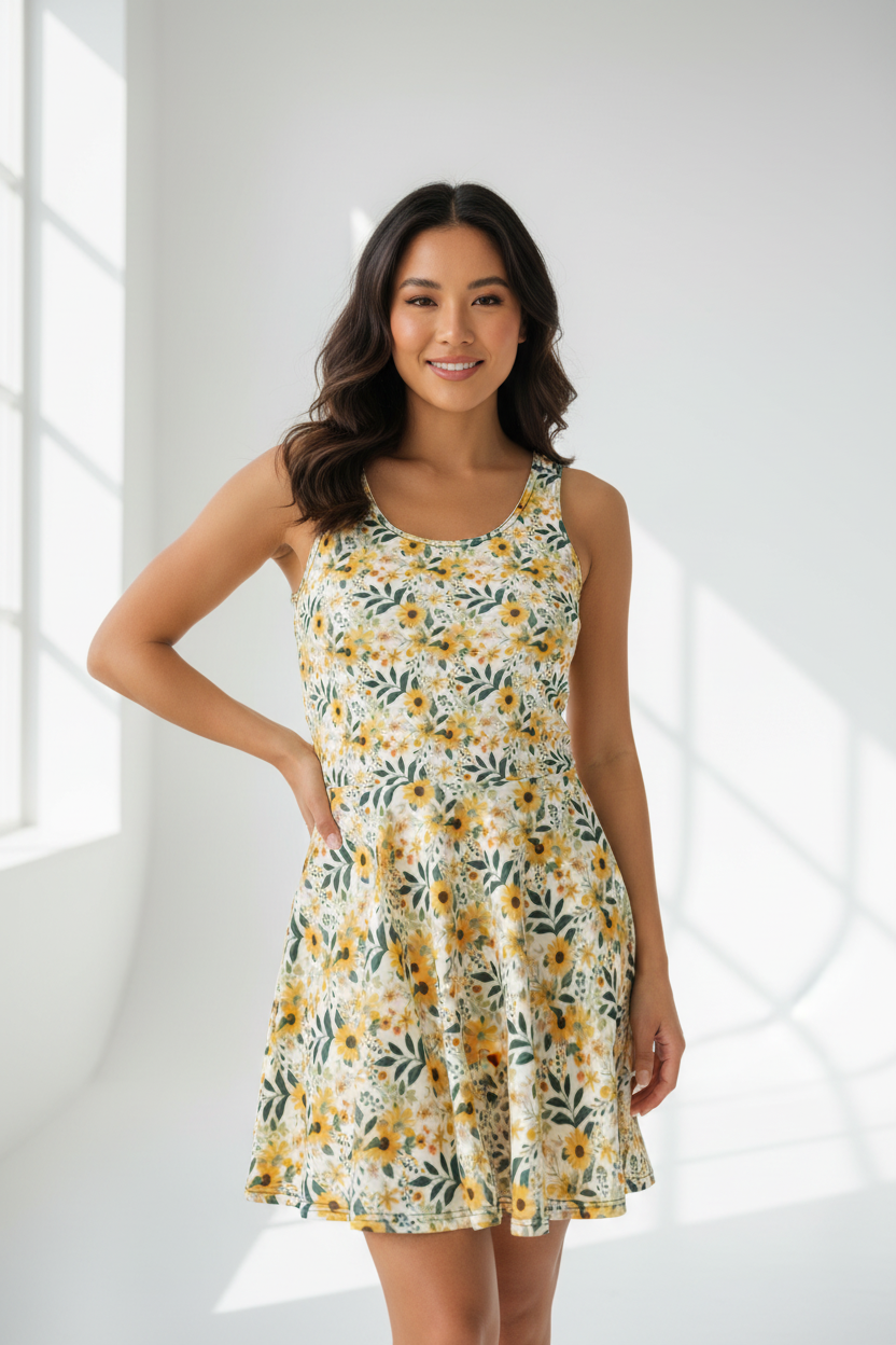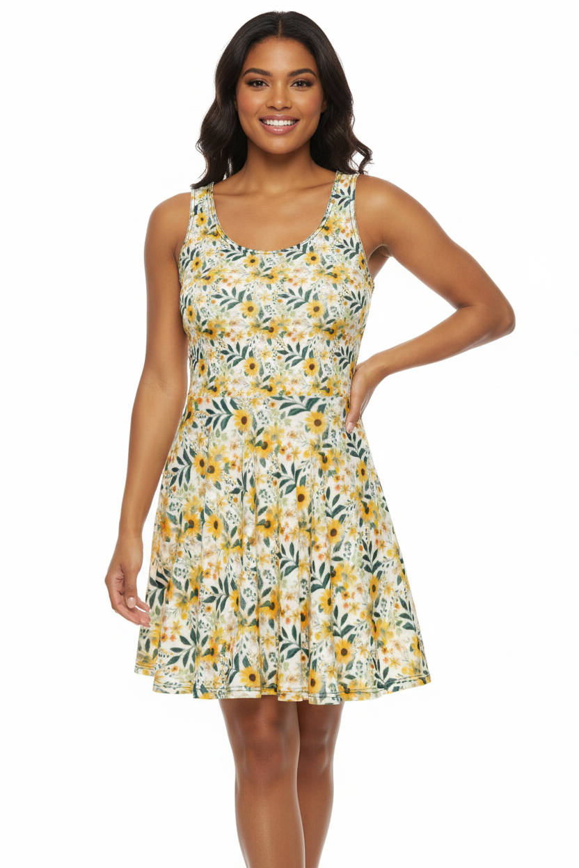 Introducing the Sunflower Garden Skater Dress—where cheerful florals meet flattering silhouette. Featuring a vibrant pattern of golden sunflowers, delicate daisies, and lush green foliage on a soft cream background, this dress is your go-to piece for radiating sunshine wherever you go.