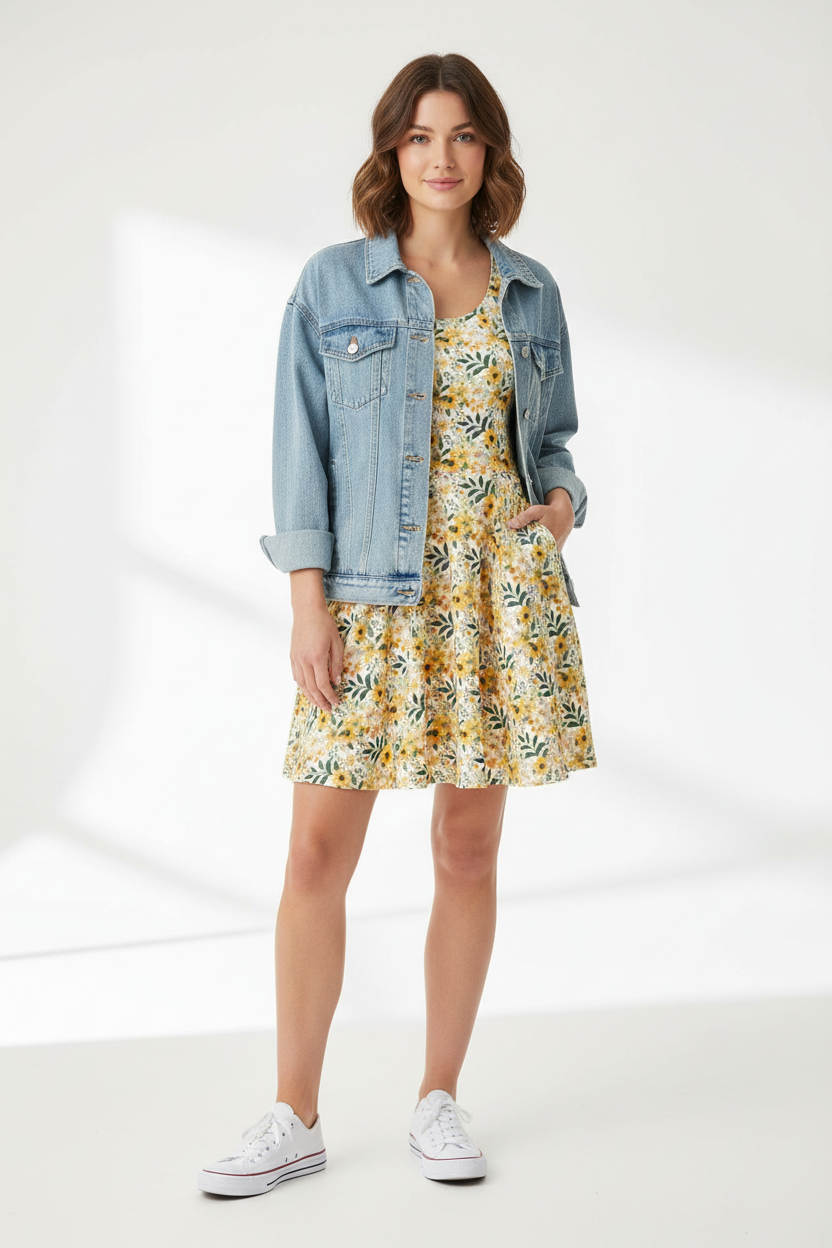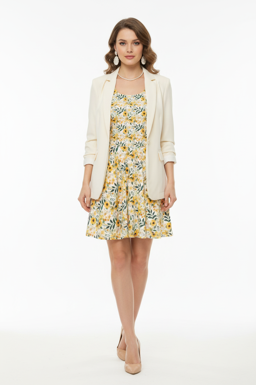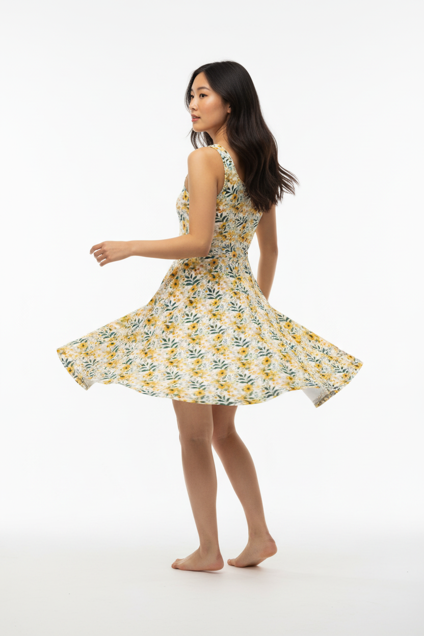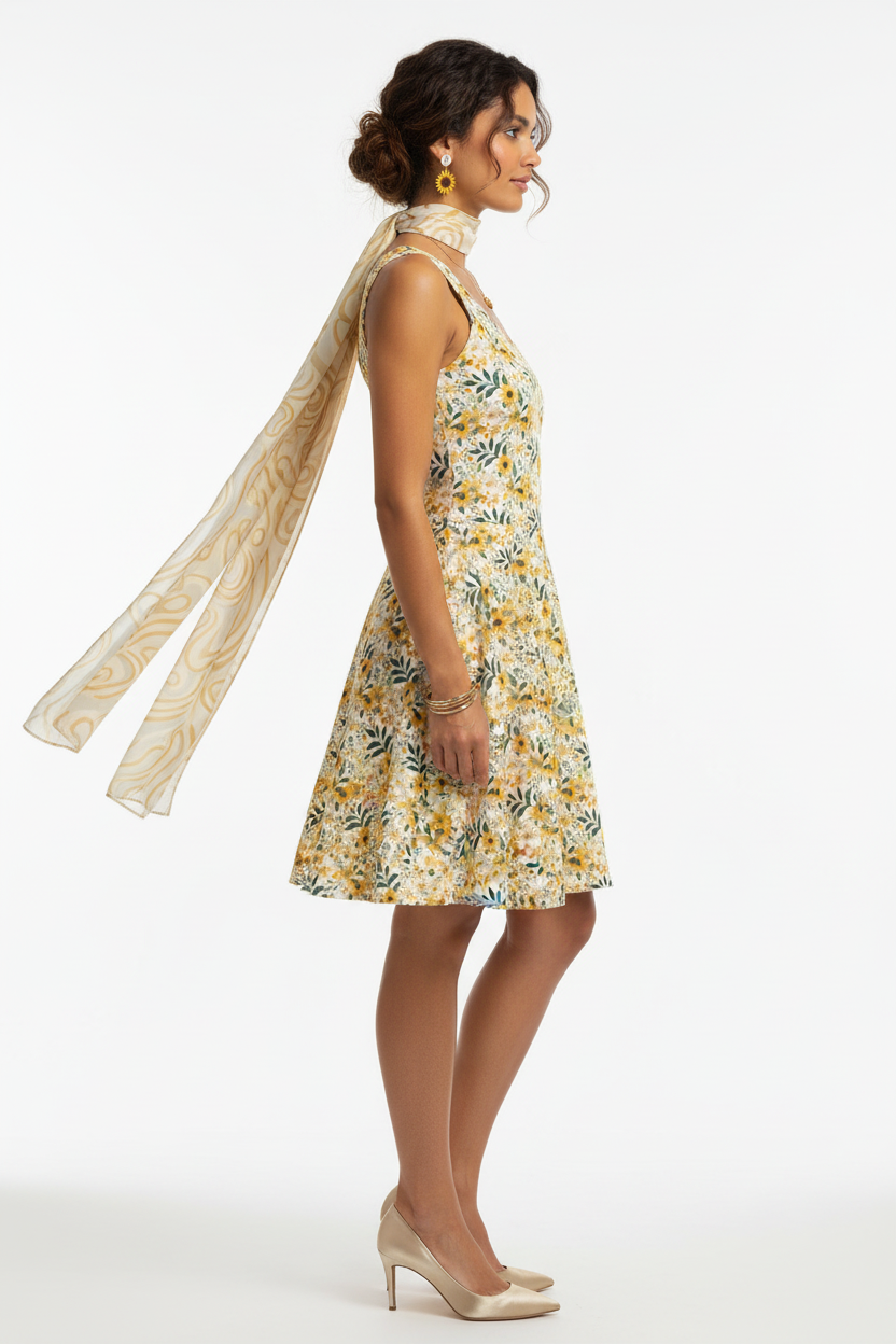 Introducing the Sunflower Garden Skater Dress—where cheerful florals meet flattering silhouette. Featuring a vibrant pattern of golden sunflowers, delicate daisies, and lush green foliage on a soft cream background, this dress is your go-to piece for radiating sunshine wherever you go.