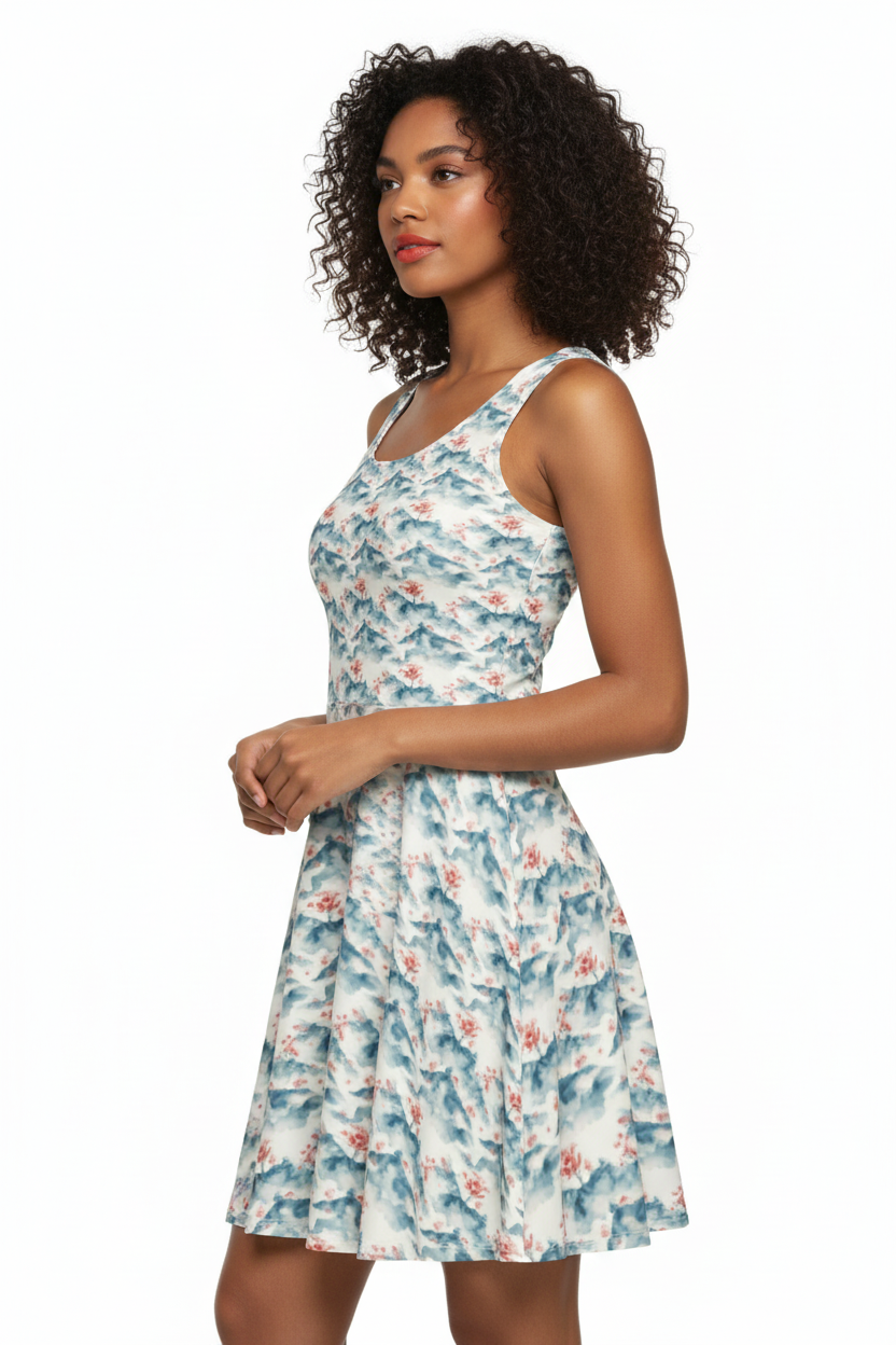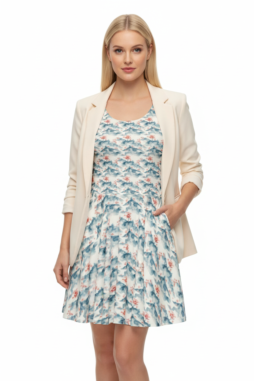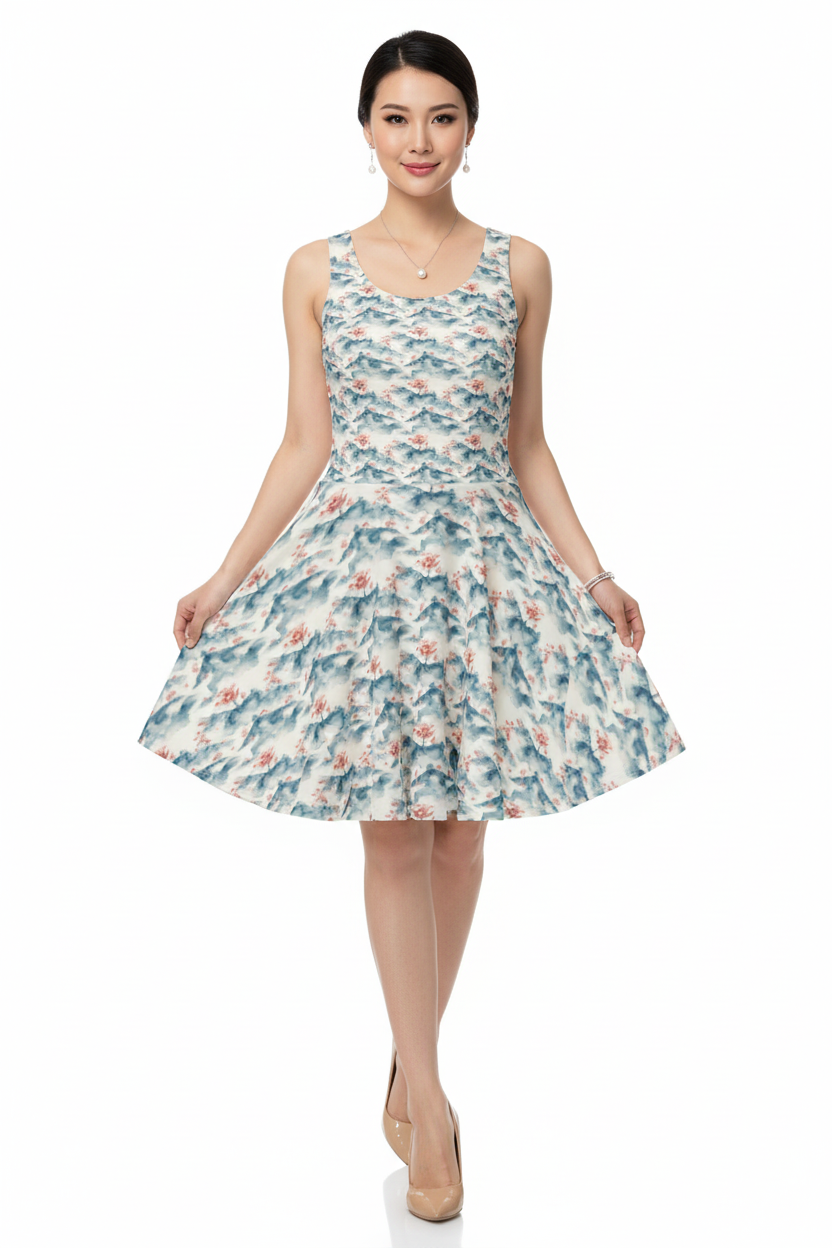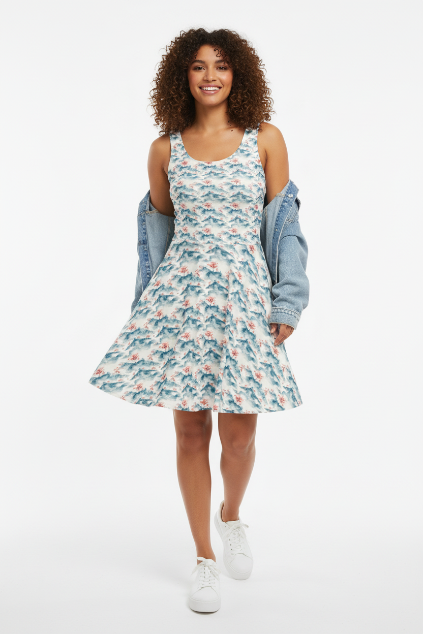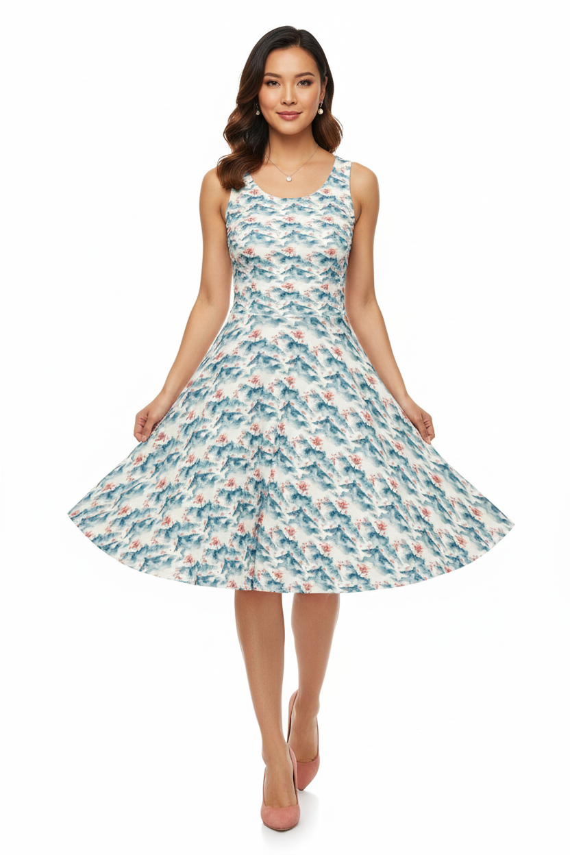 This dress transitions effortlessly from casual daytime to evening events. Pair with sandals and a sun hat for garden parties, add heels and statement jewelry for date nights, or layer with a denim jacket for cooler evenings. The serene watercolor print makes it perfect for spring and summer occasions while the classic skater silhouette keeps it timeless.