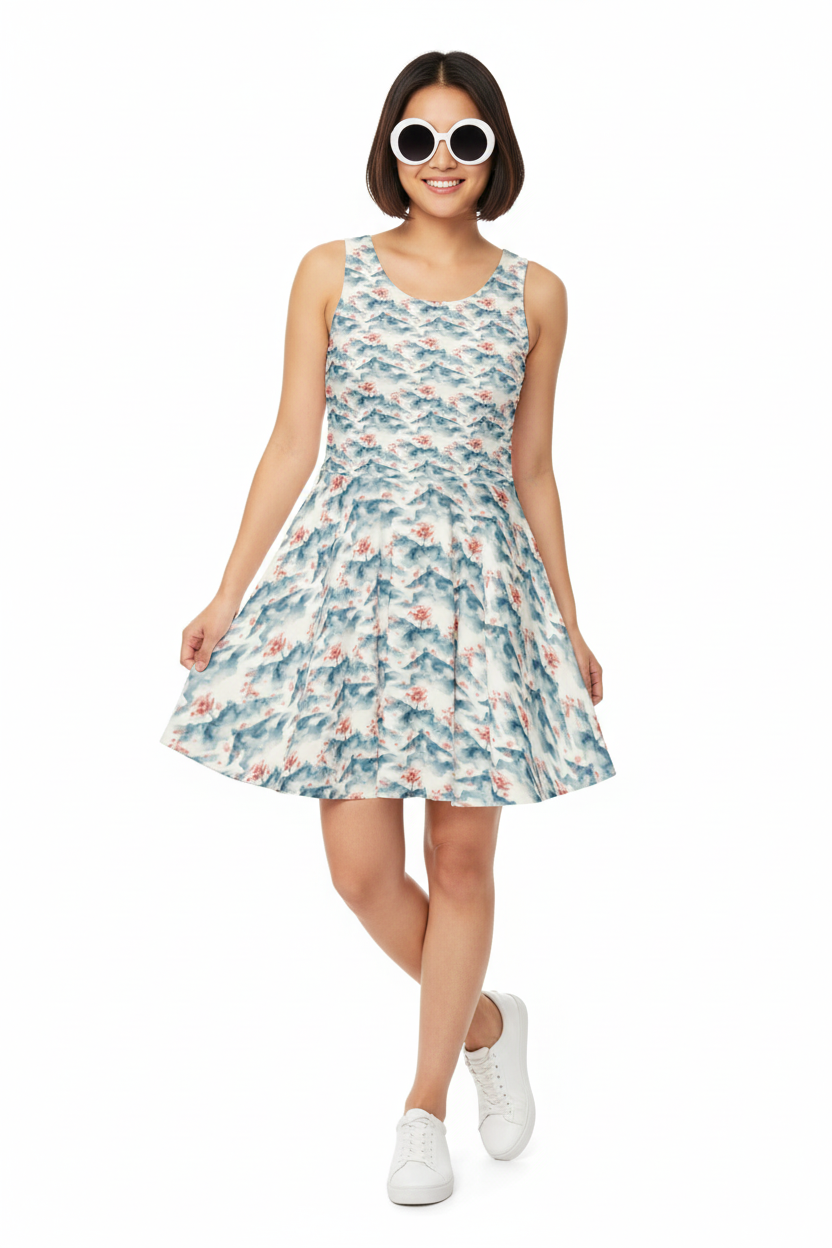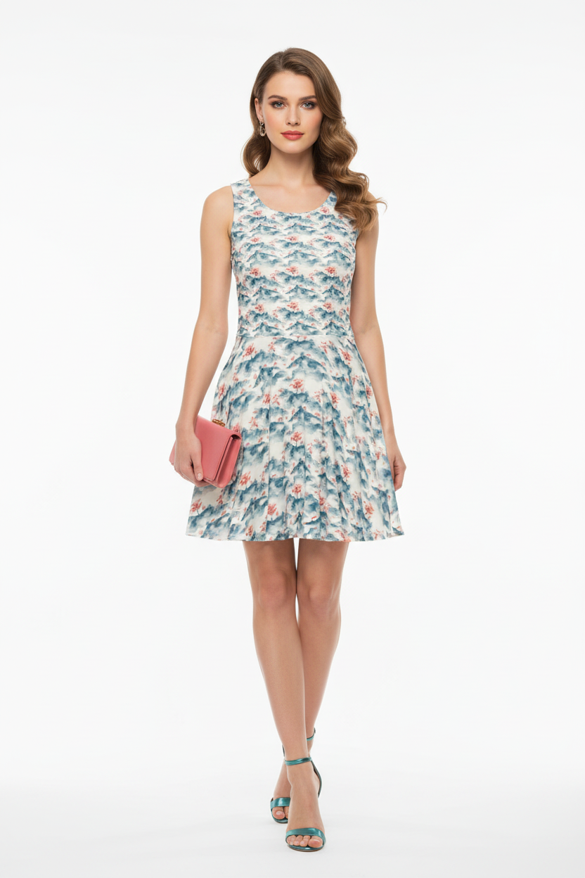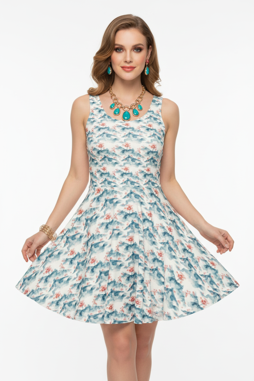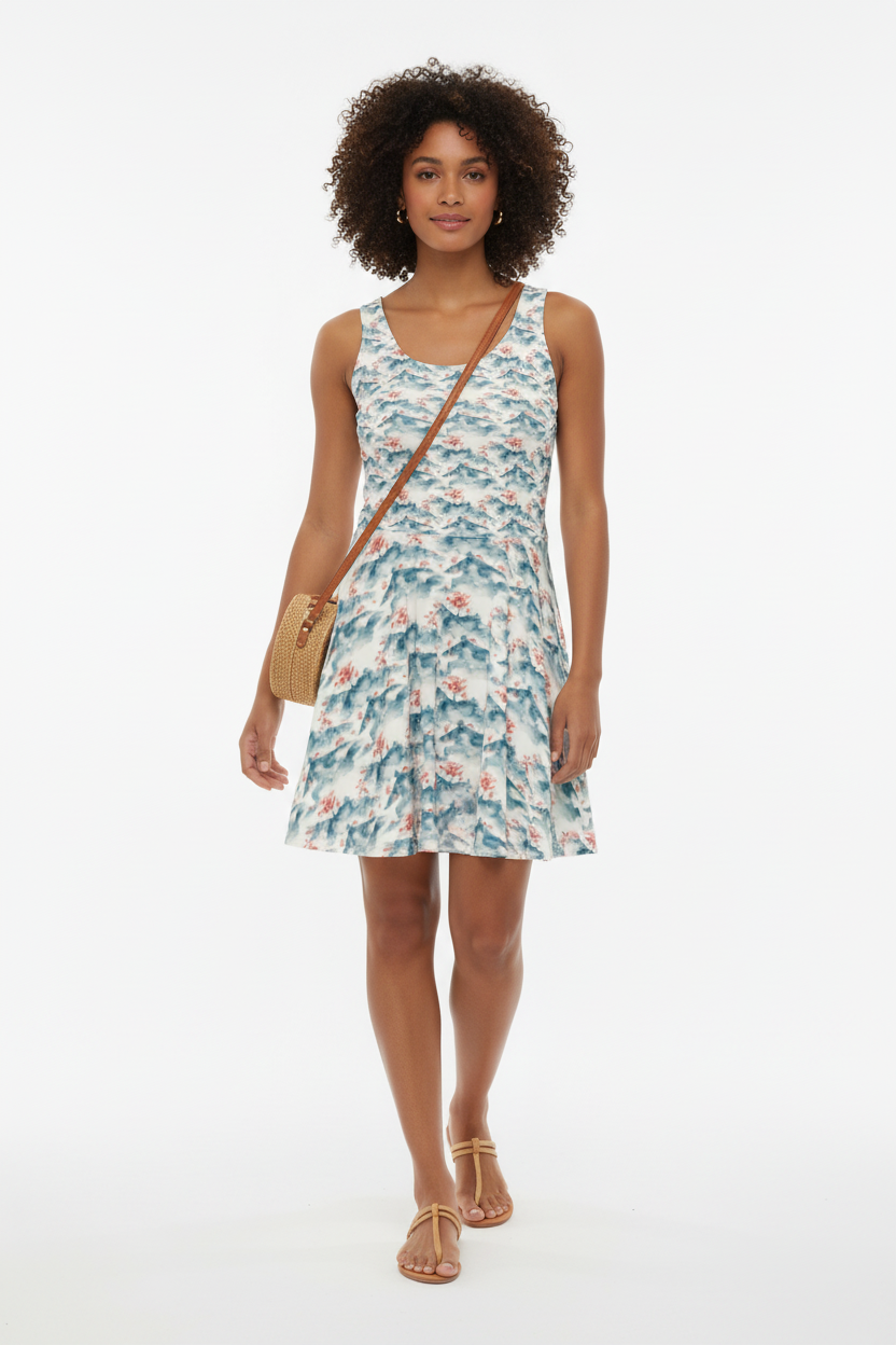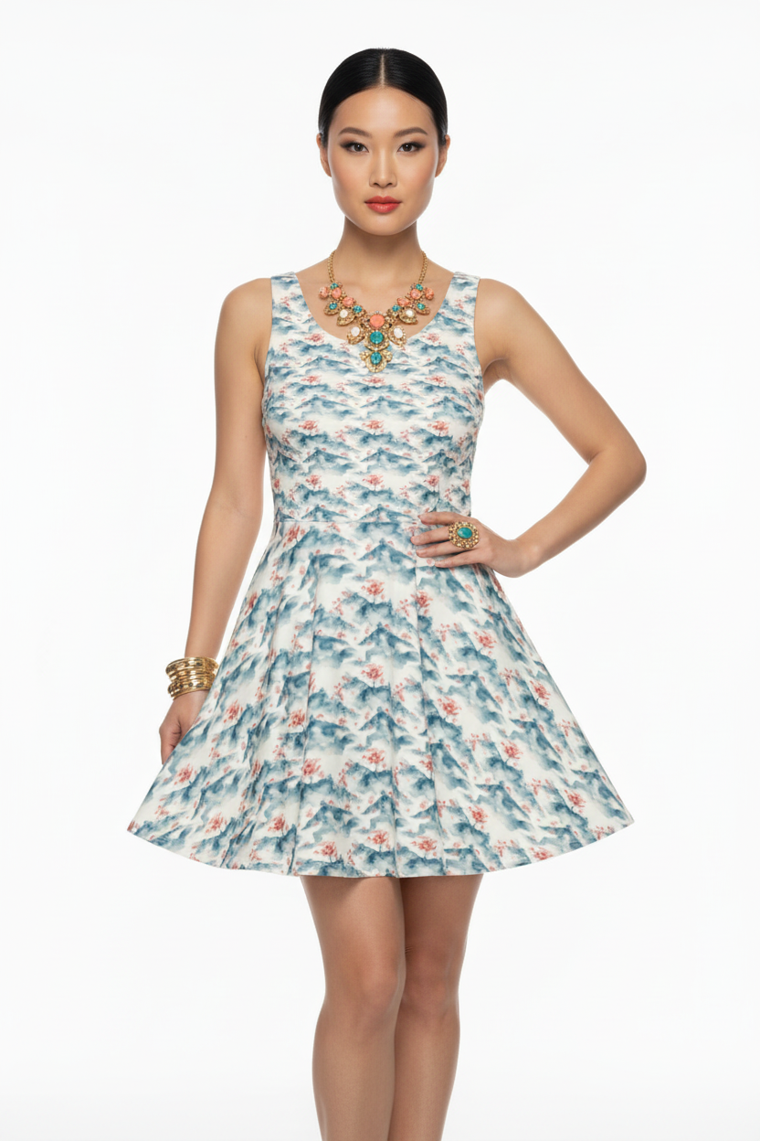 This dress transitions effortlessly from casual daytime to evening events. Pair with sandals and a sun hat for garden parties, add heels and statement jewelry for date nights, or layer with a denim jacket for cooler evenings. The serene watercolor print makes it perfect for spring and summer occasions while the classic skater silhouette keeps it timeless.