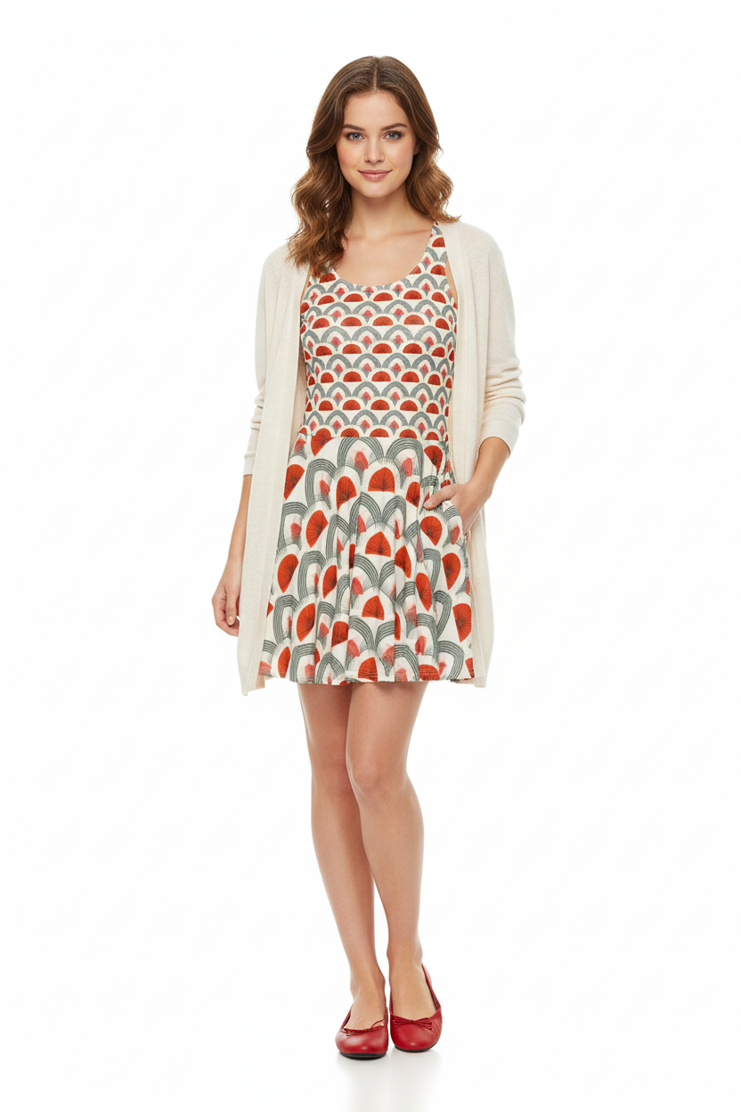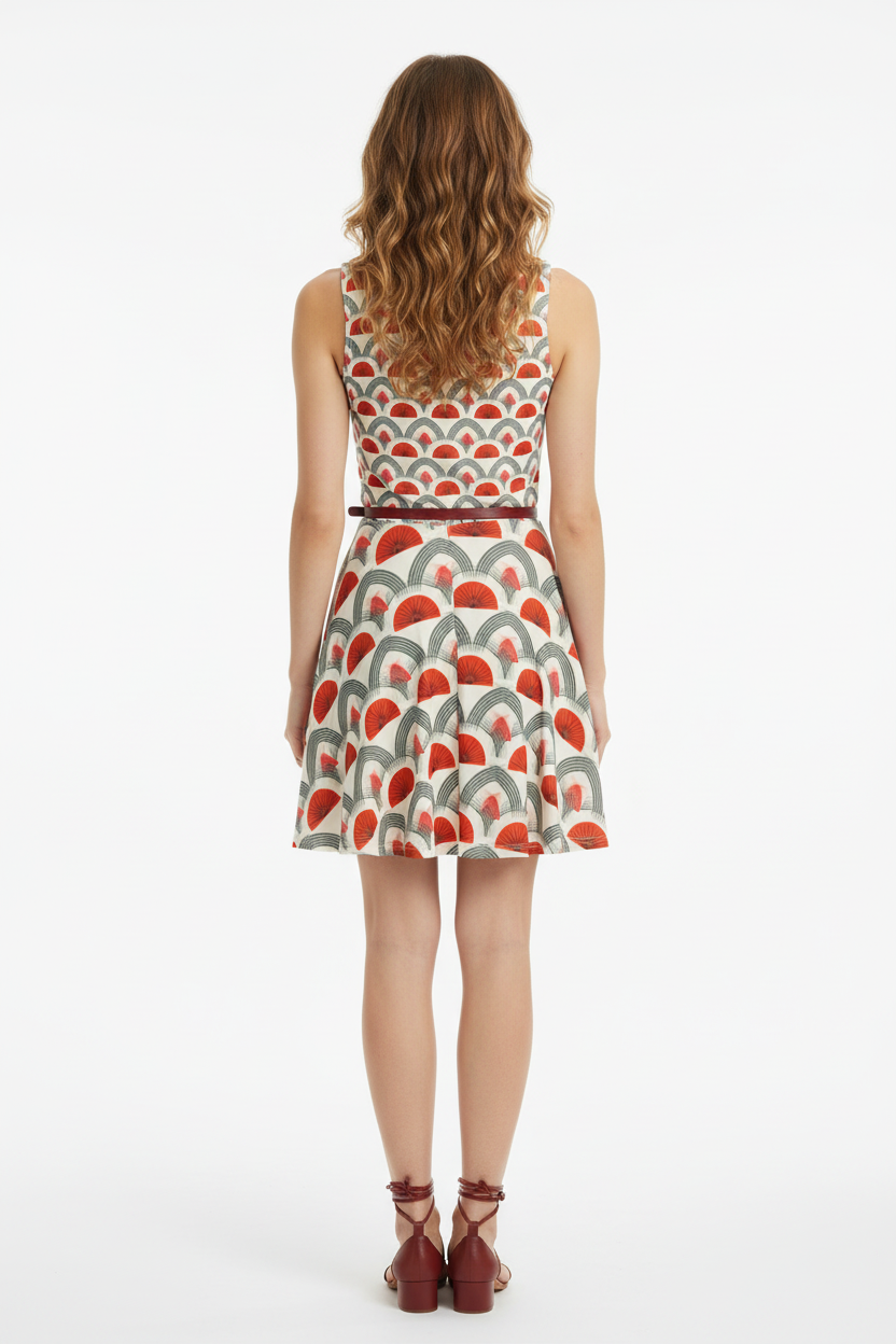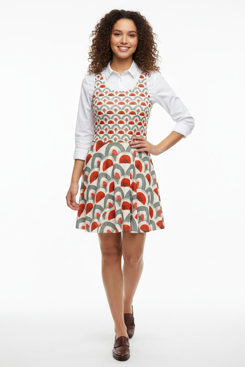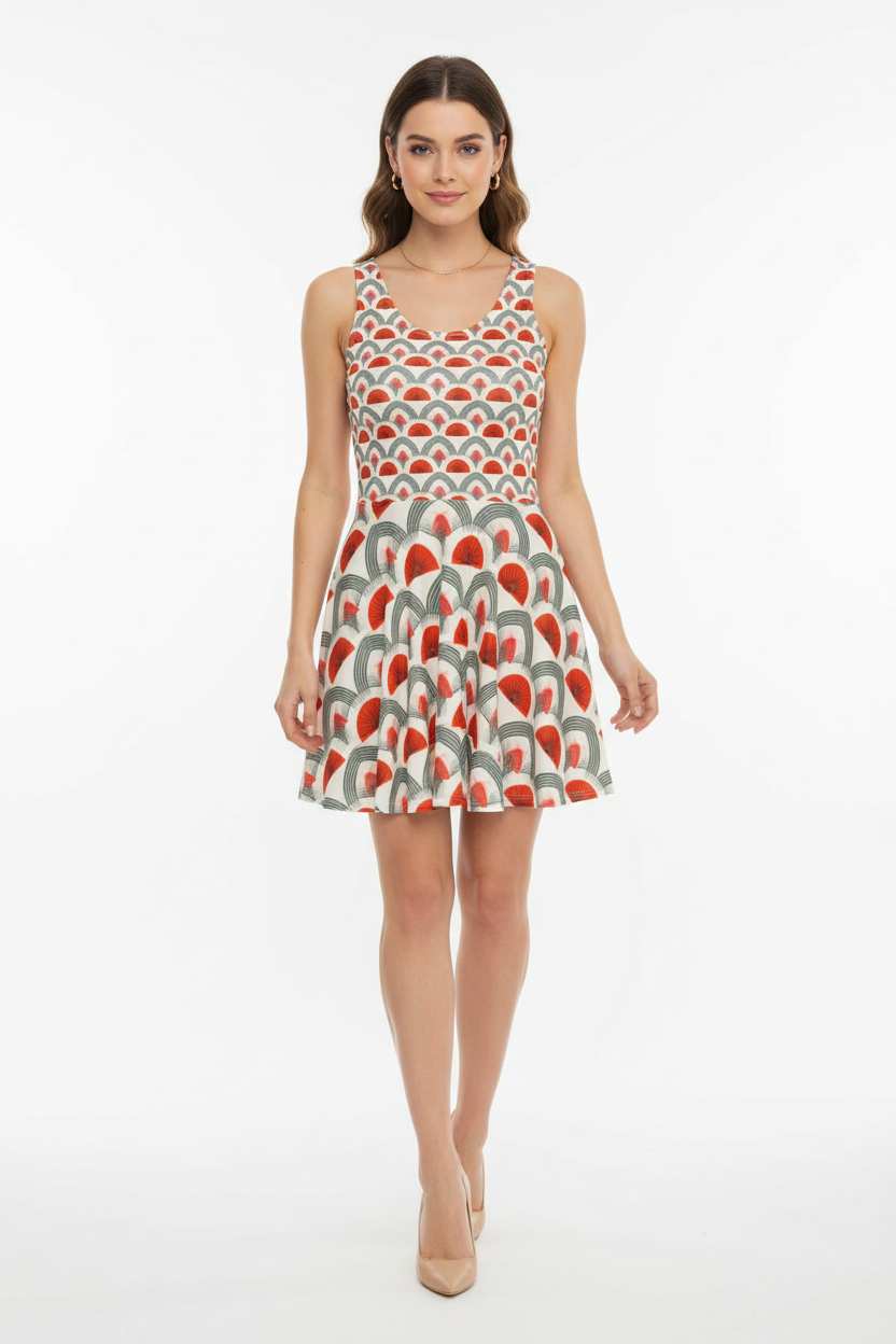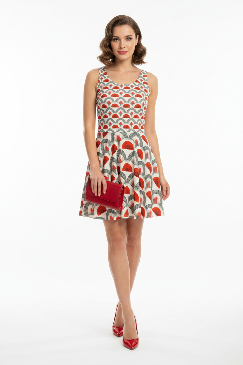 Step into timeless sophistication with the Rouge Moderne Fit & Flare Dress, where vintage art deco elegance meets contemporary style. The striking pattern features bold red semicircles and graceful gray arches on a cream canvas, creating a geometric masterpiece that commands attention with refined confidence.
