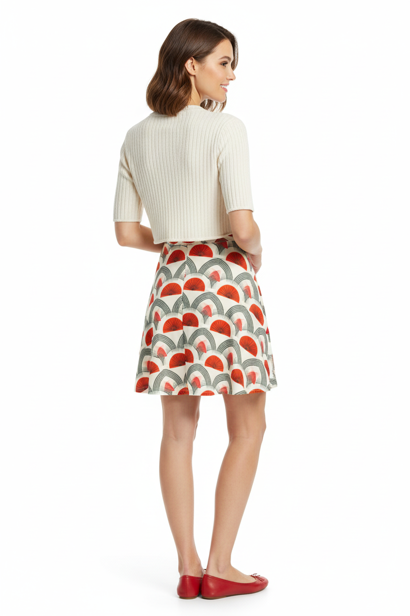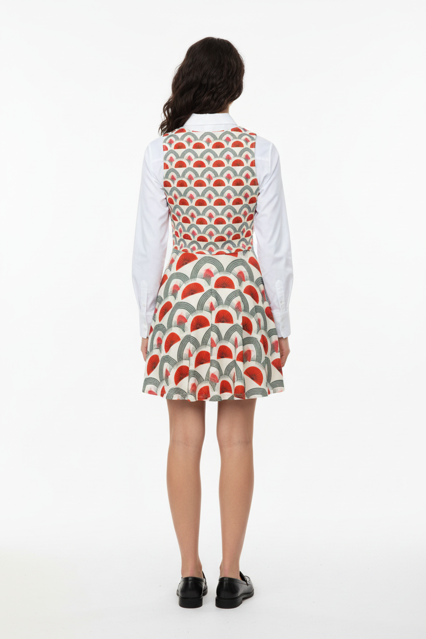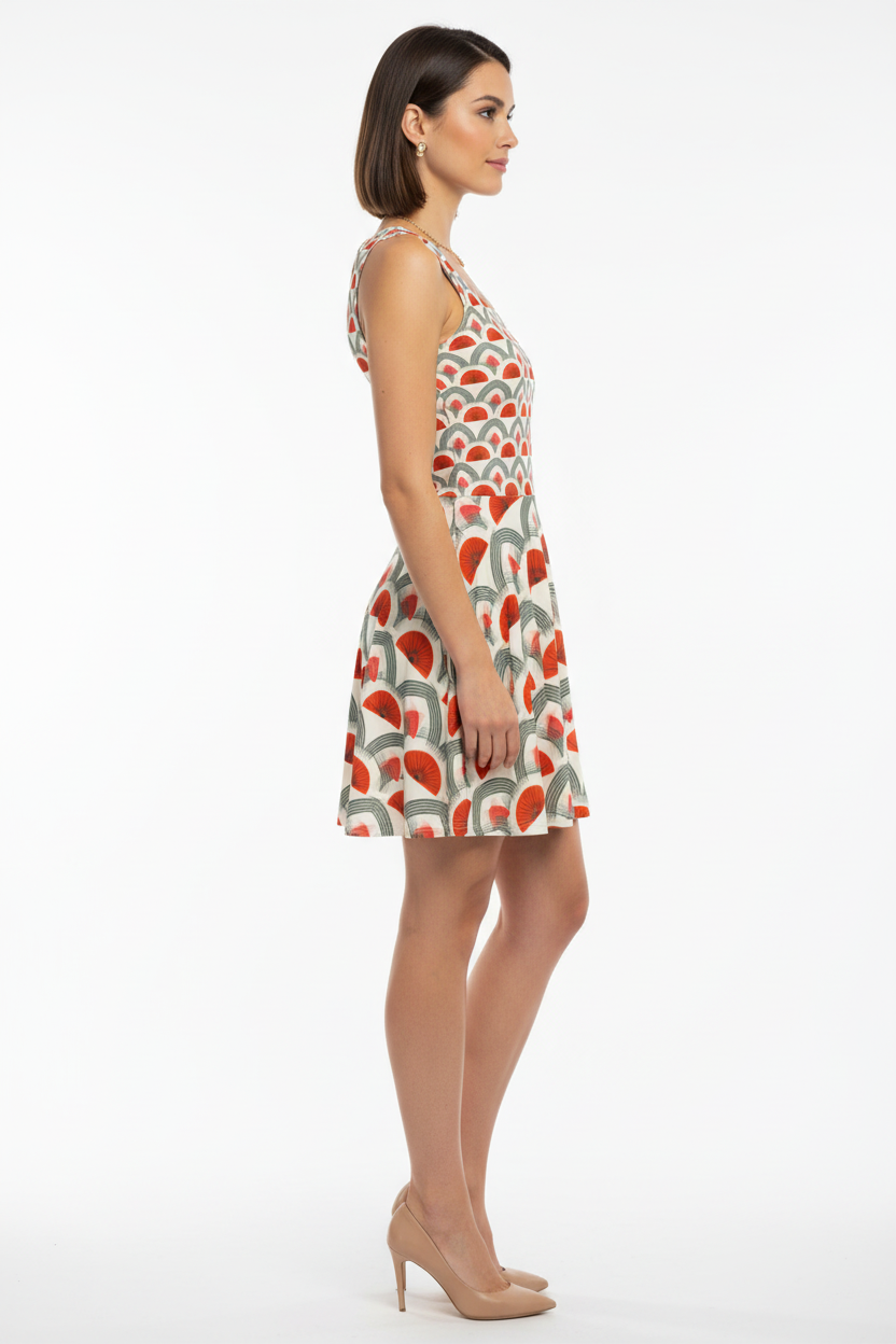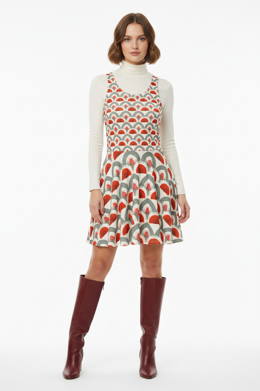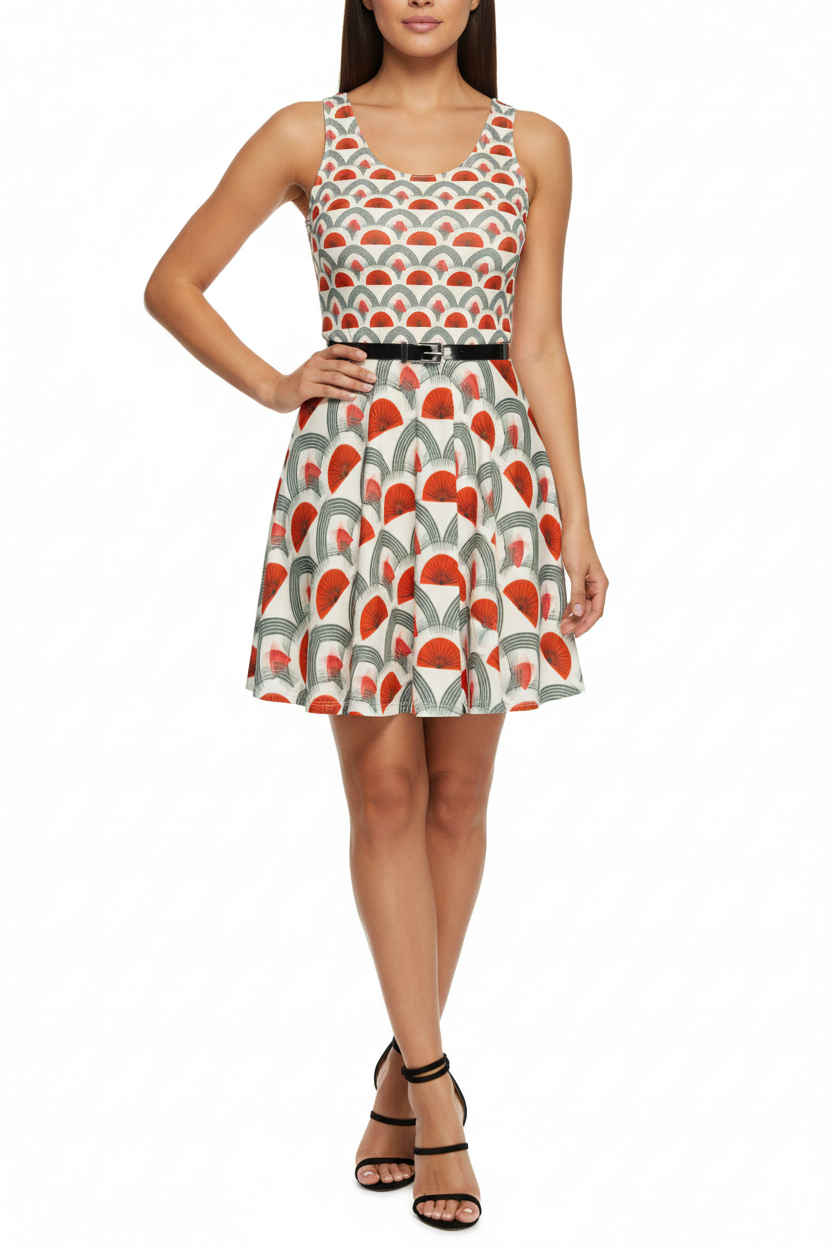 Step into timeless sophistication with the Rouge Moderne Fit & Flare Dress, where vintage art deco elegance meets contemporary style. The striking pattern features bold red semicircles and graceful gray arches on a cream canvas, creating a geometric masterpiece that commands attention with refined confidence.