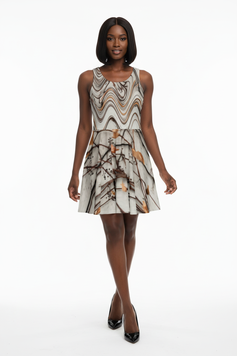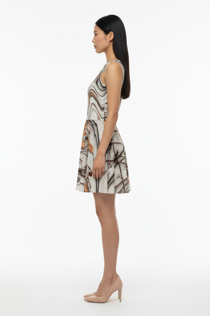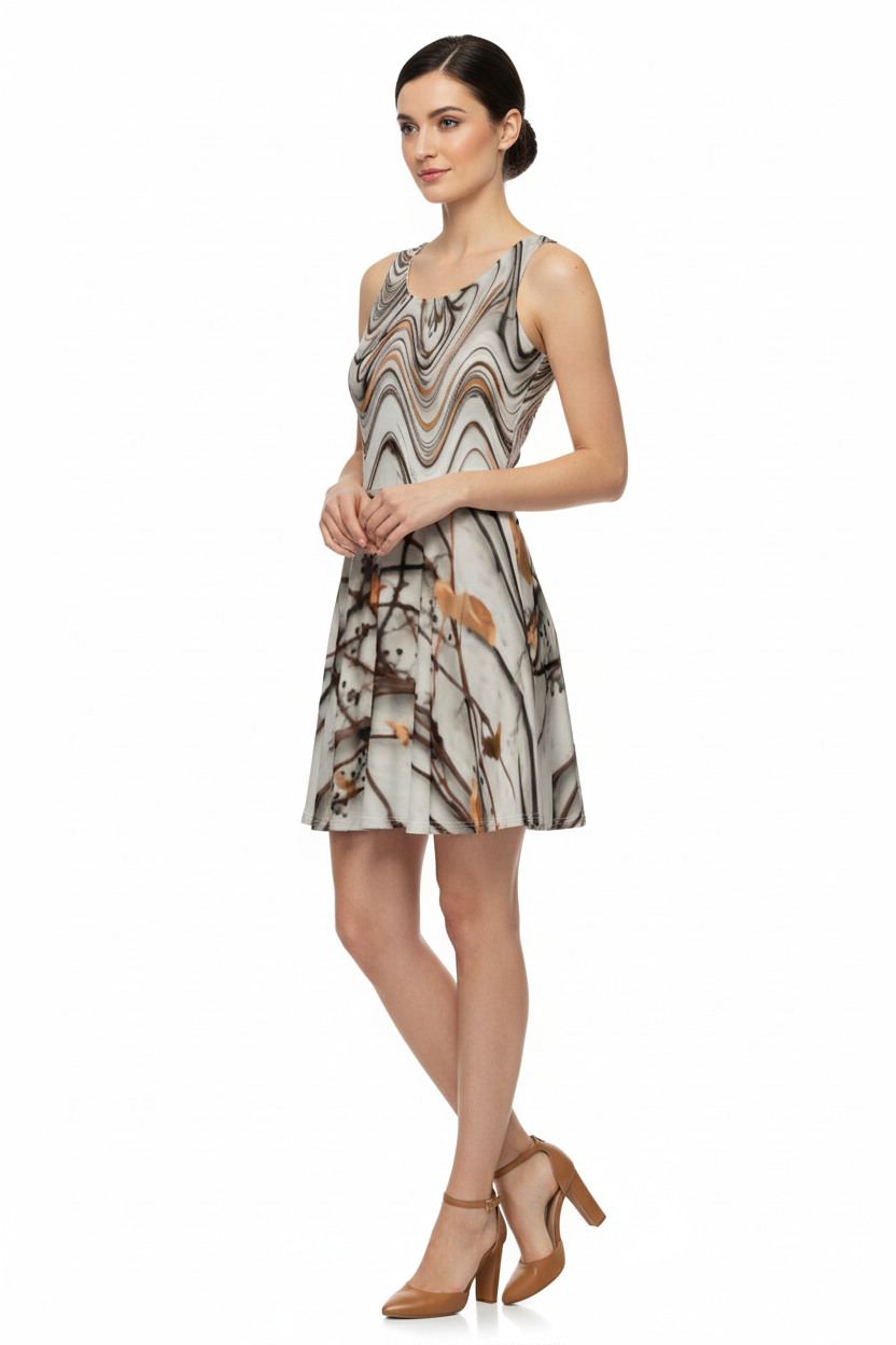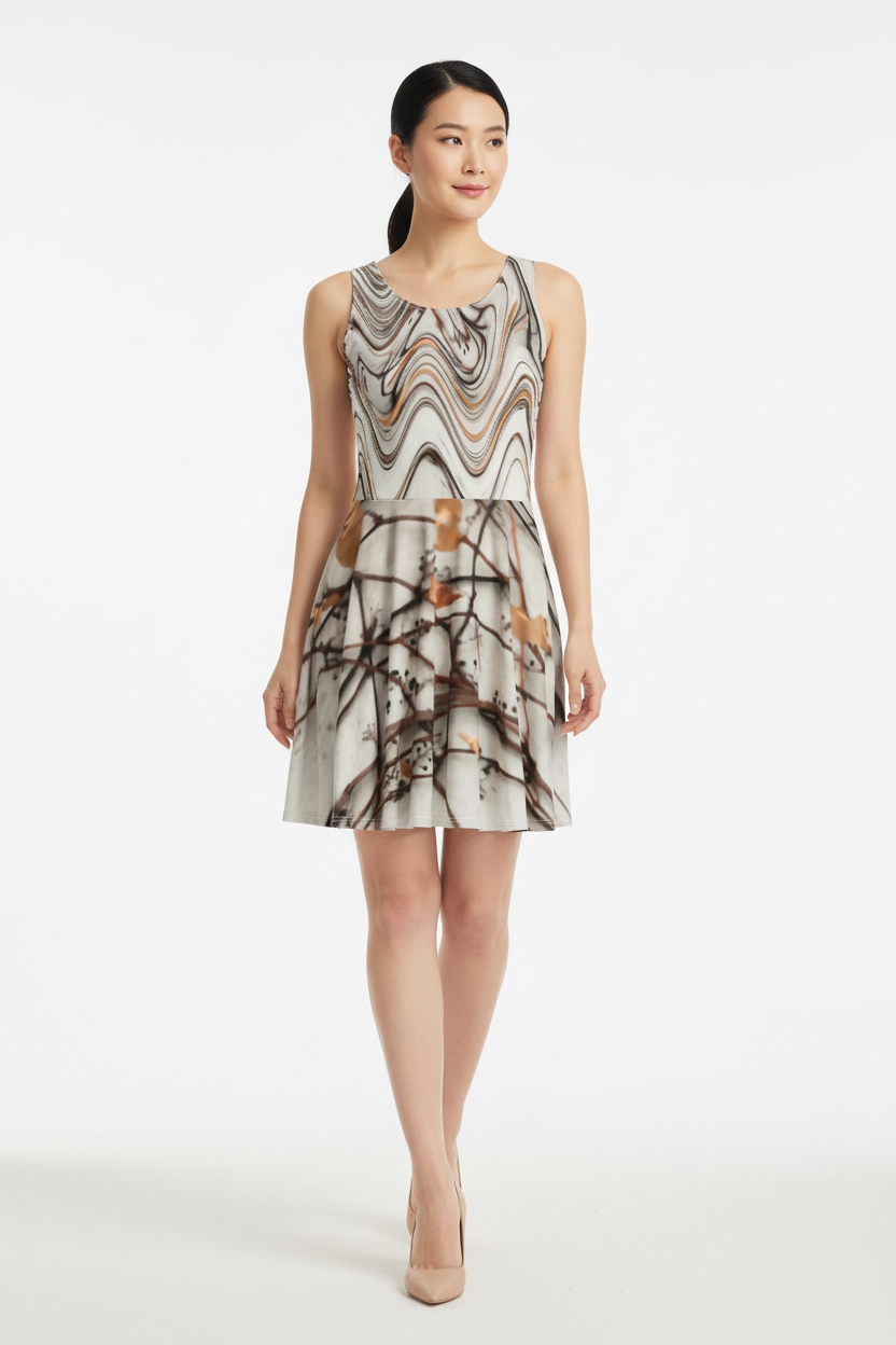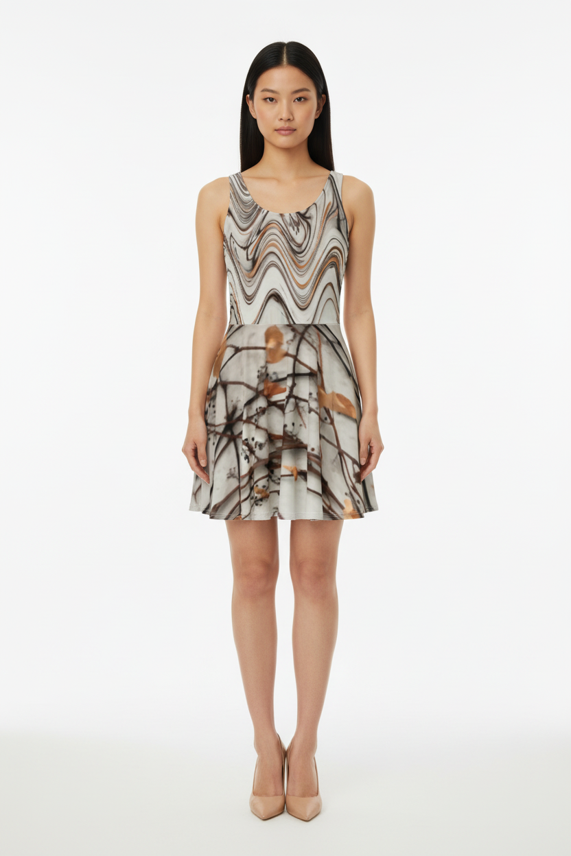Step into effortless elegance with the Marbled Reverie Dress—where artistry meets versatility. This stunning piece features an abstract marbled wave pattern in soft neutral tones across the bodice, seamlessly transitioning into a delicate botanical floral print on the flared skirt. It's the dress that moves with you, from gallery openings to garden brunches, coffee dates to rooftop gatherings.