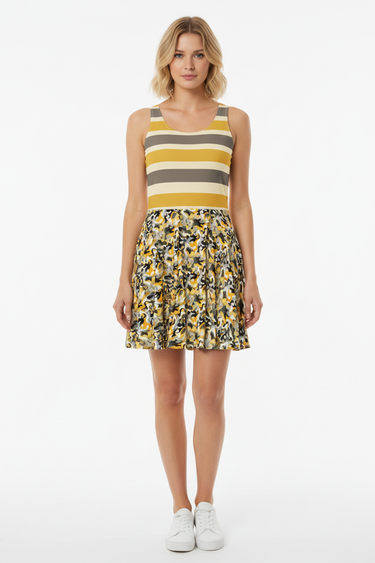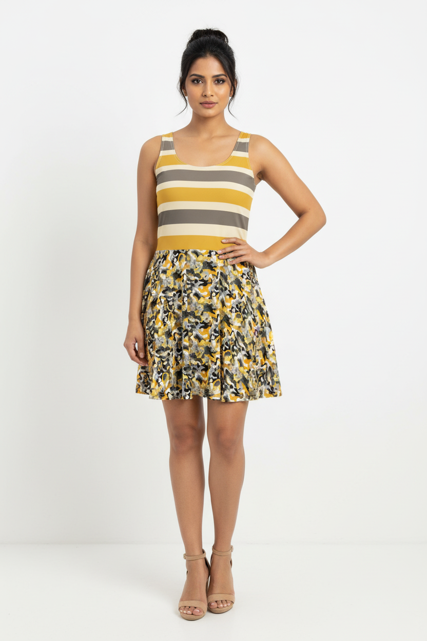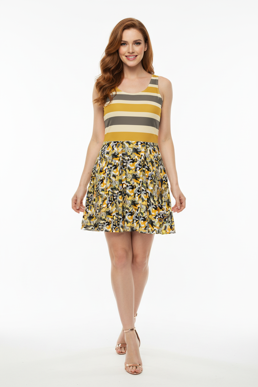 Make a bold statement with the Golden Stripe Camo Skater Dress. This eye-catching piece features a unique color-block design—charcoal gray, cream, and golden mustard stripes on the bodice transition into a vibrant yellow and gray camo print skirt. With a flattering fit-and-flare silhouette, it's the perfect dress for the woman who loves to stand out with confidence and style.