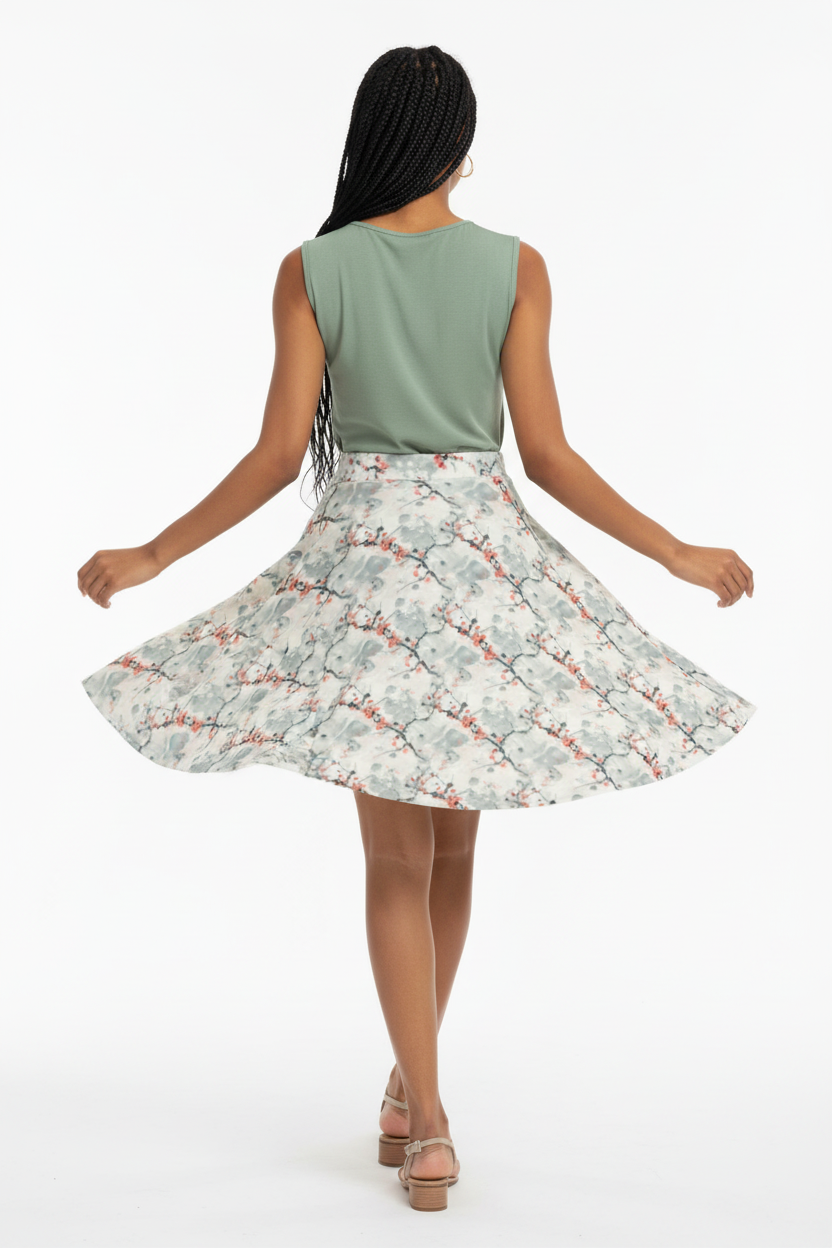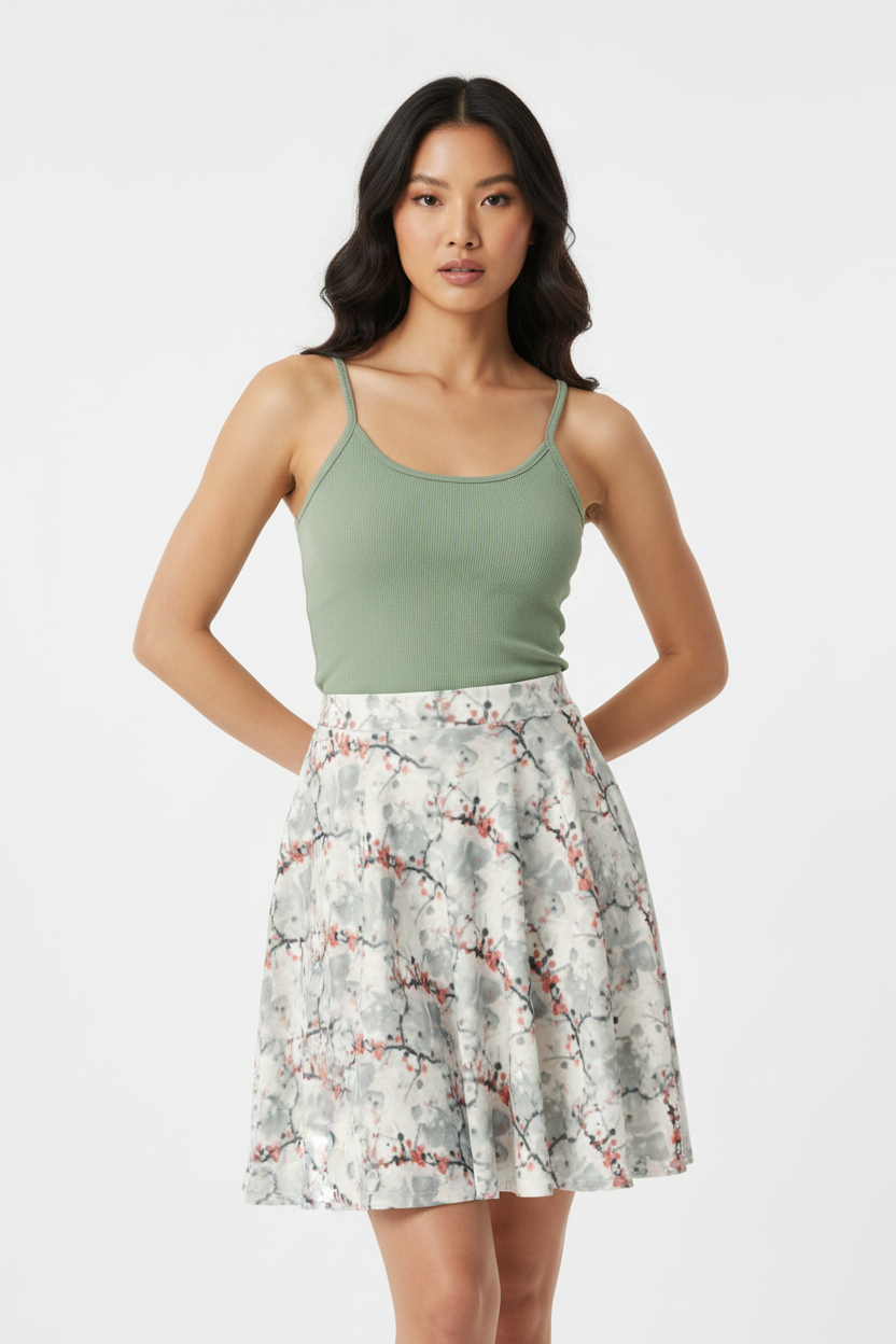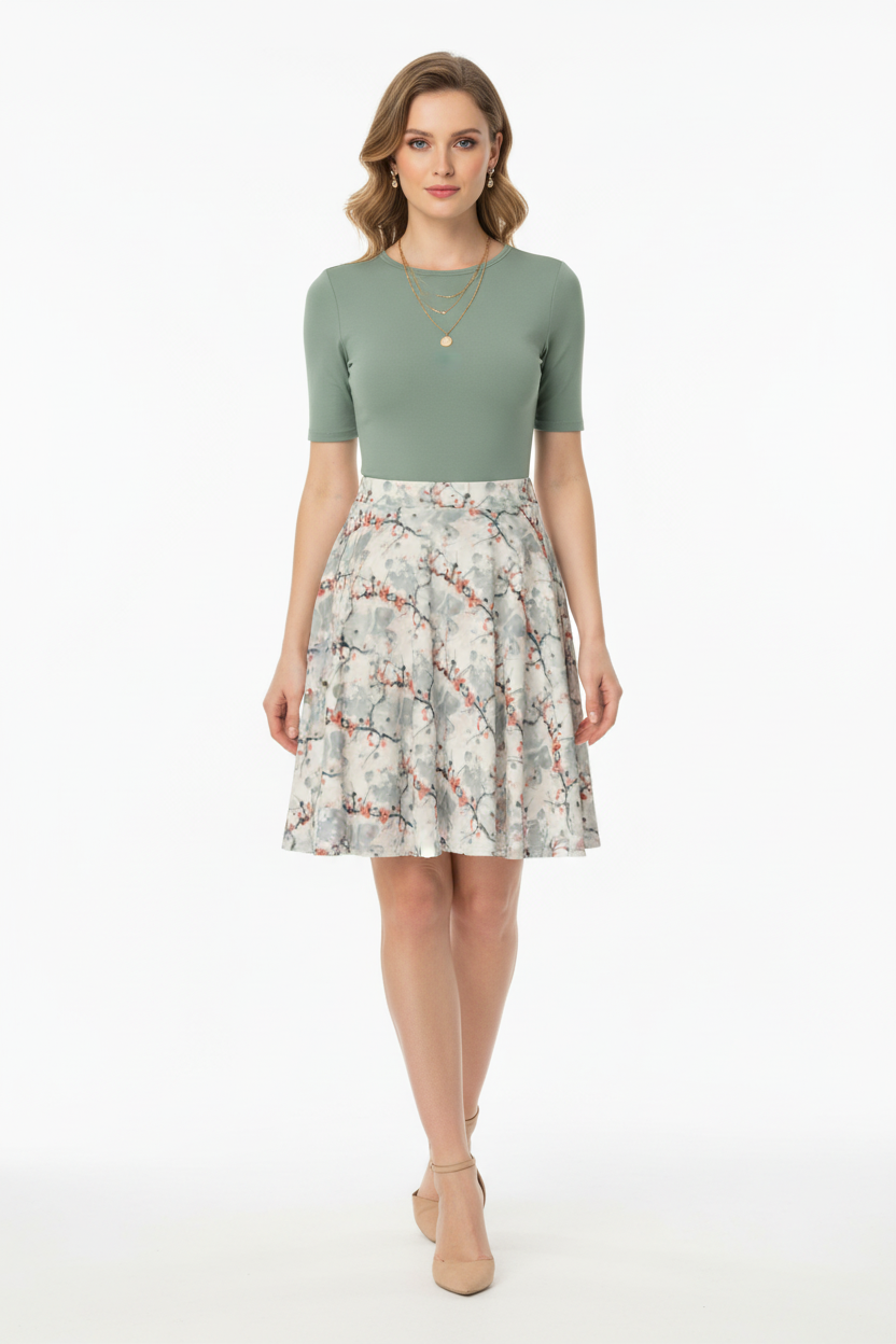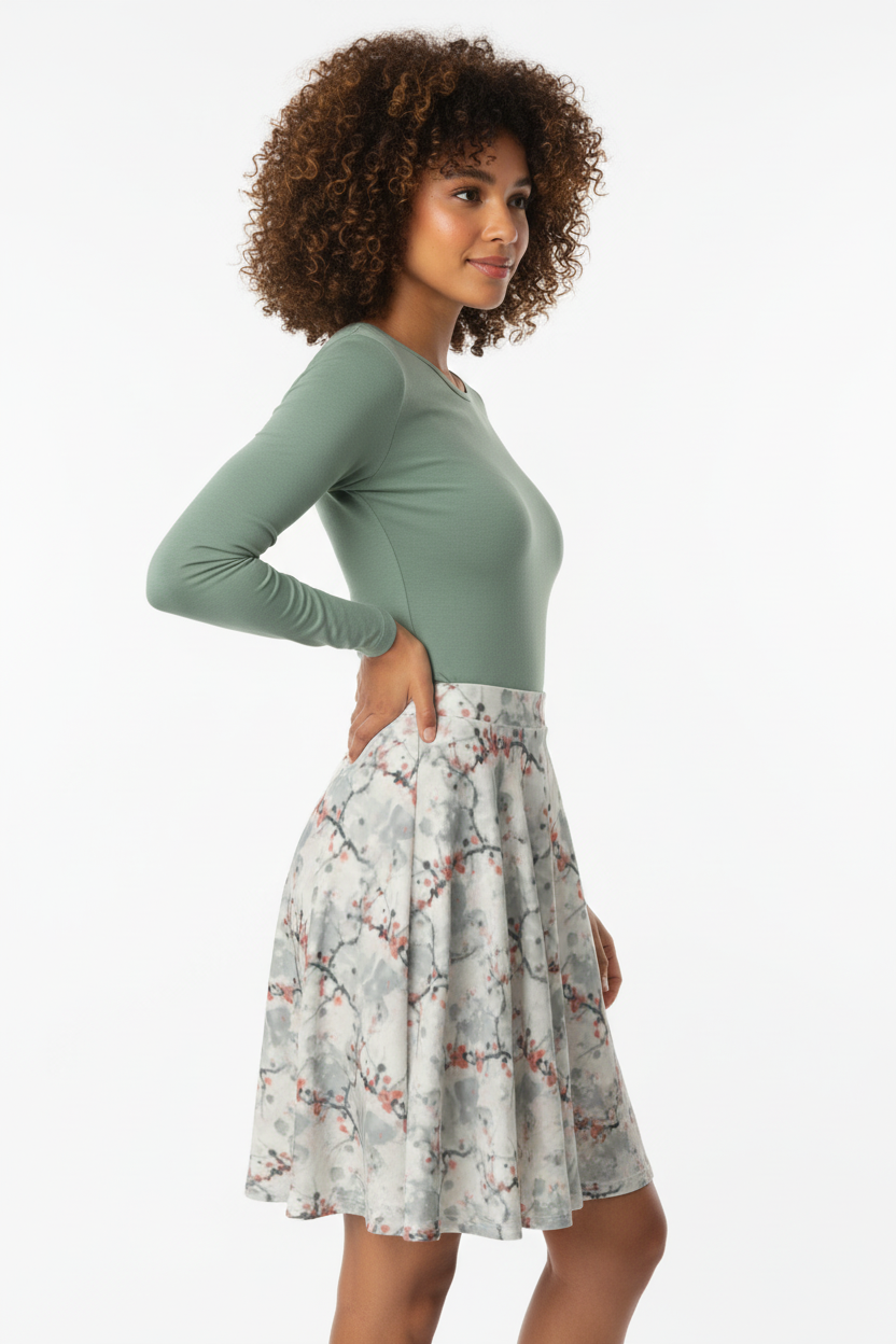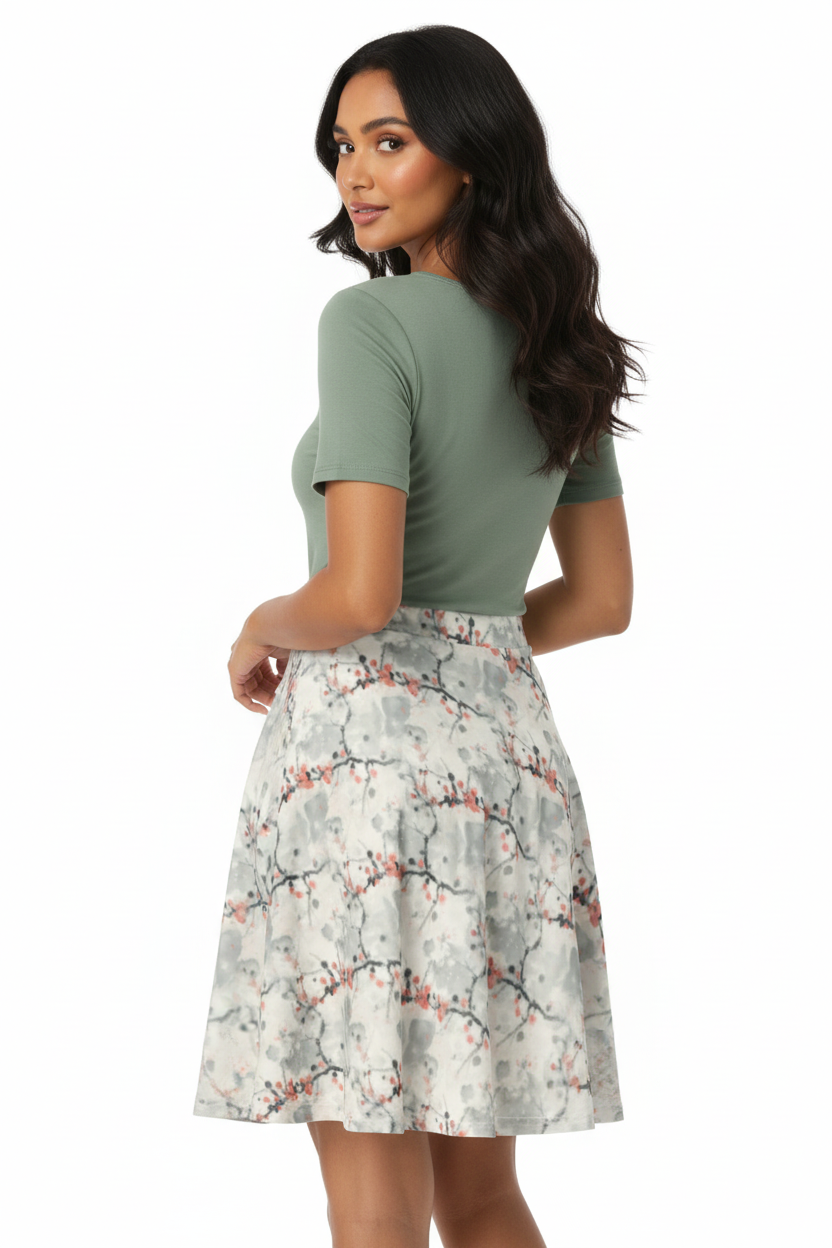 Feminine, flirty, and effortlessly romantic. This skater skirt features a delicate watercolor print of cherry blossom branches with pink blooms against a serene sage green backdrop, creating a dreamy botanical aesthetic that brings spring garden elegance to your wardrobe.