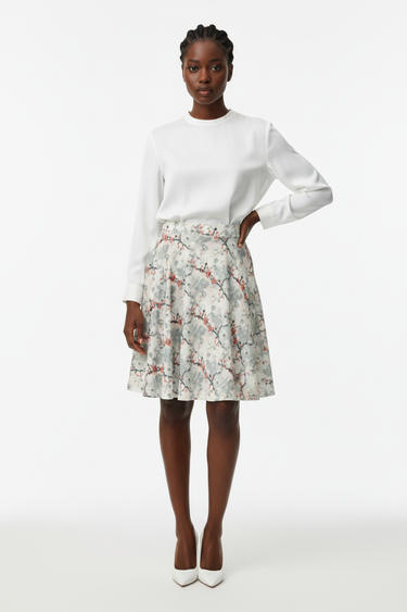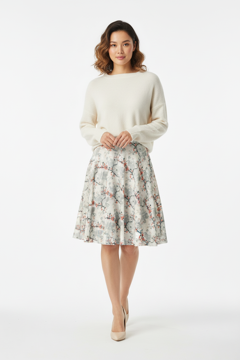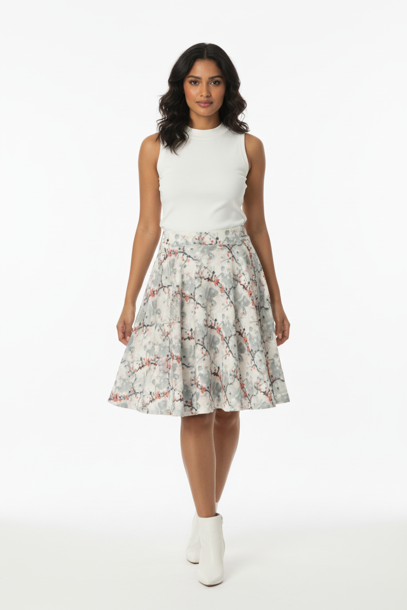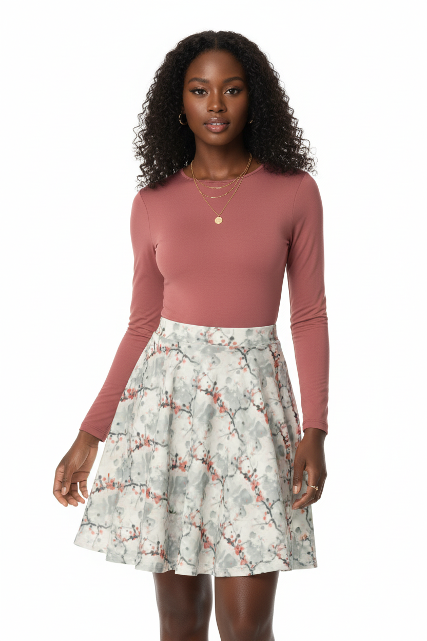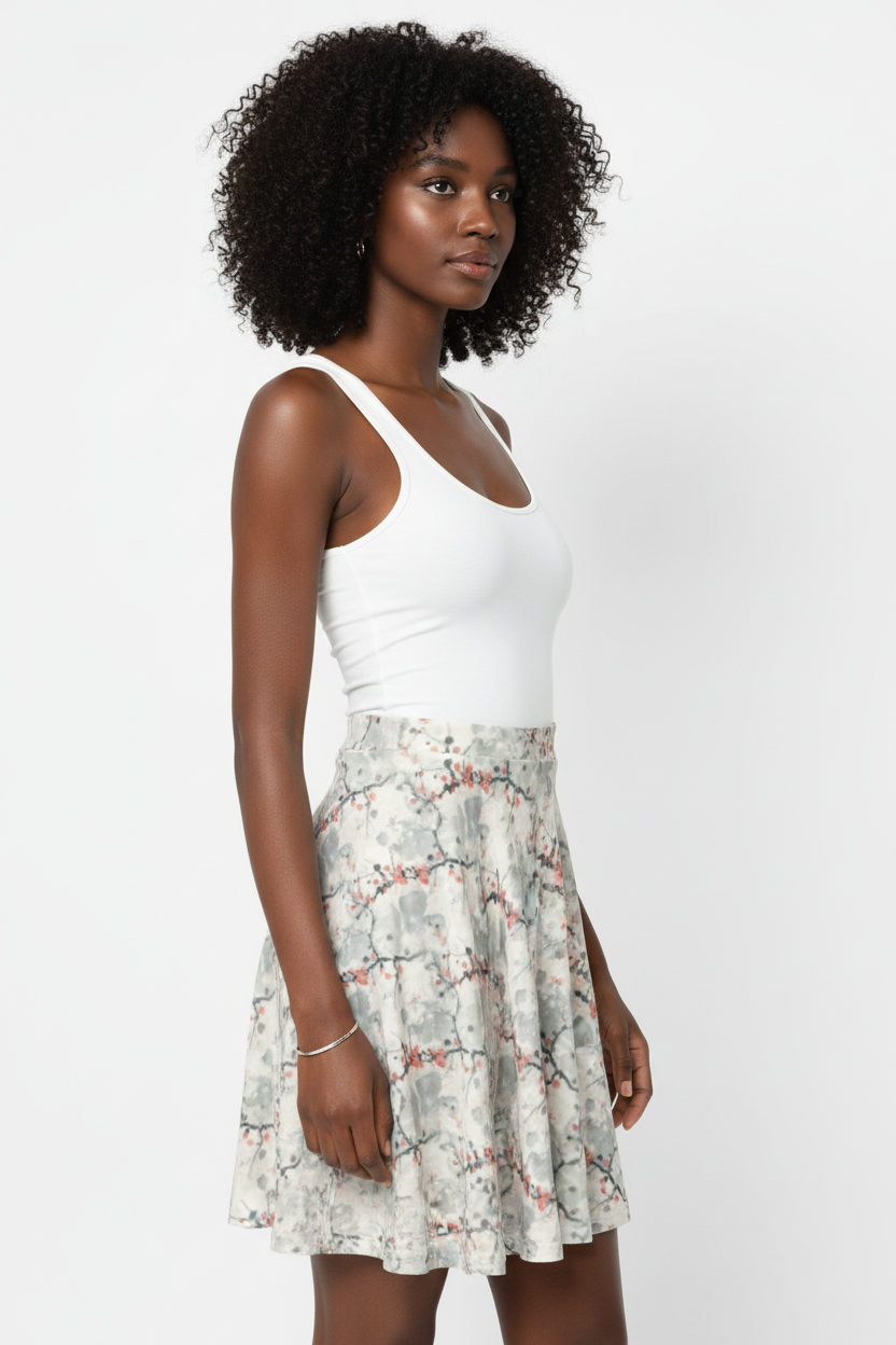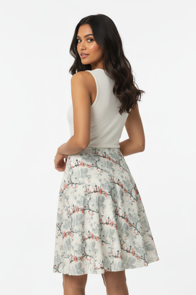 Feminine, flirty, and effortlessly romantic. This skater skirt features a delicate watercolor print of cherry blossom branches with pink blooms against a serene sage green backdrop, creating a dreamy botanical aesthetic that brings spring garden elegance to your wardrobe.