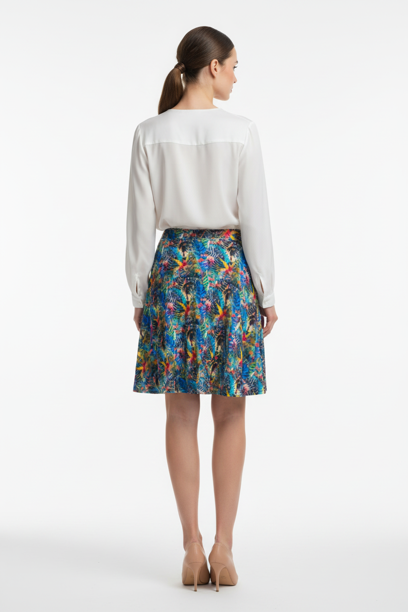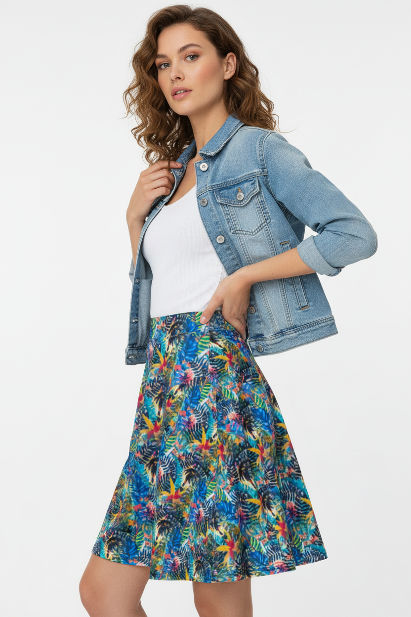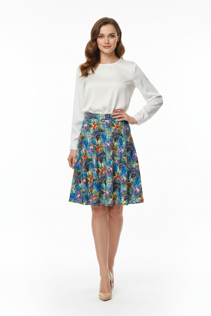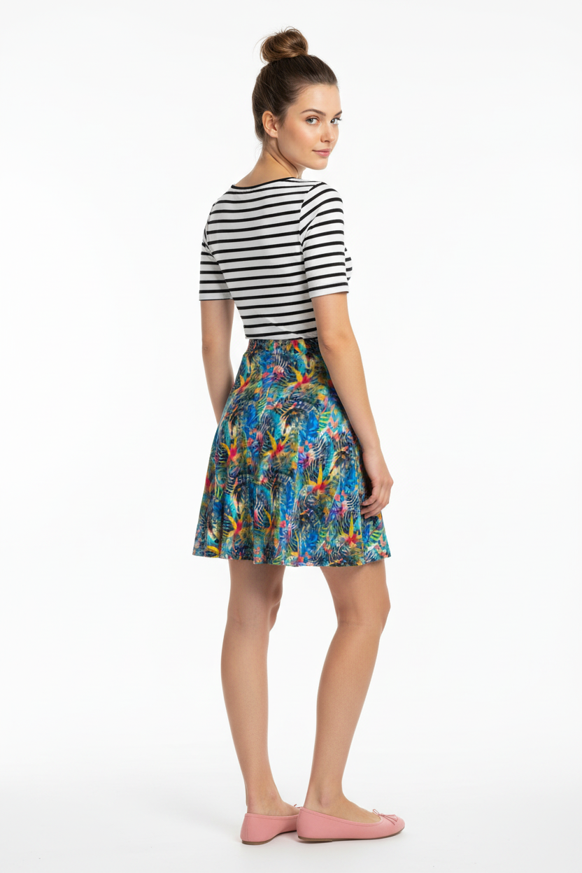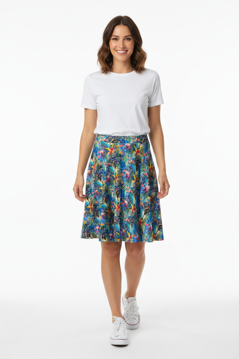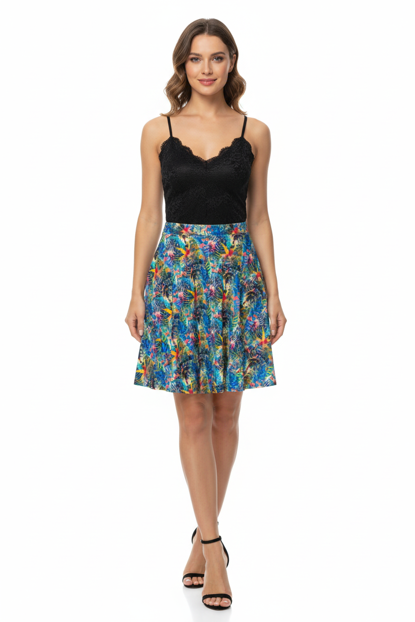 Embrace your day in the captivating Ethereal Bloom Flare Skirt, where vibrant watercolor hues come together in a harmonious blend of color. The stunning pattern showcases swirling blues, pinks, yellows, and turquoise, reminiscent of petals floating in a gentle breeze. This skirt is not just clothing; it's an artistic masterpiece you can wear.