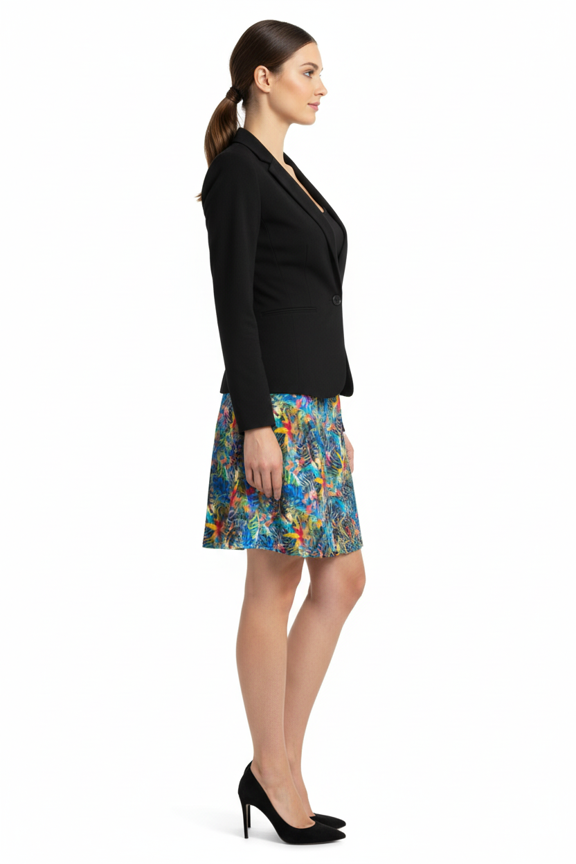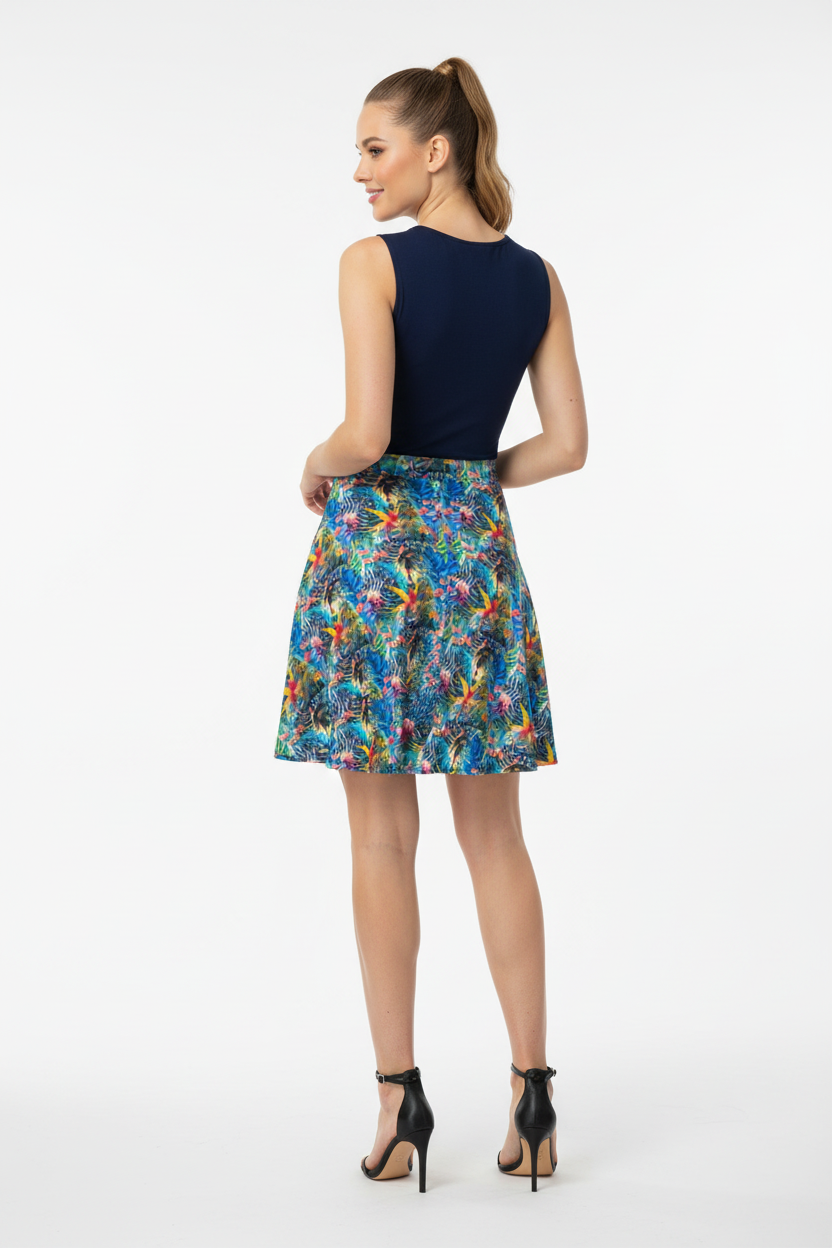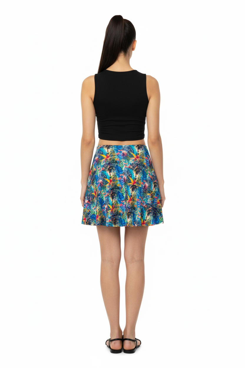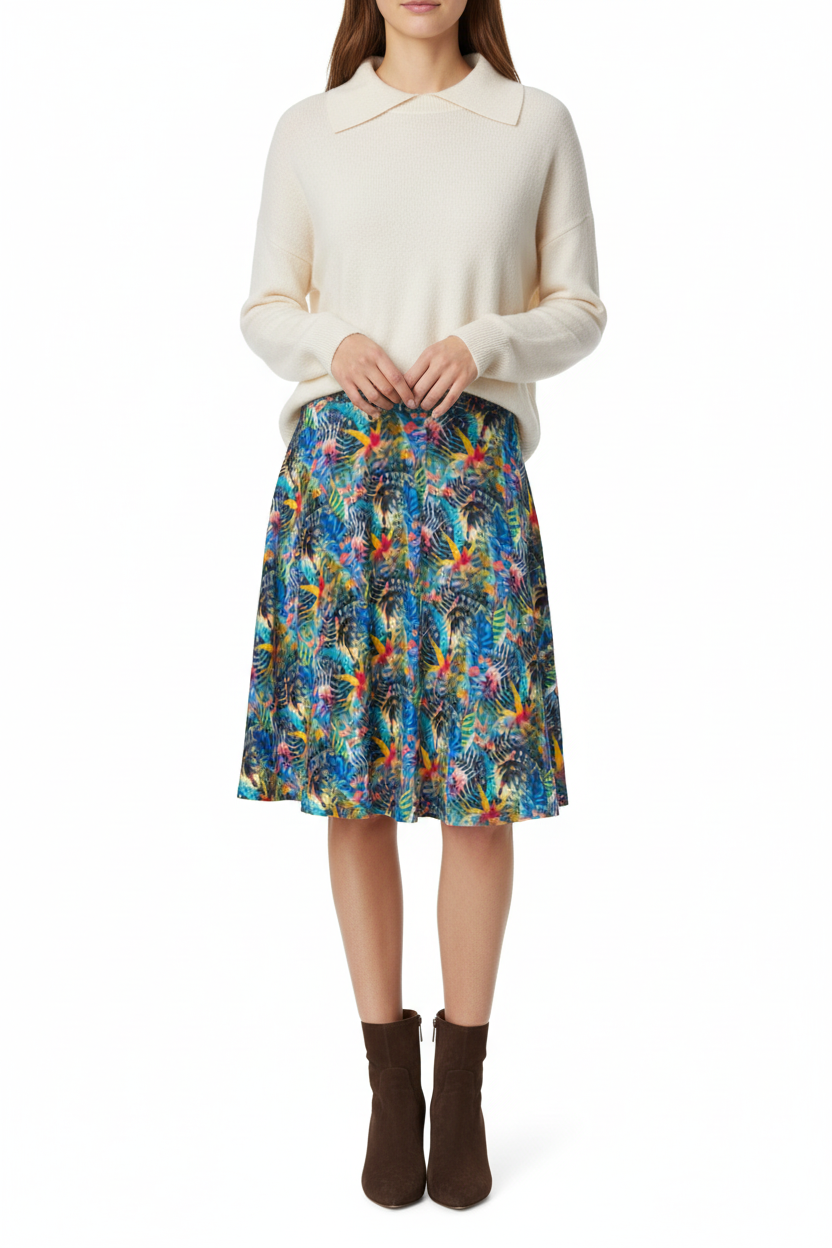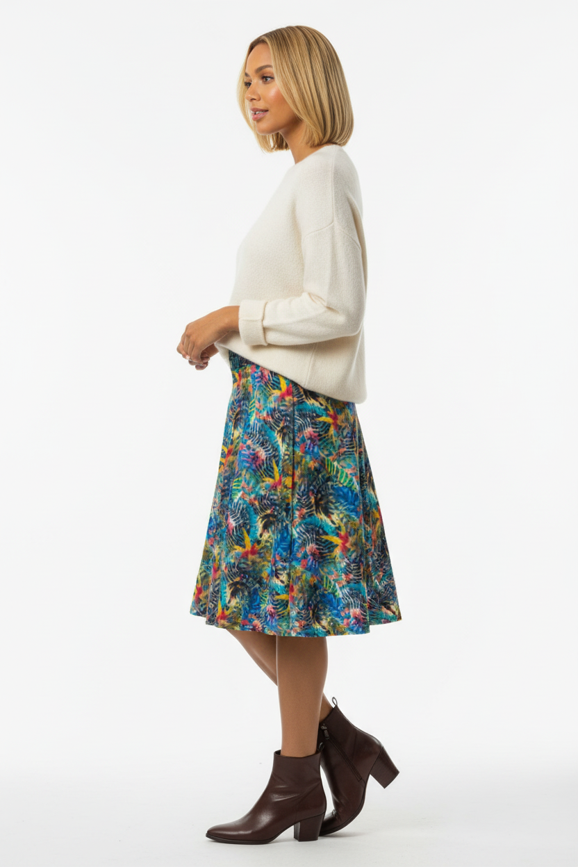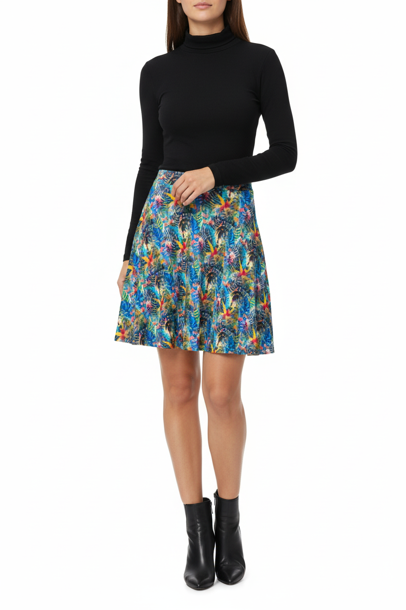Embrace your day in the captivating Ethereal Bloom Flare Skirt, where vibrant watercolor hues come together in a harmonious blend of color. The stunning pattern showcases swirling blues, pinks, yellows, and turquoise, reminiscent of petals floating in a gentle breeze. This skirt is not just clothing; it's an artistic masterpiece you can wear.