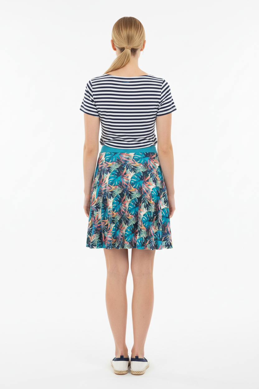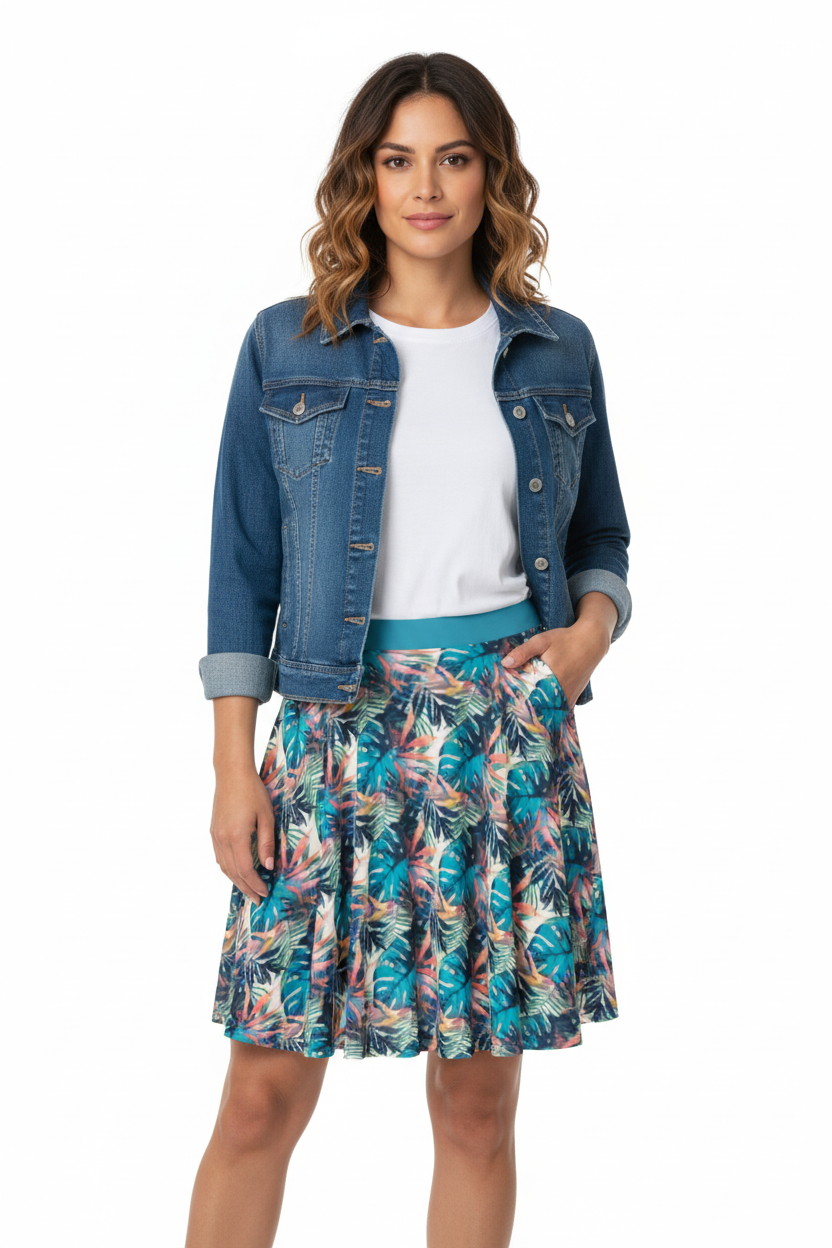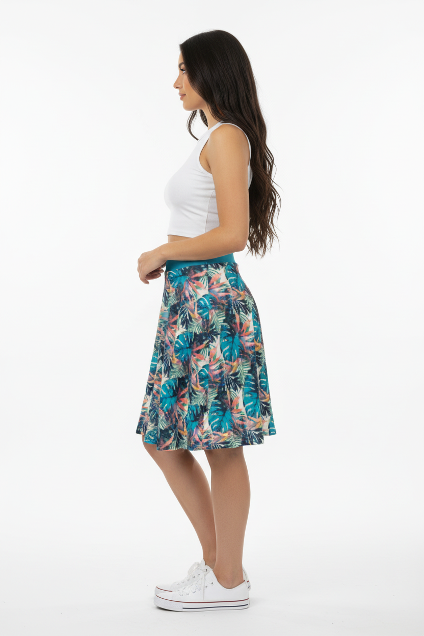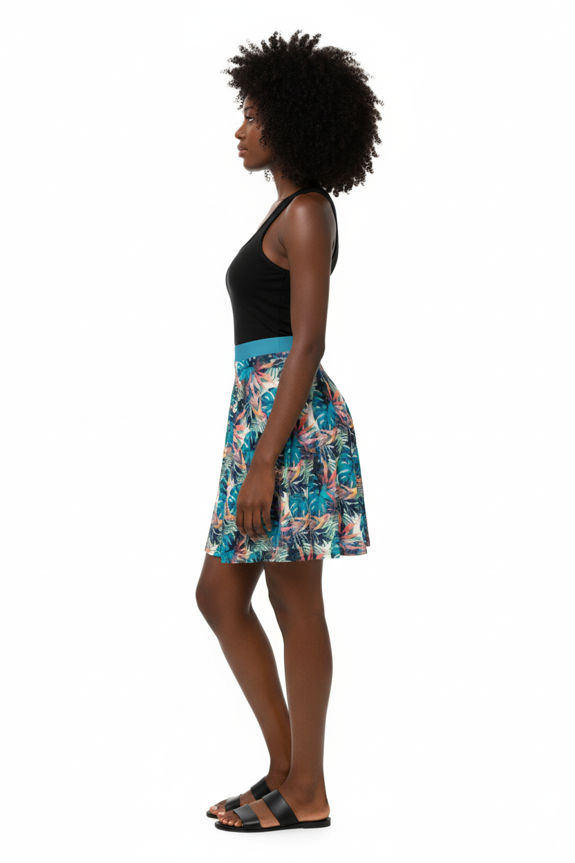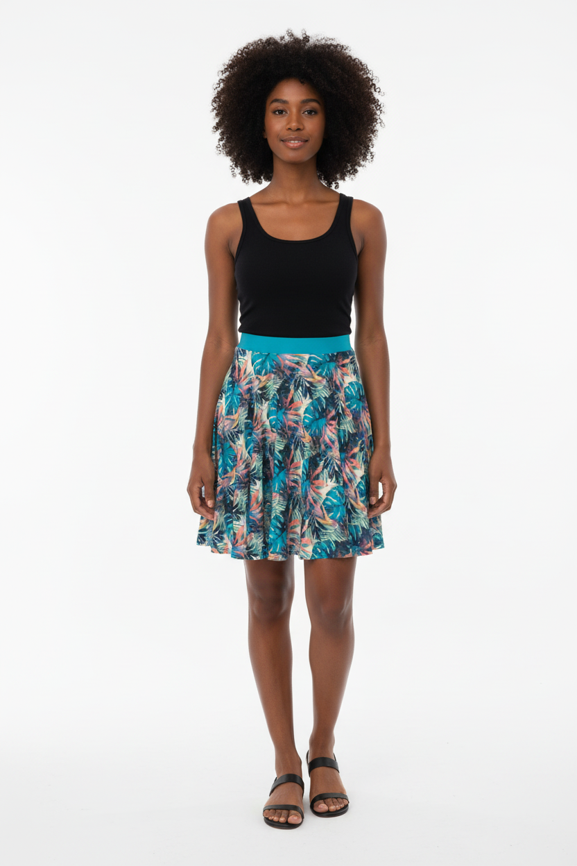Twirl into paradise with the Tropical Monstera Skater Skirt—a vibrant statement piece that brings instant summer energy to your wardrobe. Featuring an all-over print of lush turquoise monstera leaves, coral palm fronds, and botanical accents, this flared skirt combines playful tropical vibes with flattering feminine style.