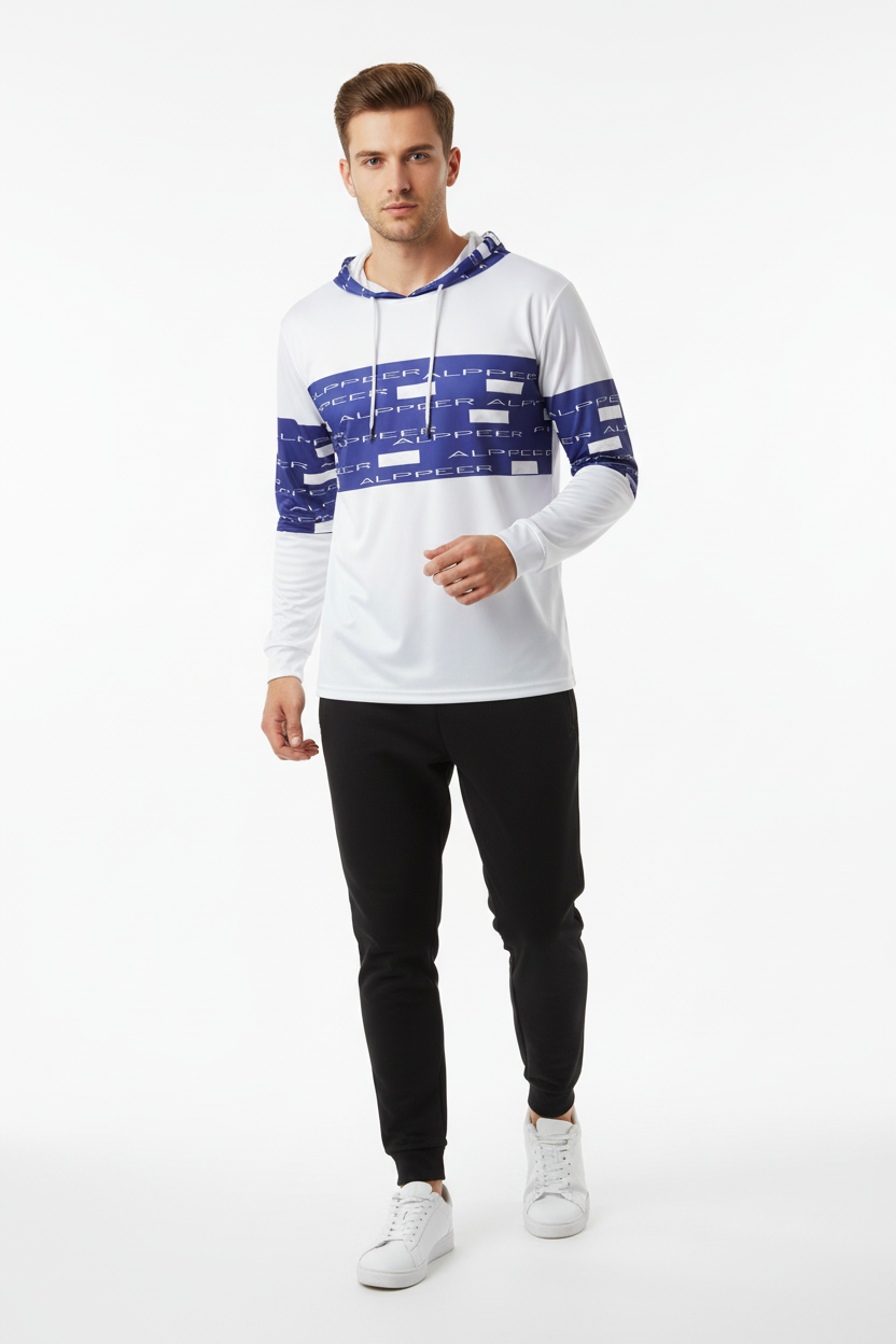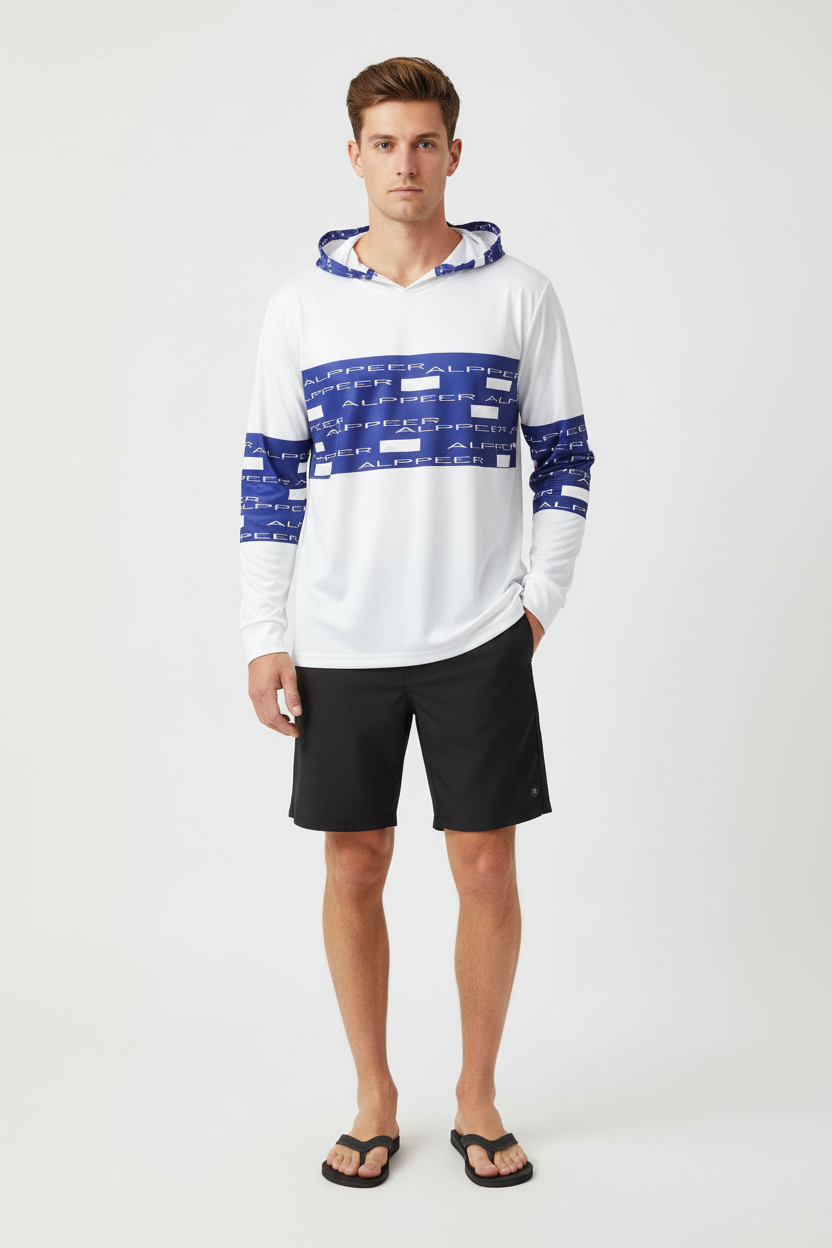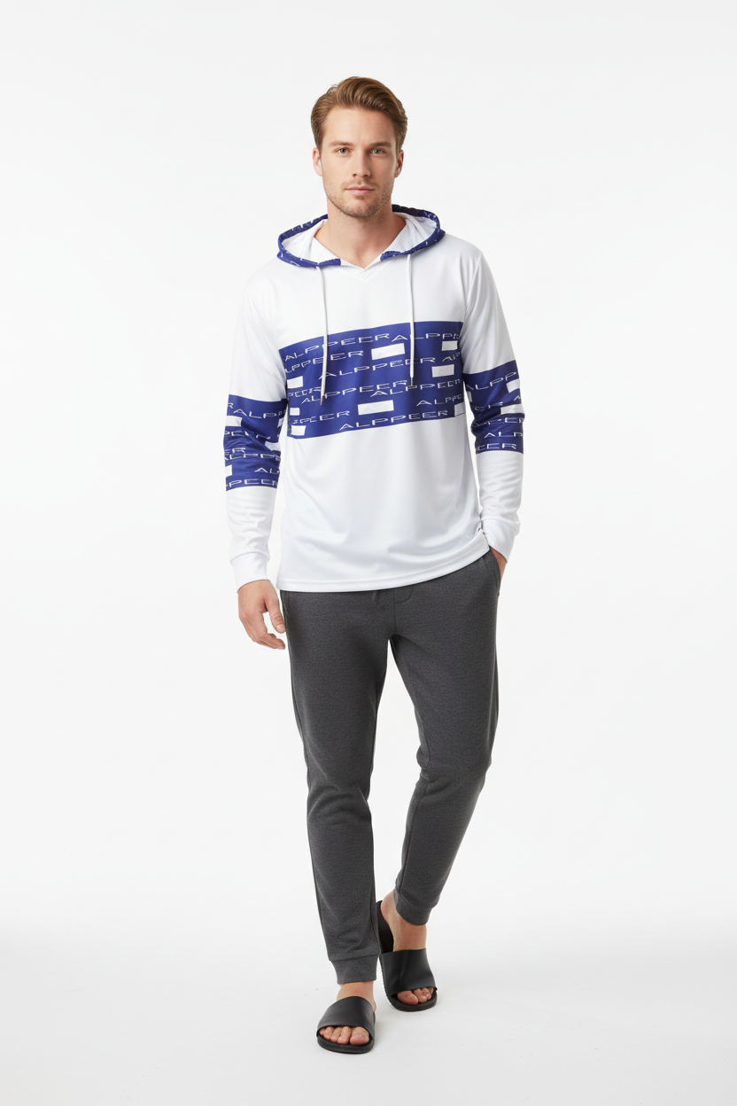 Stand out in the Alppeer Horizon Stripe Sports Warmup Hoodie—where clean design meets athletic performance. This sports warmup hoodie features bold horizontal navy blue stripes with repeating Alppeer branding across the chest and sleeves against a crisp white base, creating a fresh, modern aesthetic that's perfect for training and casual wear.
