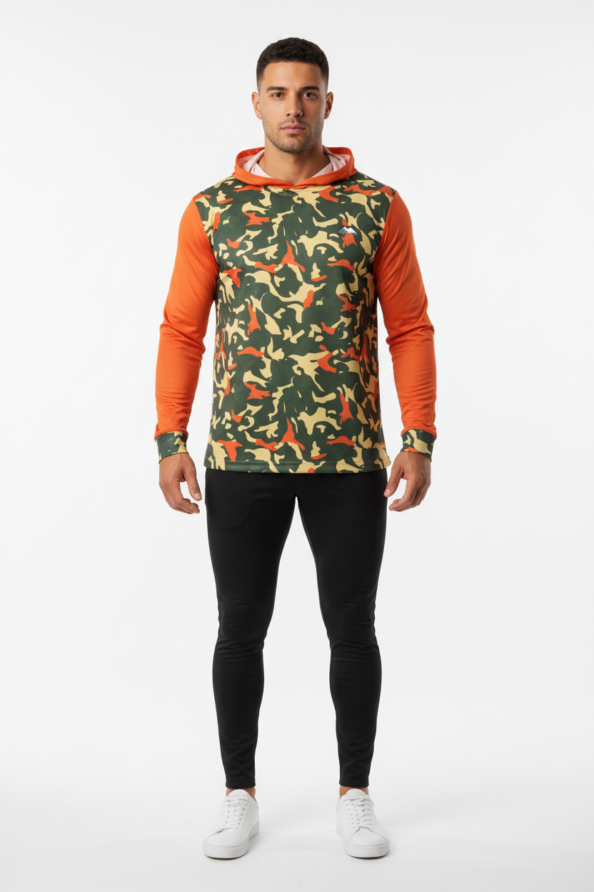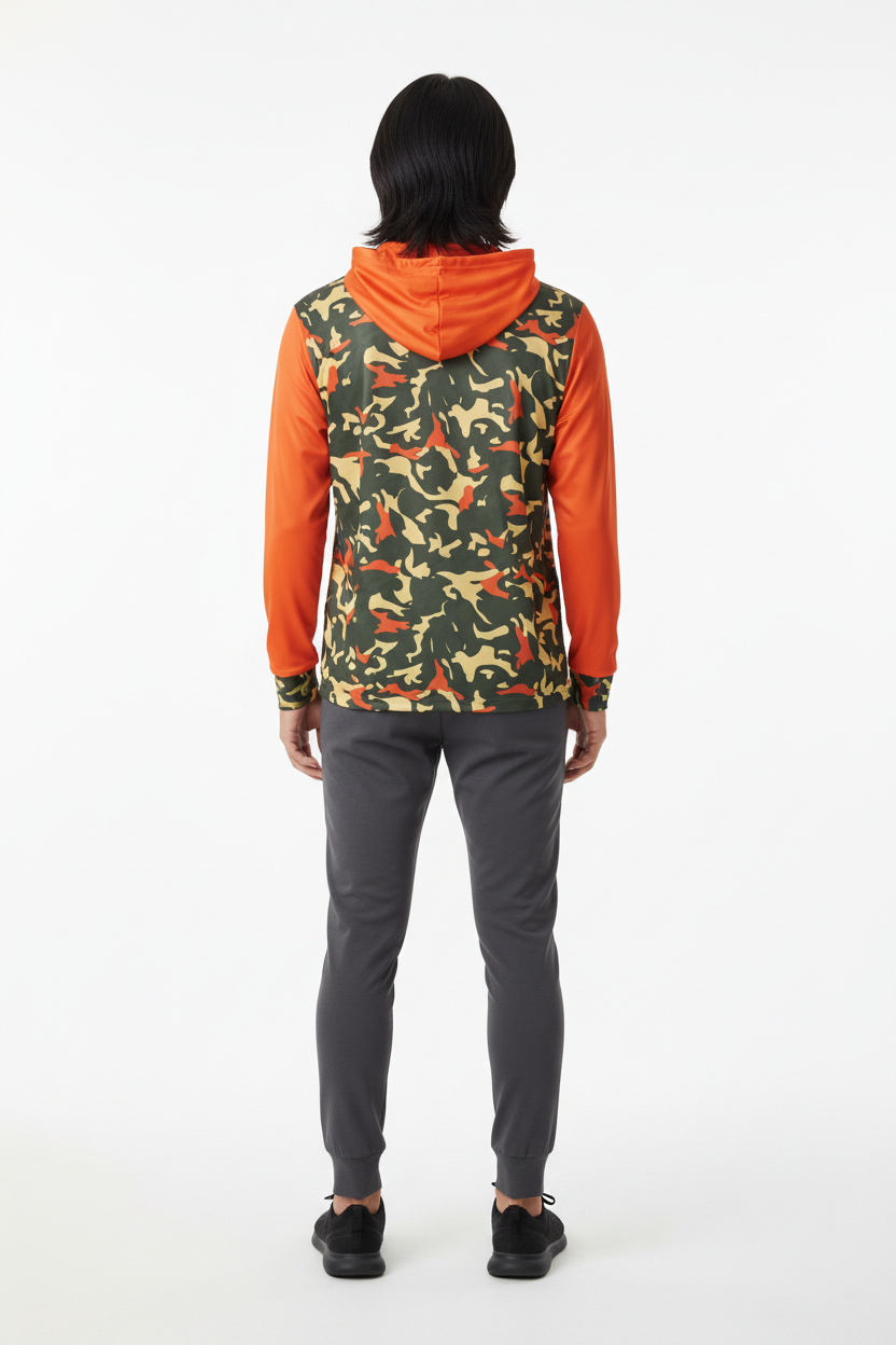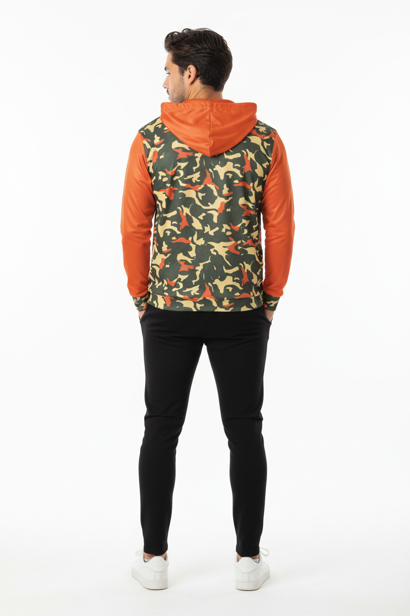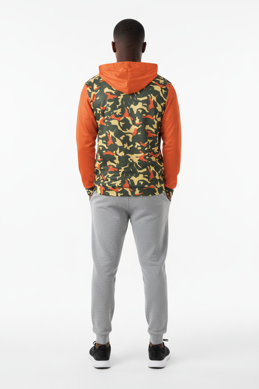 Command attention with the Blaze Trail Camo Sports Warmup Hoodie, where tactical meets bold. This premium sports warm-up hoodie features a distinctive orange-and-tan camouflage pattern across the body, contrasted by vibrant solid orange sleeves and hood for maximum visibility and style impact.