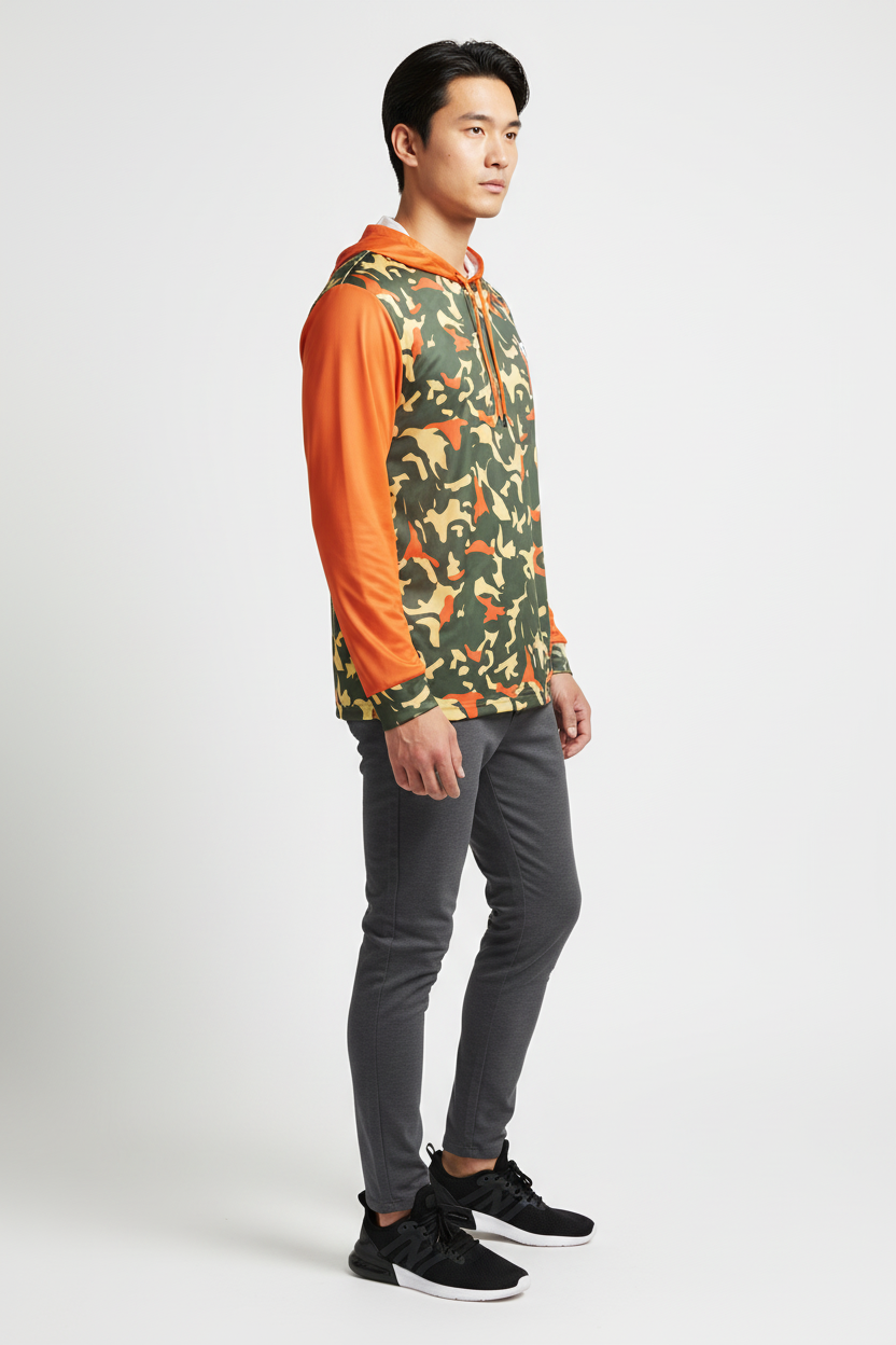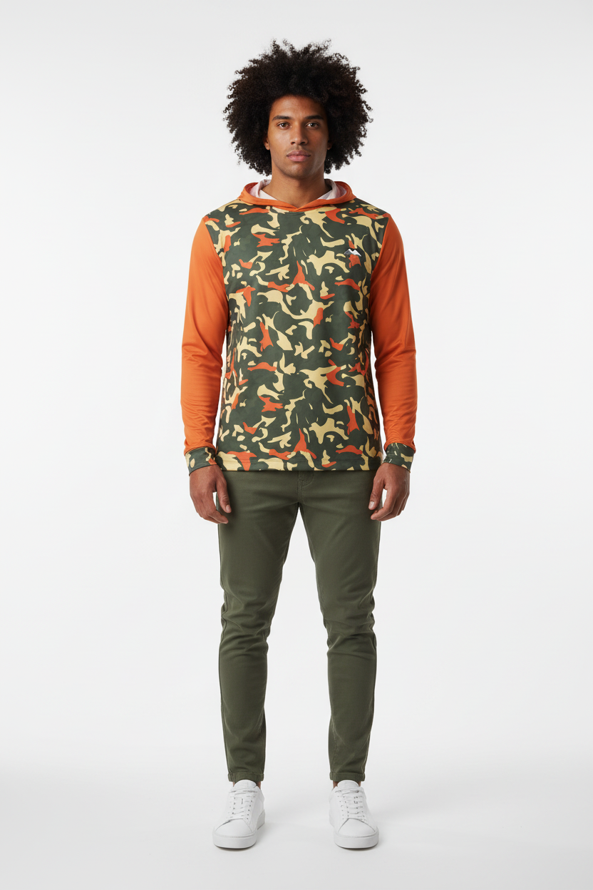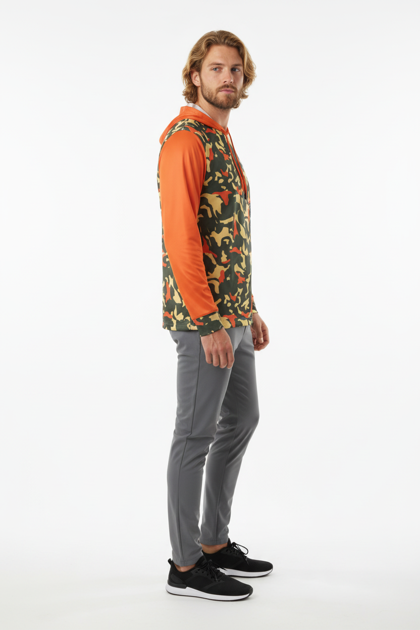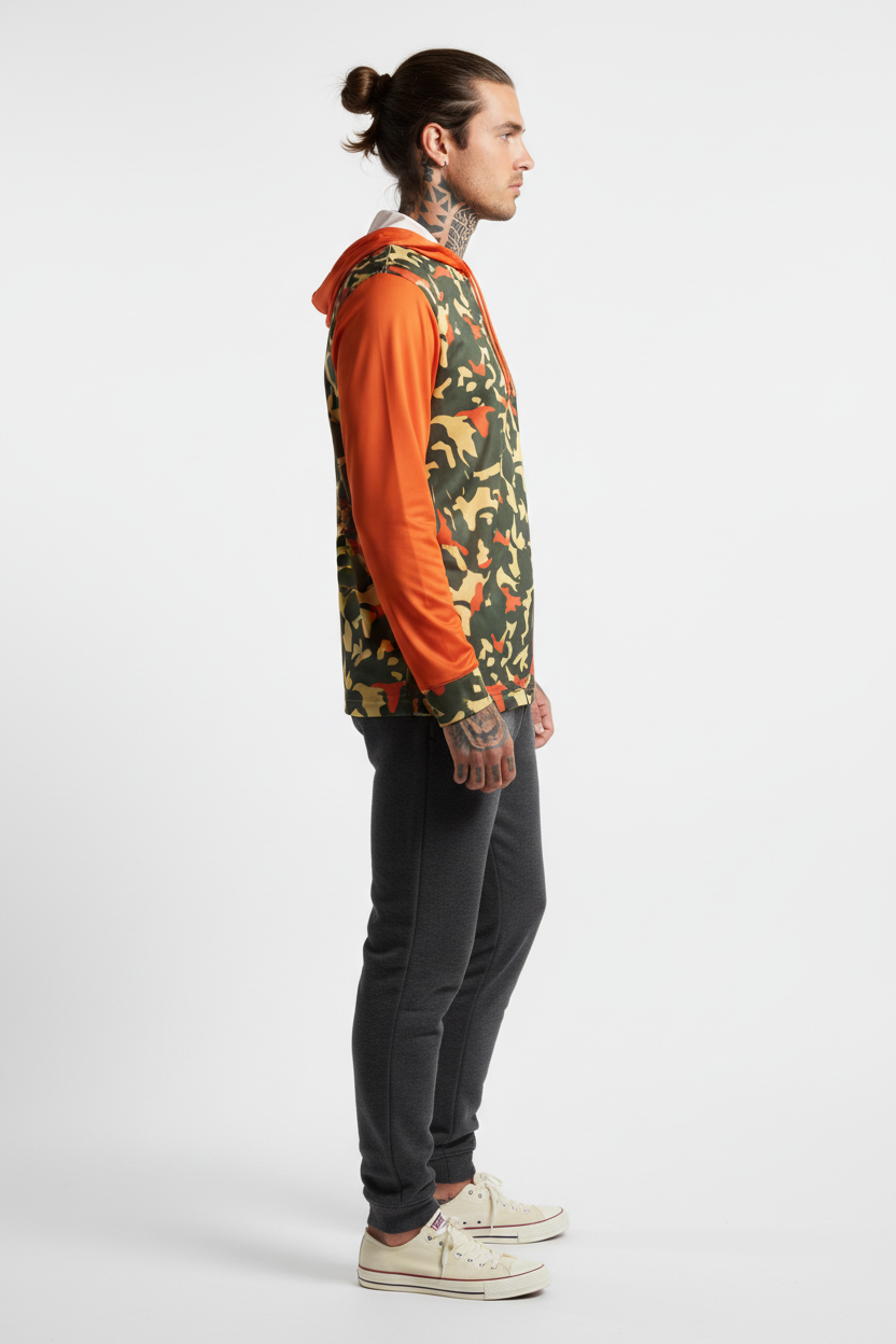 Command attention with the Blaze Trail Camo Sports Warmup Hoodie, where tactical meets bold. This premium sports warm-up hoodie features a distinctive orange-and-tan camouflage pattern across the body, contrasted by vibrant solid orange sleeves and hood for maximum visibility and style impact.