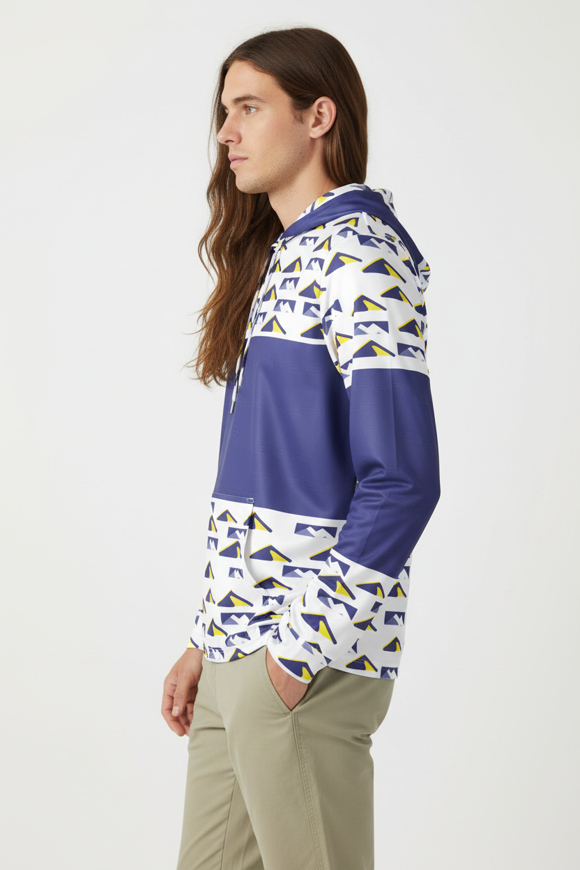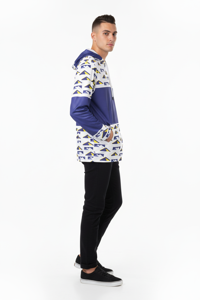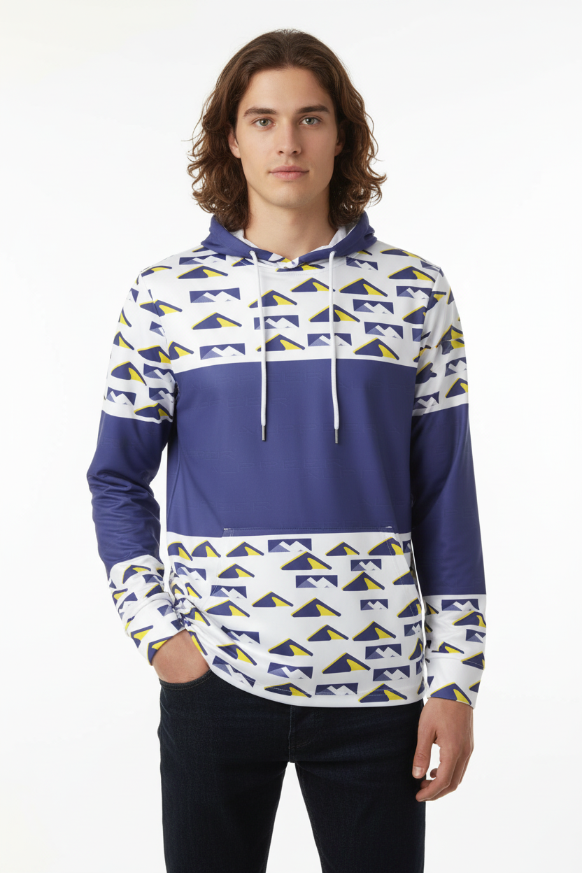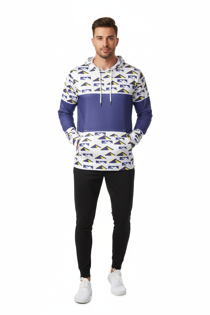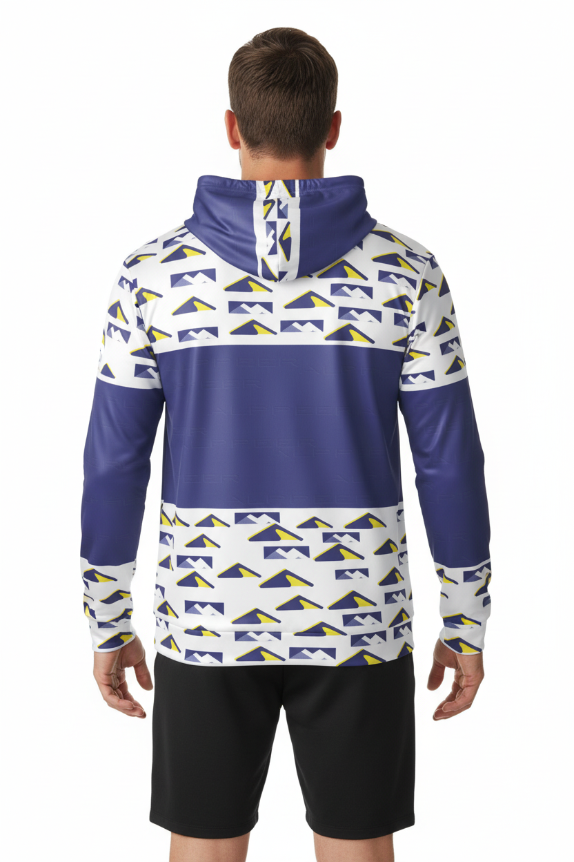 Elevate your training game with the Peak Performance Sports Hoodie. Featuring a bold geometric mountain pattern in navy, white, and electric yellow, this athletic hoodie is engineered for athletes who demand both style and performance.