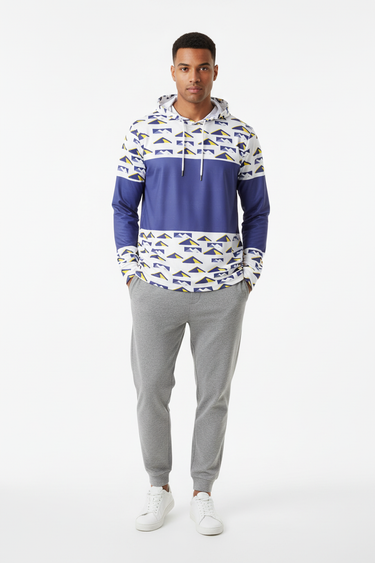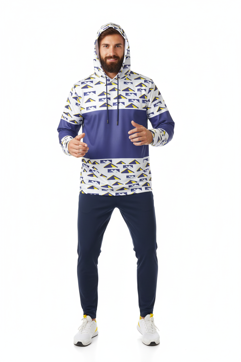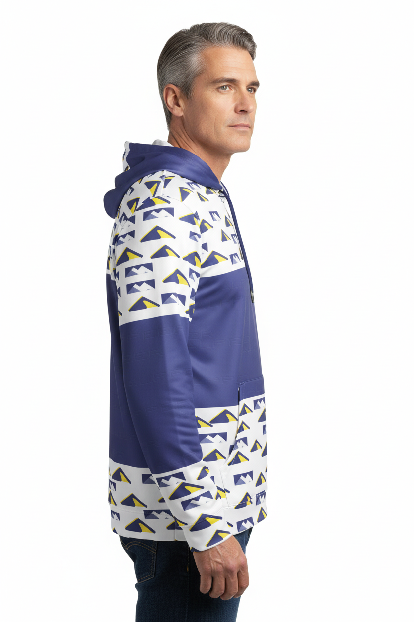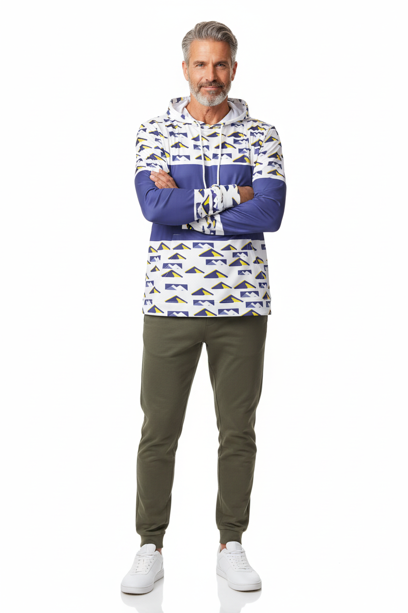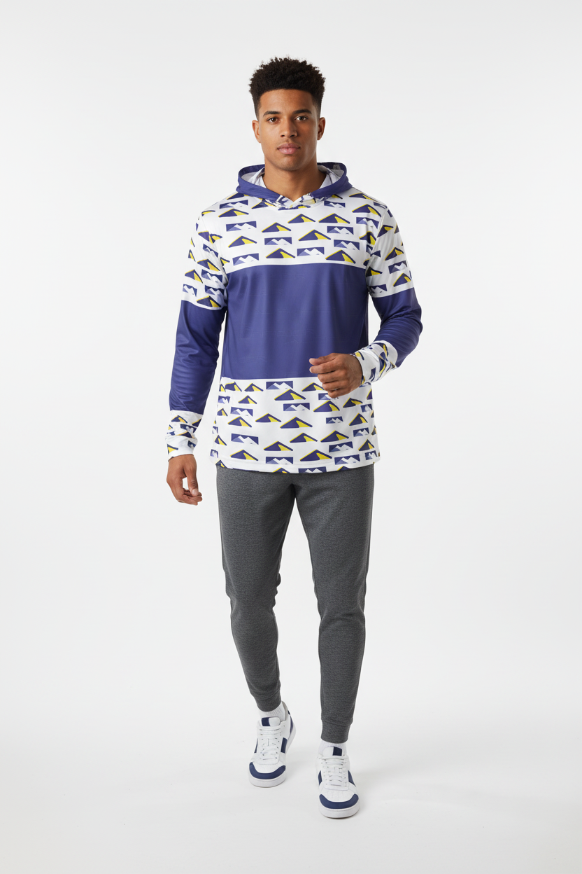 Elevate your training game with the Peak Performance Sports Hoodie. Featuring a bold geometric mountain pattern in navy, white, and electric yellow, this athletic hoodie is engineered for athletes who demand both style and performance.