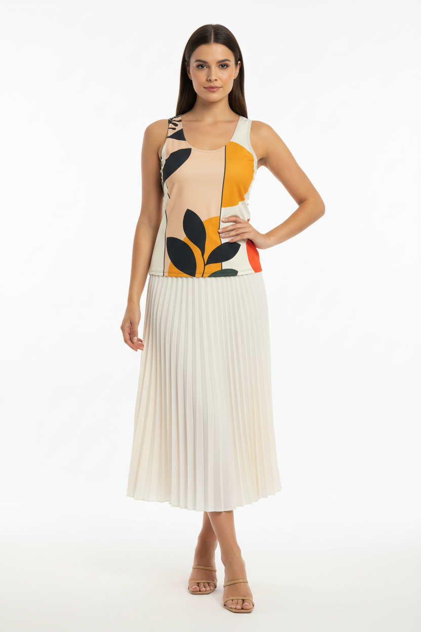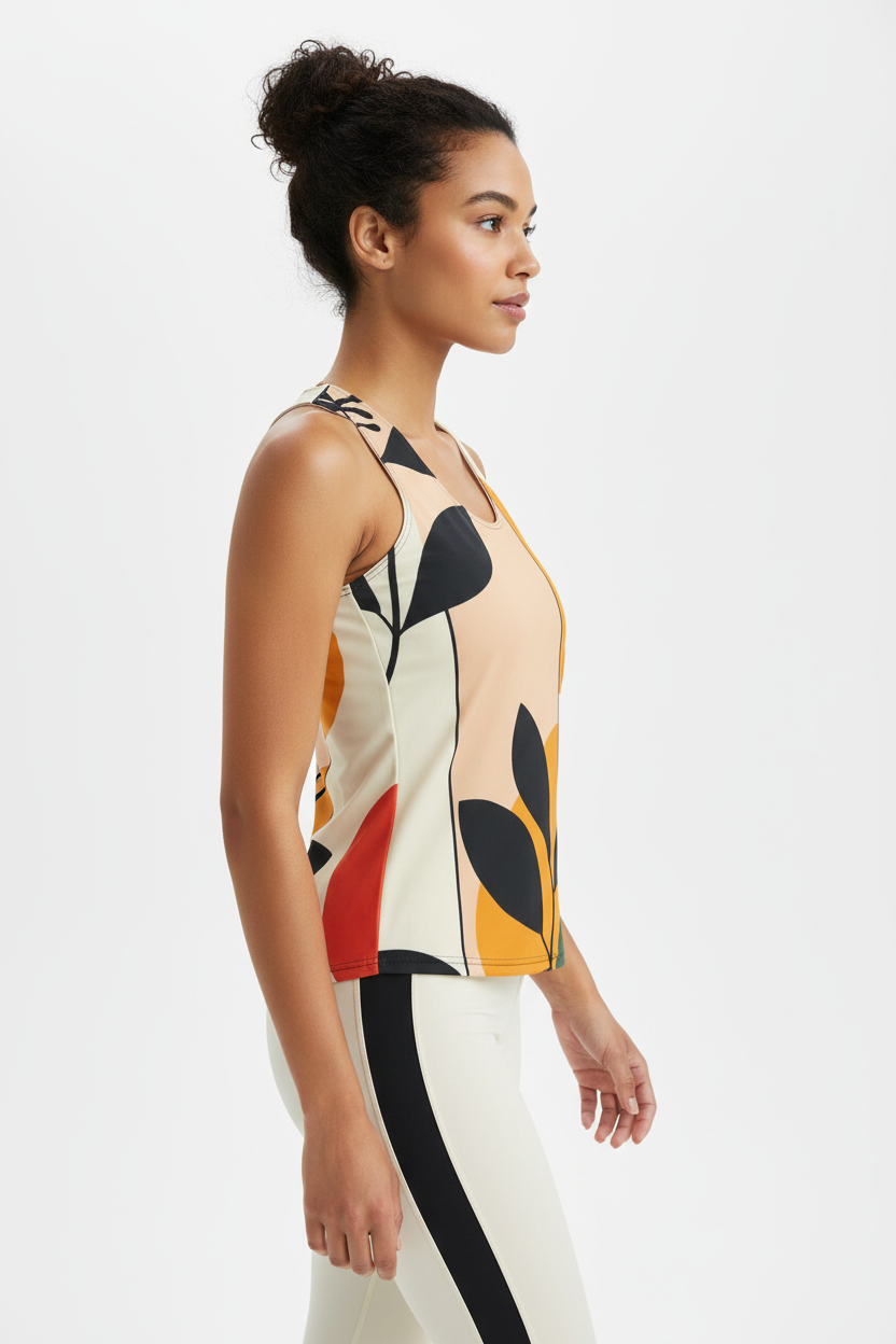Embrace nature-inspired style with this stunning tank top featuring an artistic botanical leaf print in cream, orange, and charcoal. The abstract design showcases bold leaf silhouettes and organic shapes in a contemporary color palette, creating a sophisticated statement piece that transitions effortlessly from yoga class to weekend brunch.
