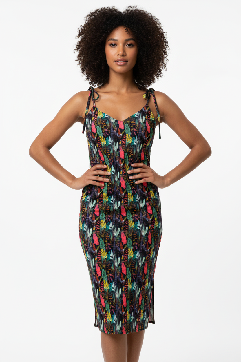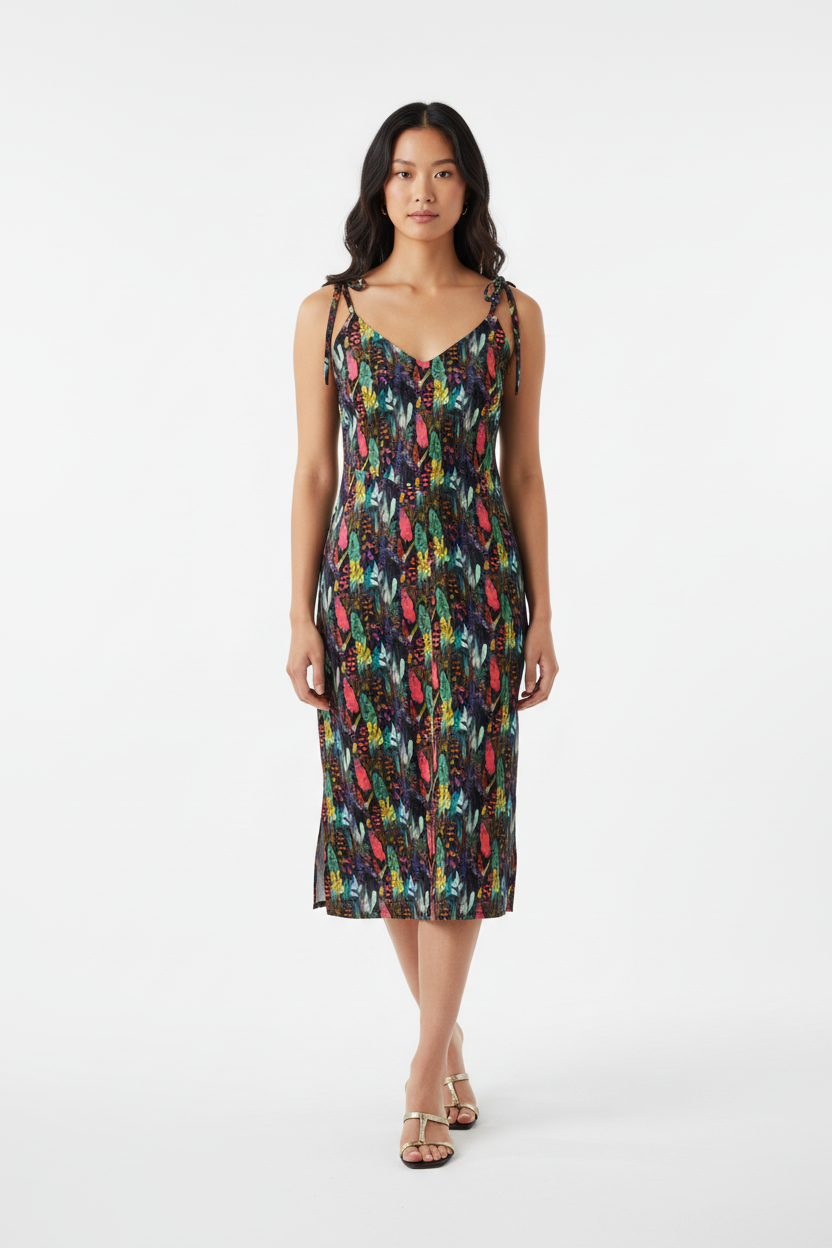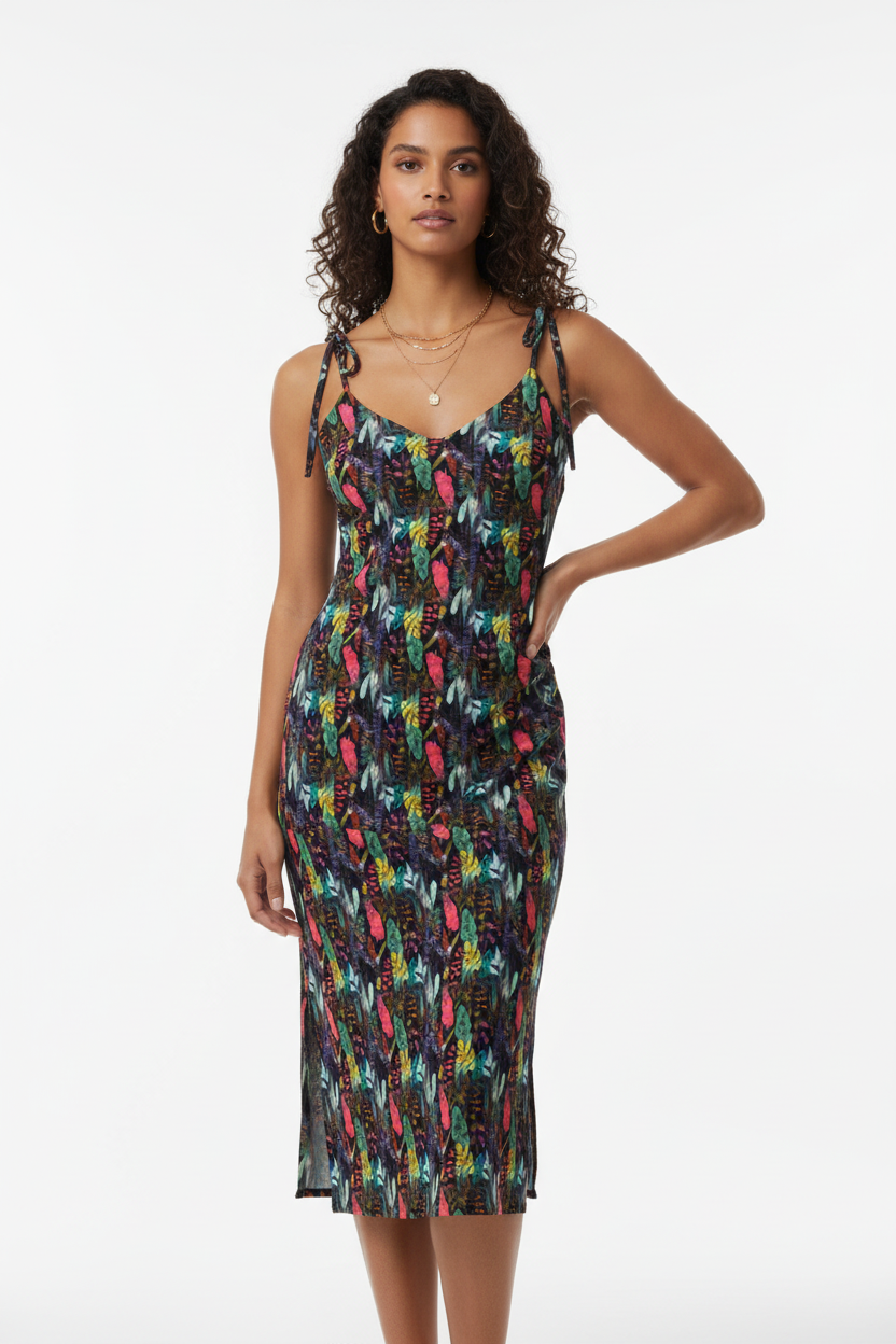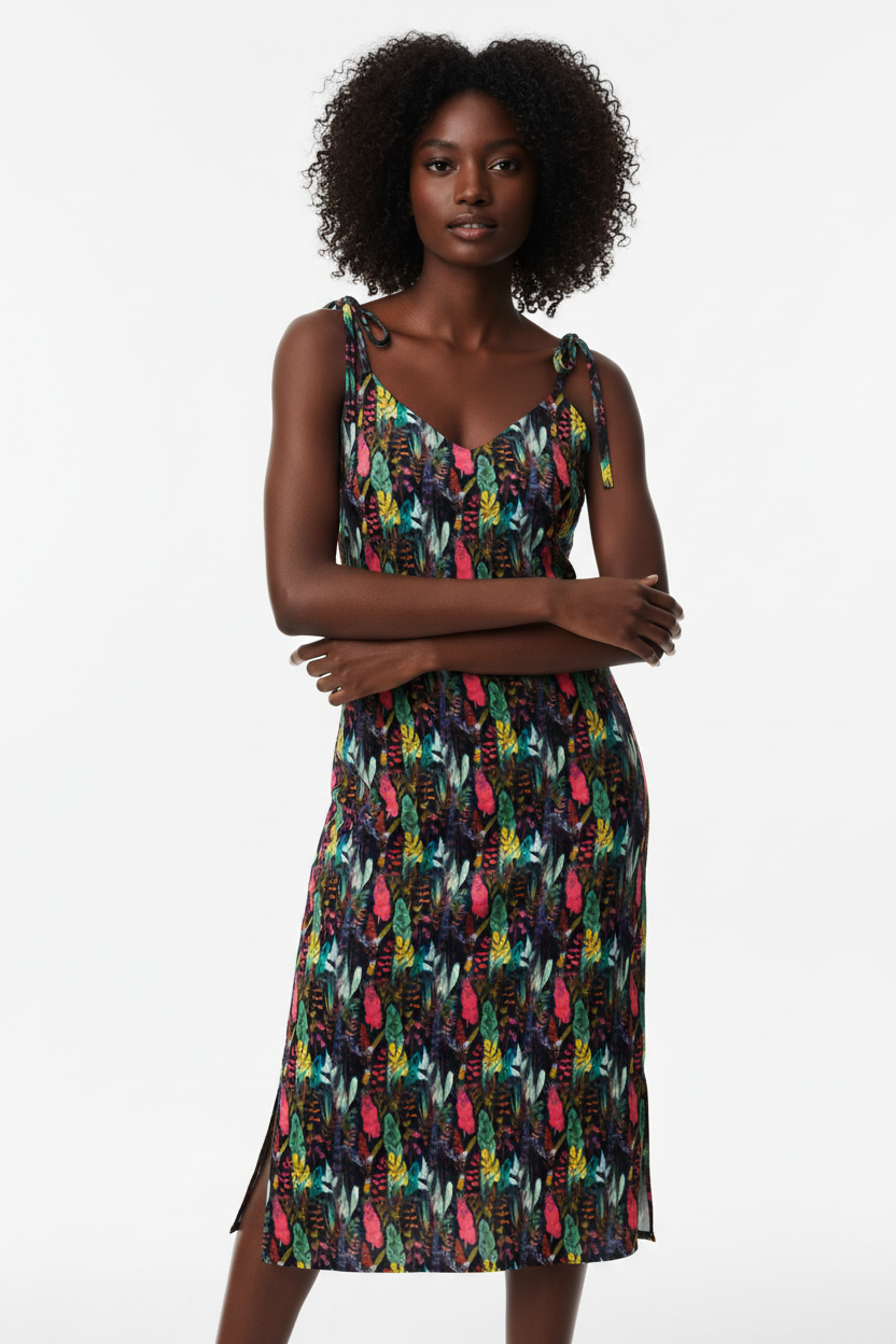 Step into the wild with this stunning midi slip dress featuring a vibrant tropical print on a dramatic black background. Colorful leaves and feathers in pink, yellow, turquoise, and green create an exotic jungle pattern that's perfect for making a bold statement. The breezy side slit, adjustable tie straps, and built-in bra ensure no-fuss style and all-day comfort.