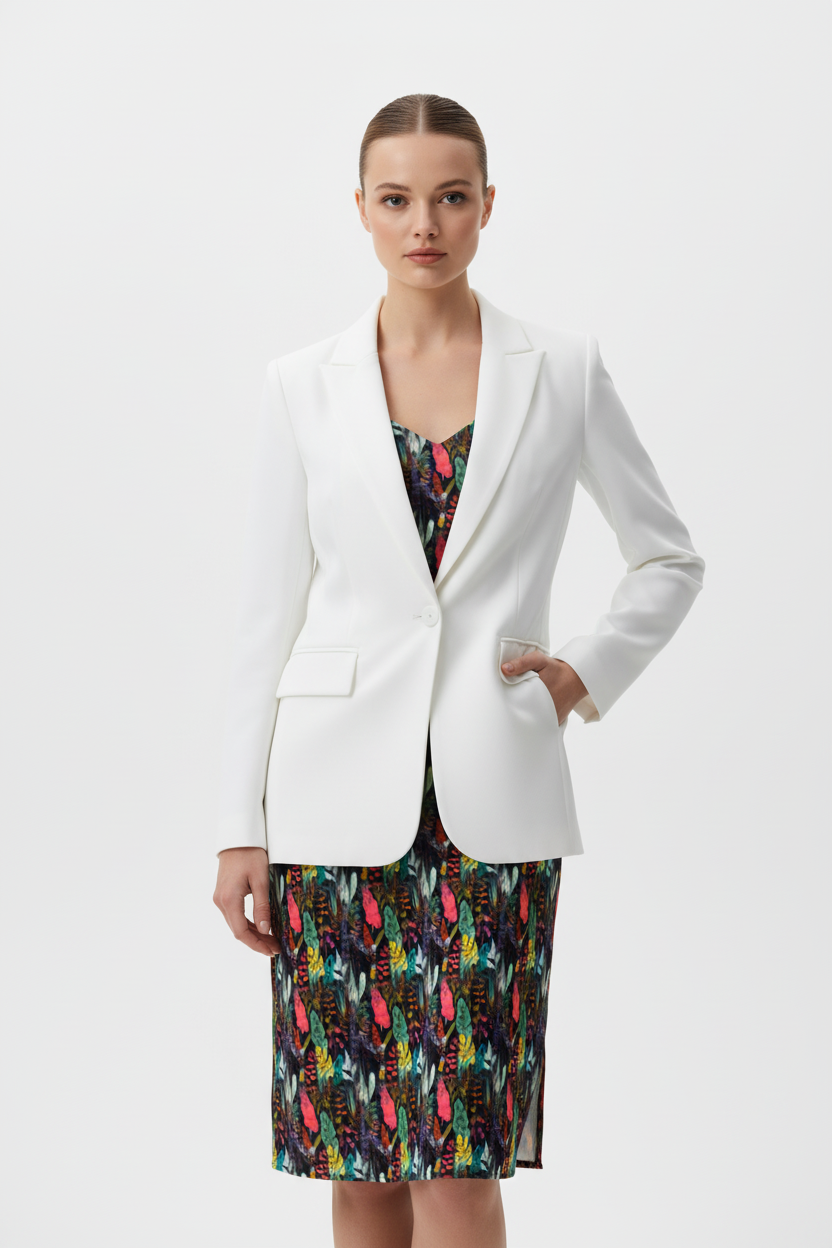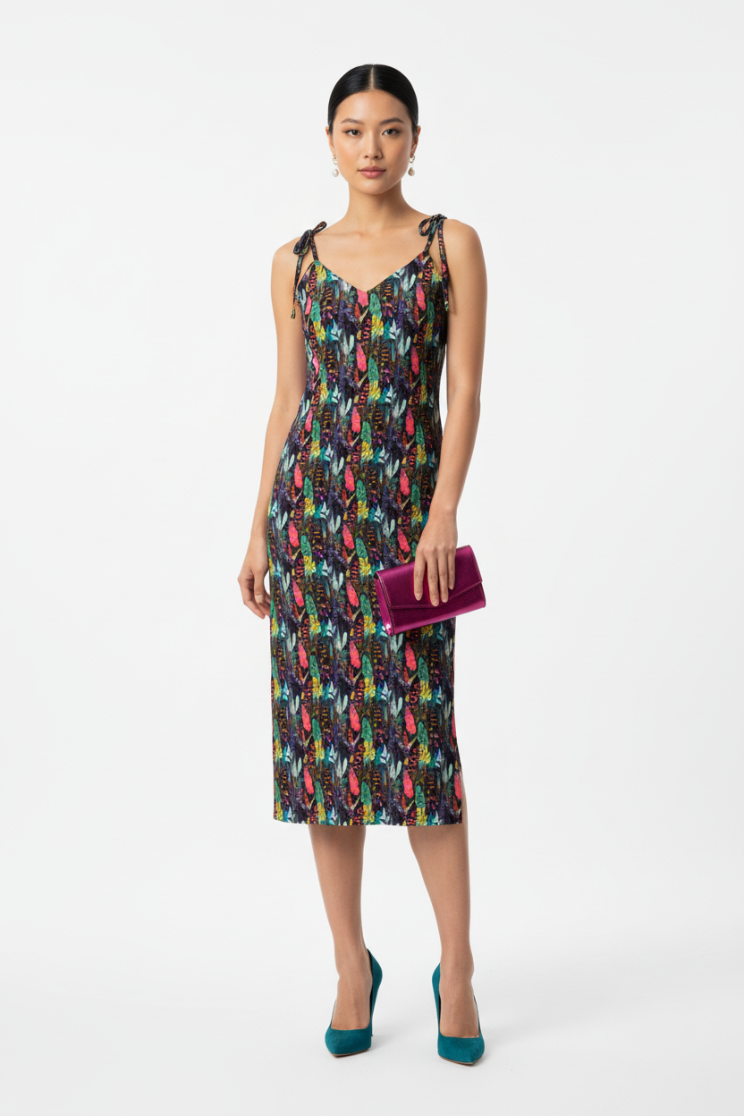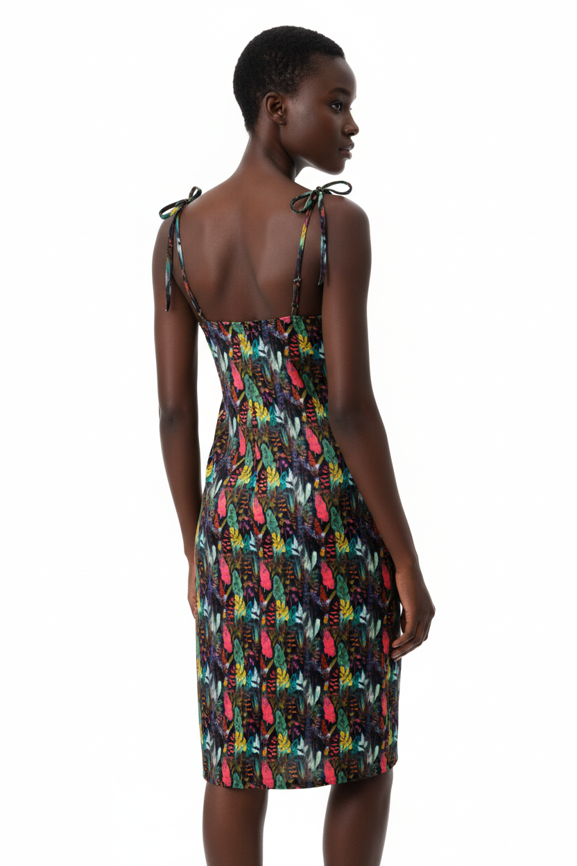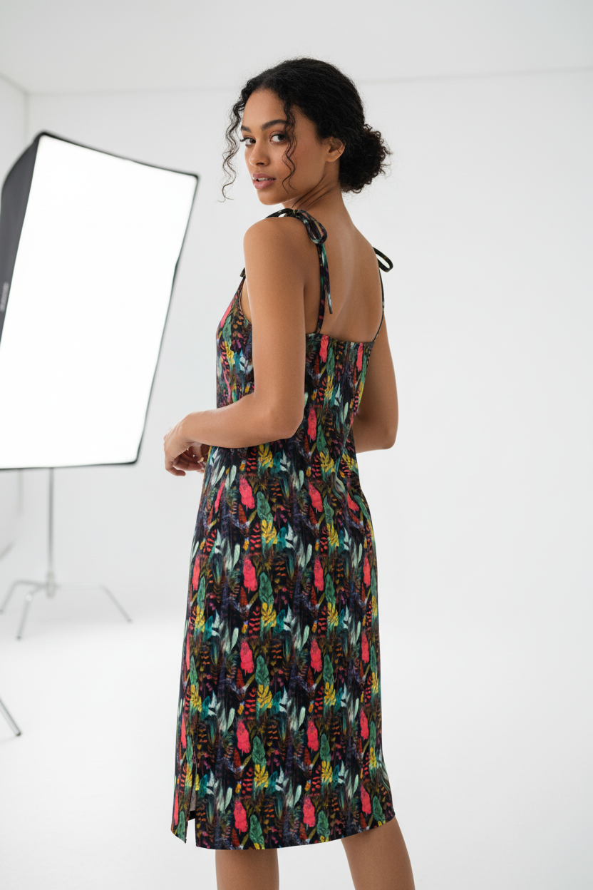 Step into the wild with this stunning midi slip dress featuring a vibrant tropical print on a dramatic black background. Colorful leaves and feathers in pink, yellow, turquoise, and green create an exotic jungle pattern that's perfect for making a bold statement. The breezy side slit, adjustable tie straps, and built-in bra ensure no-fuss style and all-day comfort.