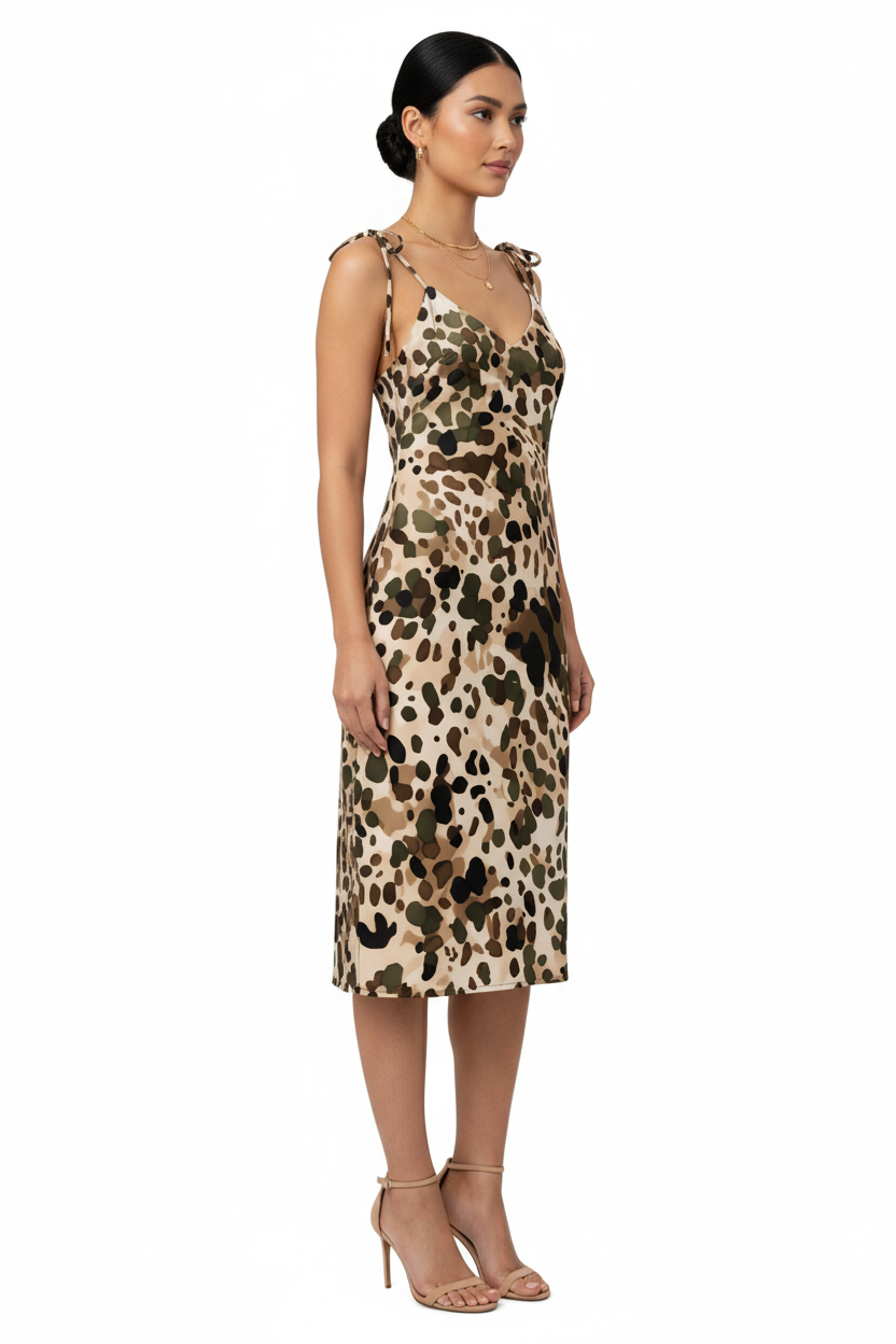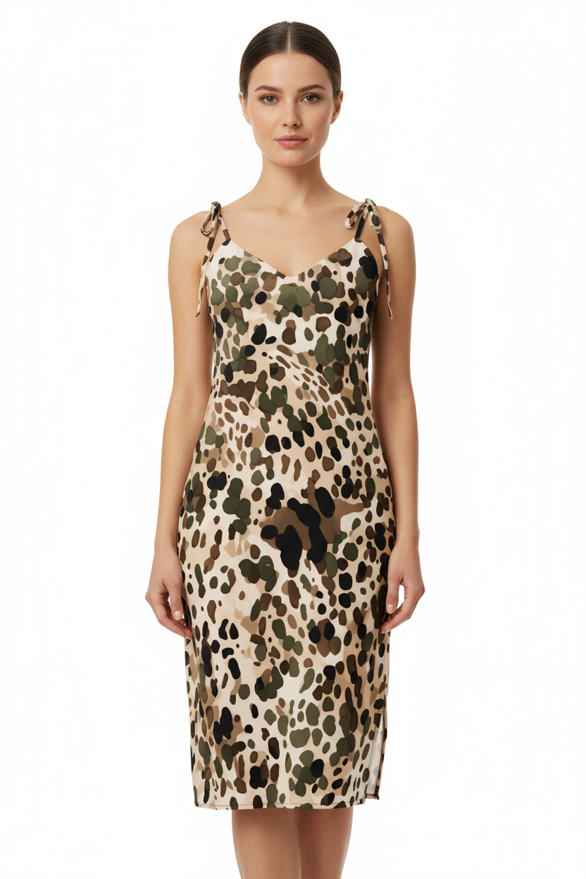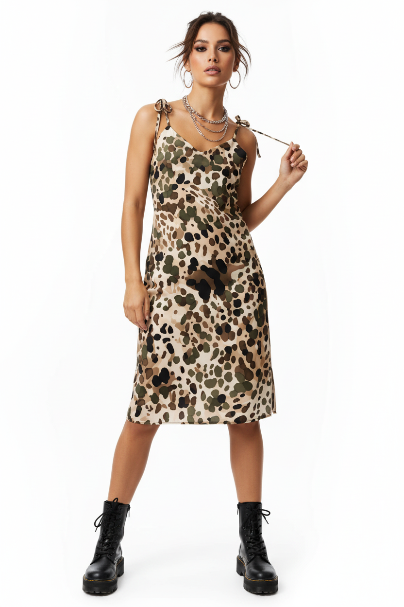 Elevate your style with the Desert Camo Slip Dress, a stunning fusion of tactical-inspired print and feminine elegance. This versatile slip dress features an authentic desert camouflage pattern in sophisticated tan, beige, olive green, and brown tones, creating a unique piece that transitions effortlessly from casual daywear to elevated evening looks.