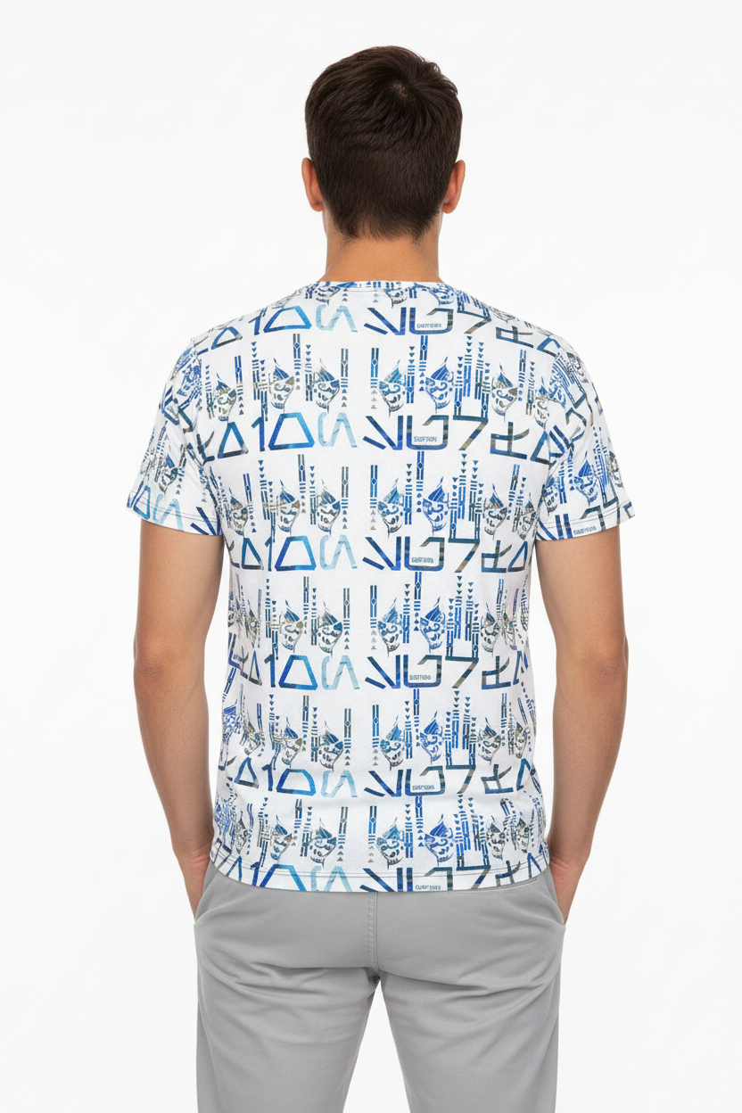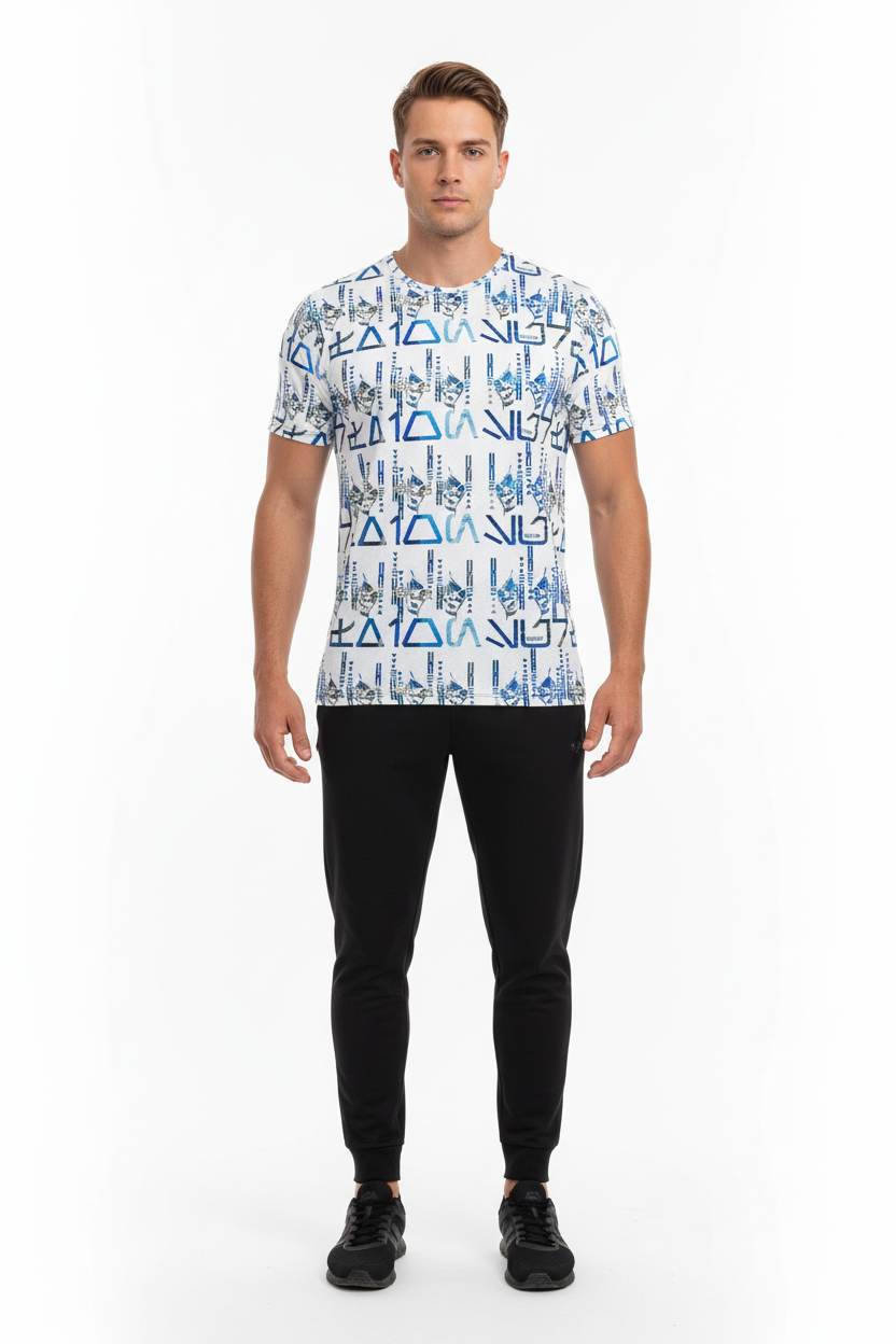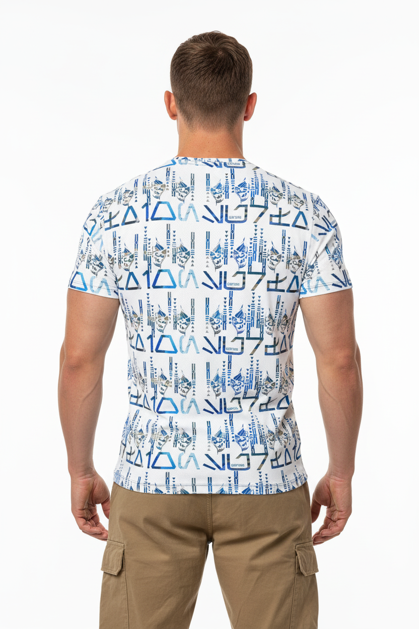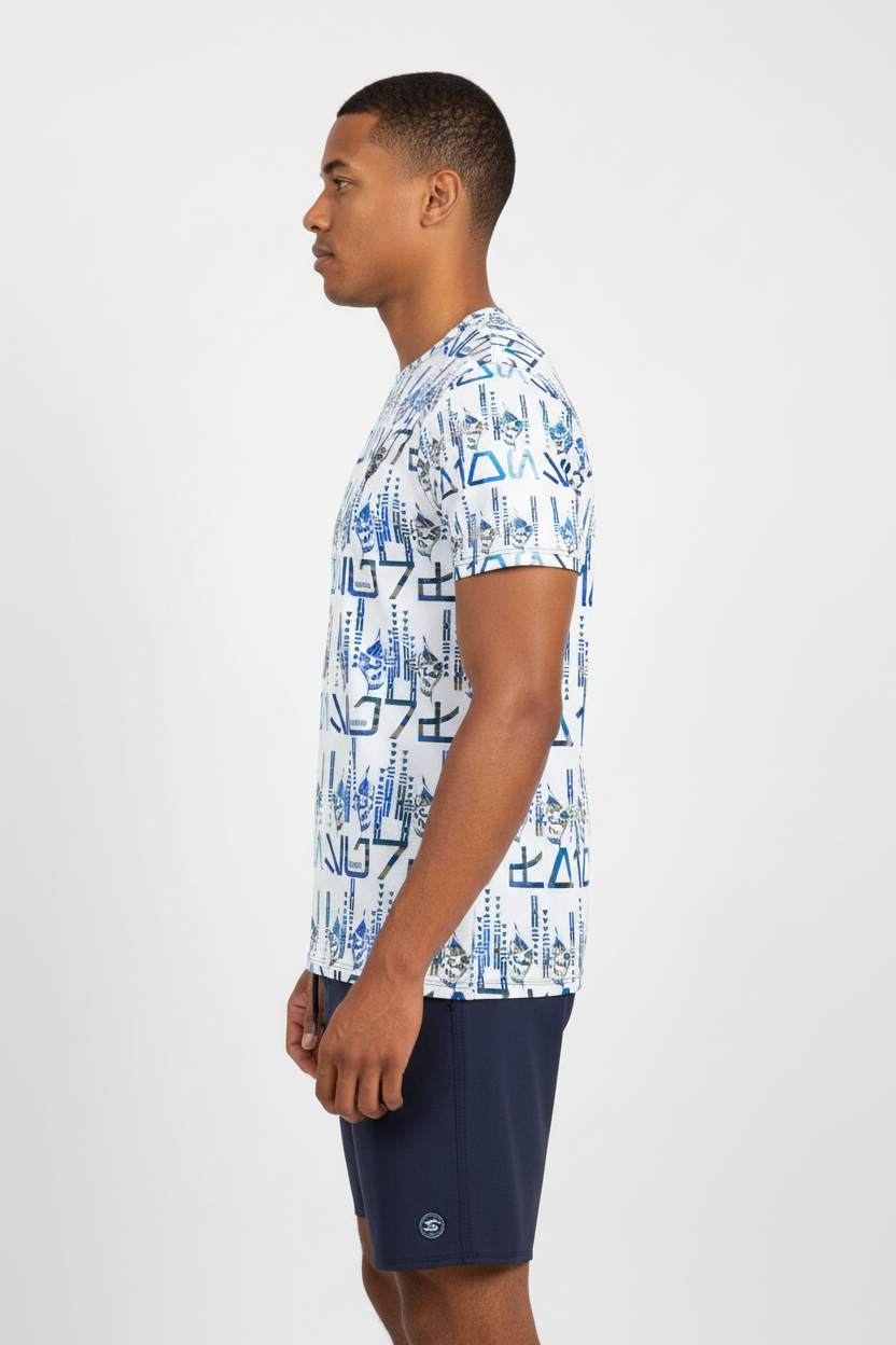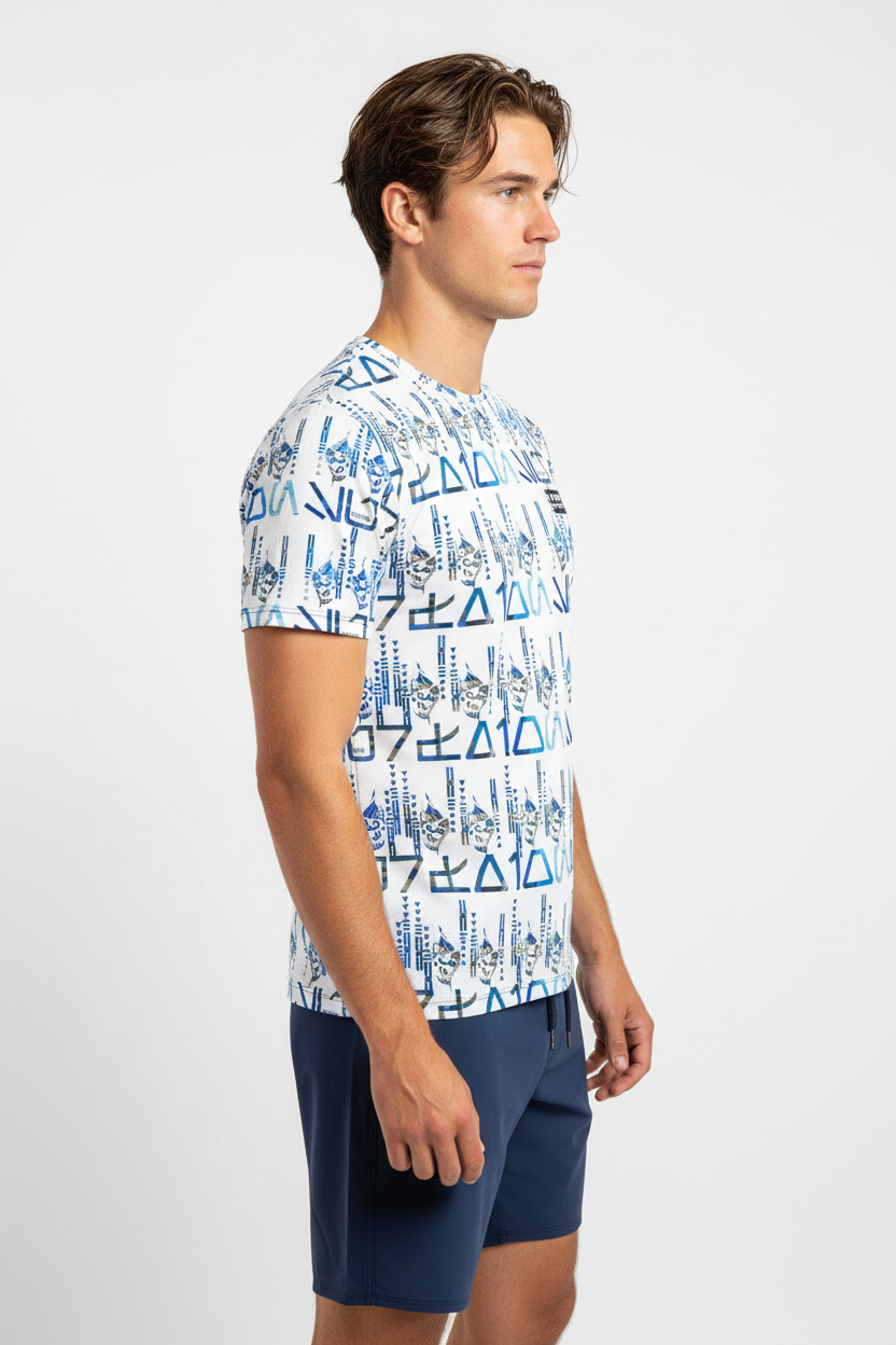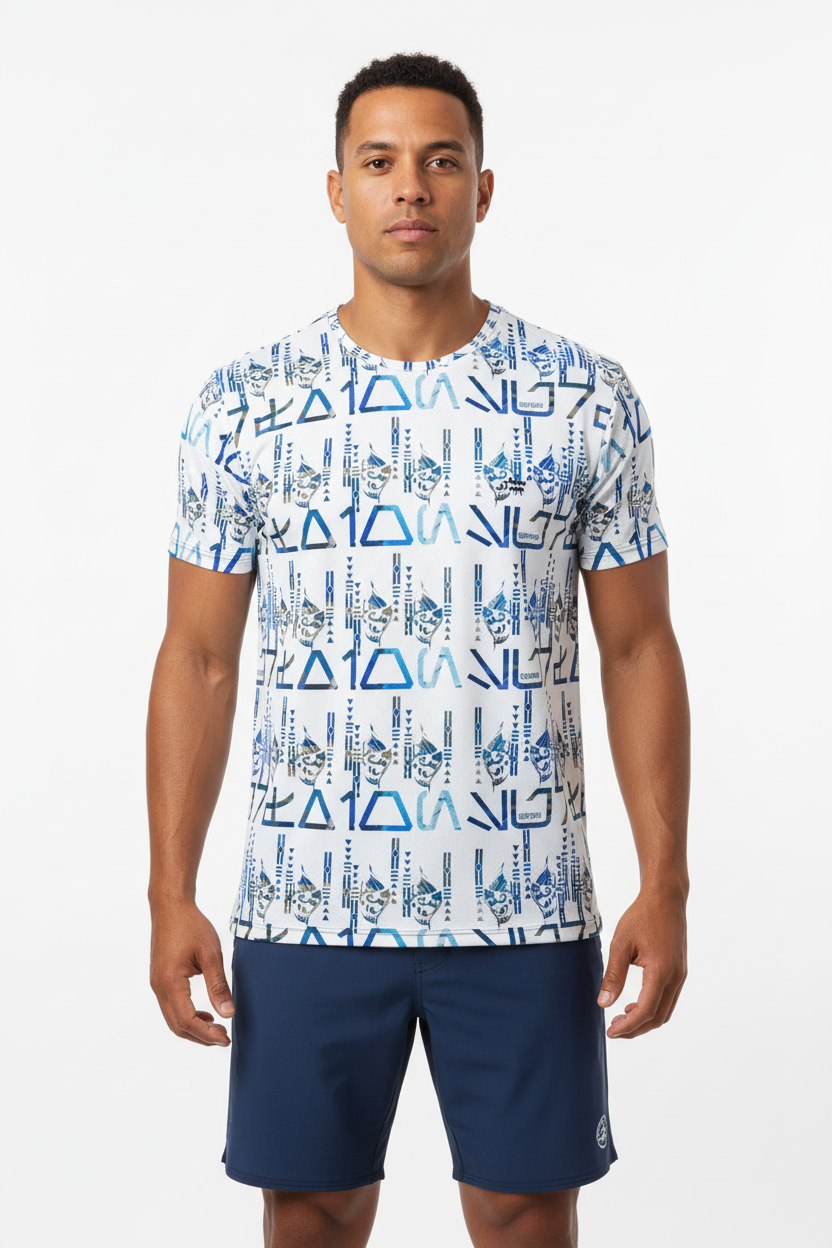 The Tribals Men's Athletic T-shirt brings bold, geometric tribal-inspired design to your active lifestyle. Featuring a striking blue symbol pattern on a white base, this performance tee combines eye-catching style with technical fabric that keeps you comfortable through every workout, run, or casual day out.