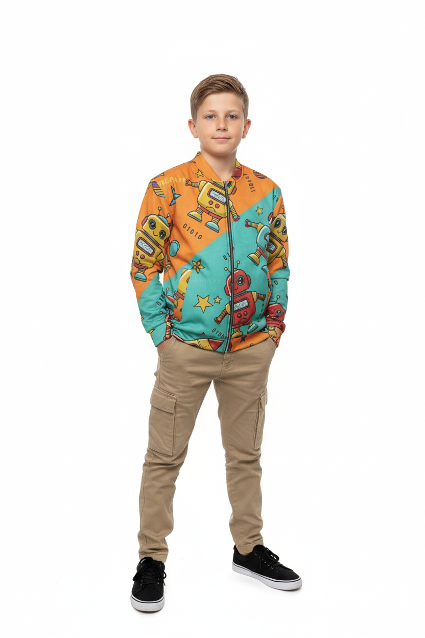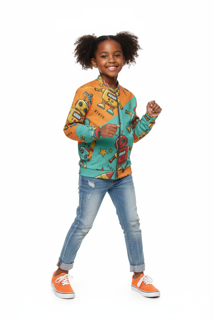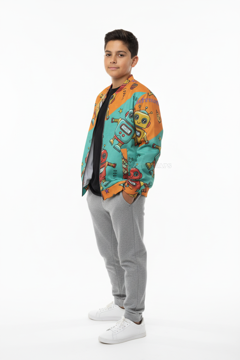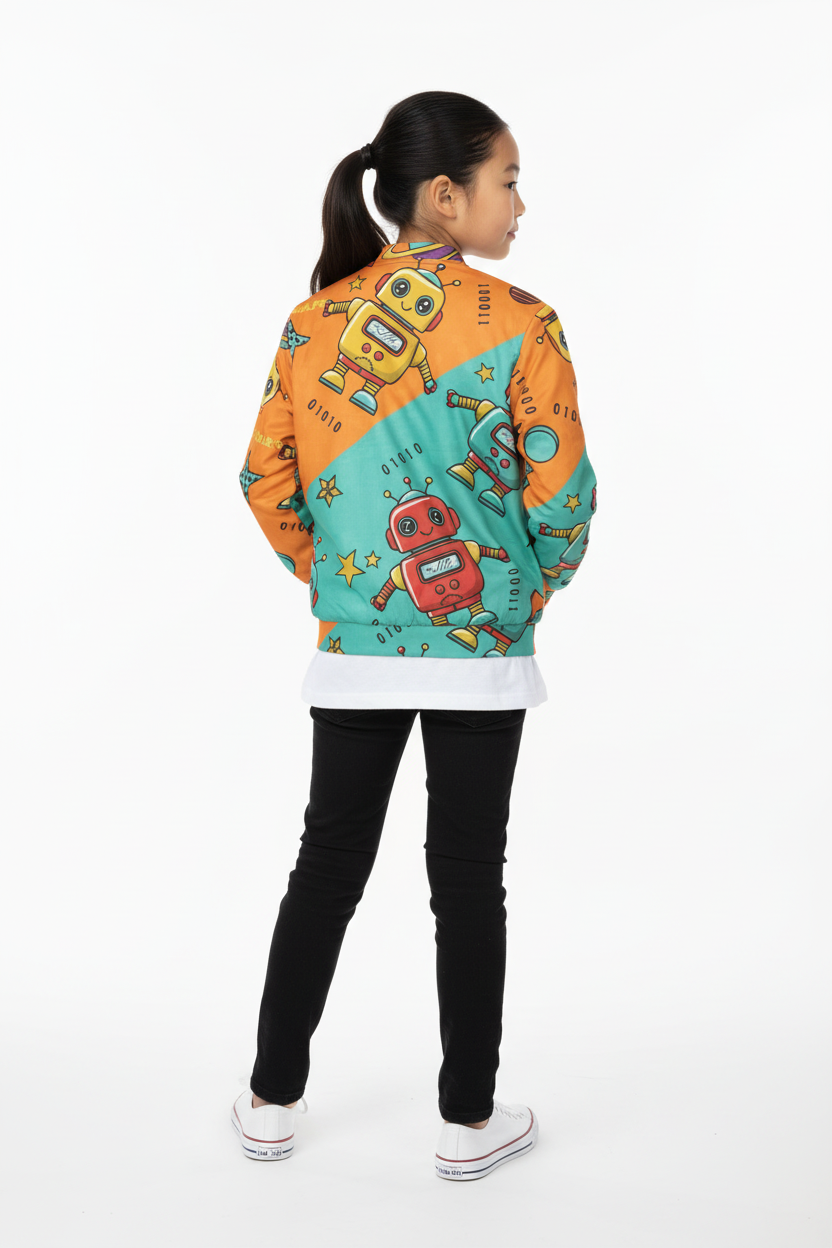 Celebrate their creative spirit. The Robot Friends Bomber Jacket is designed for kids who love technology, innovation, and having fun.