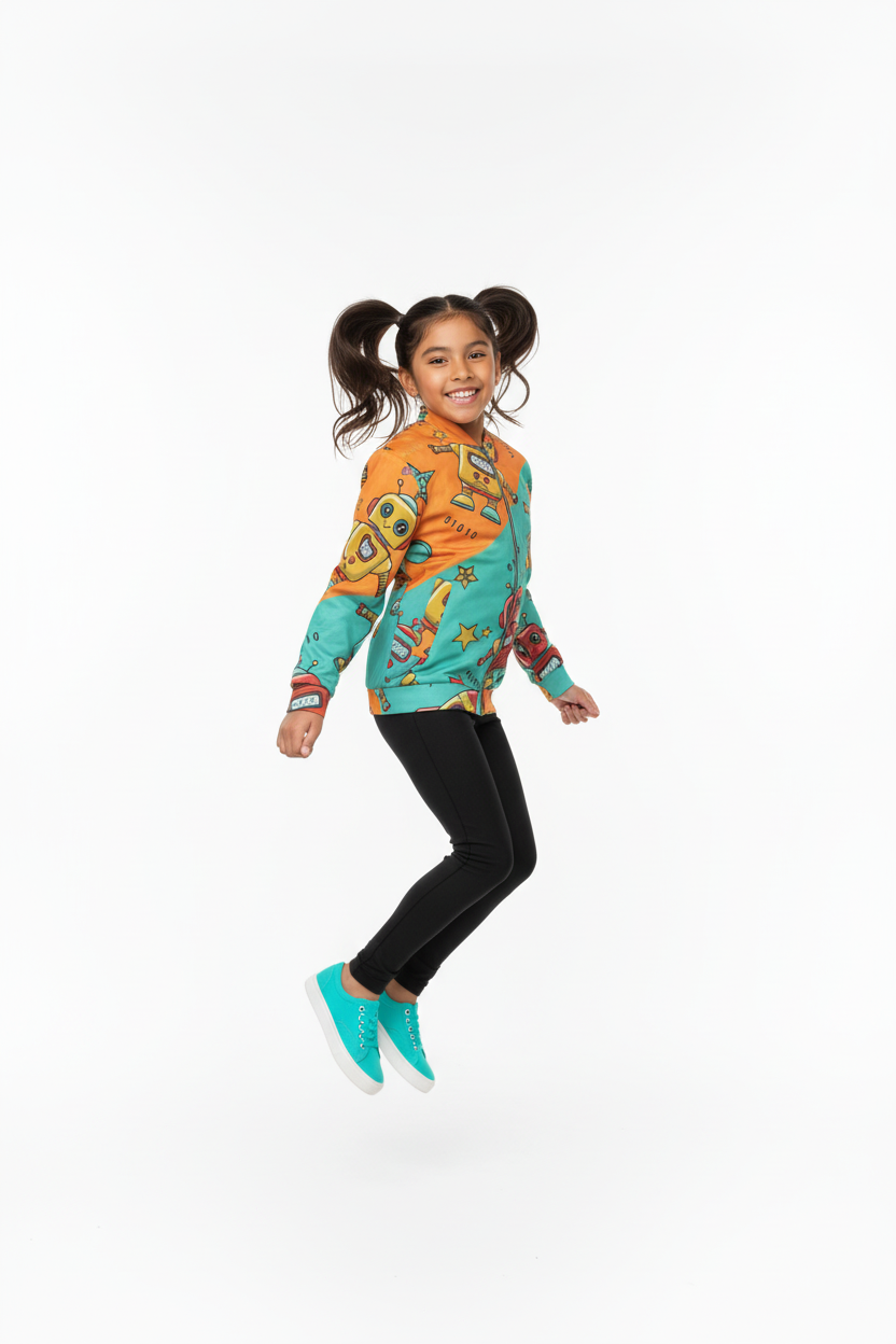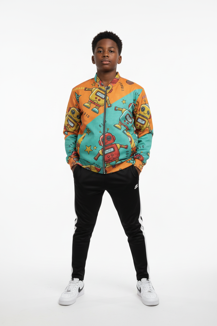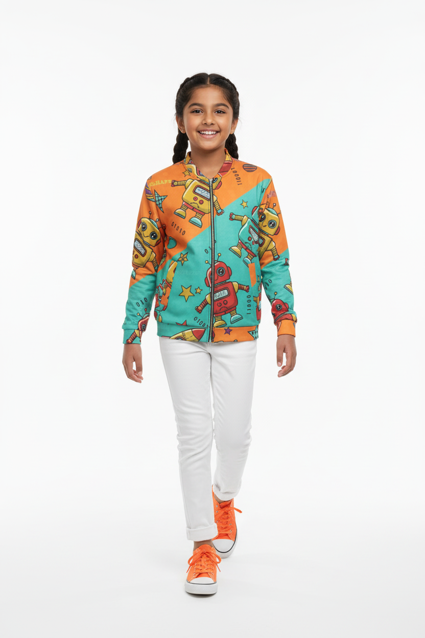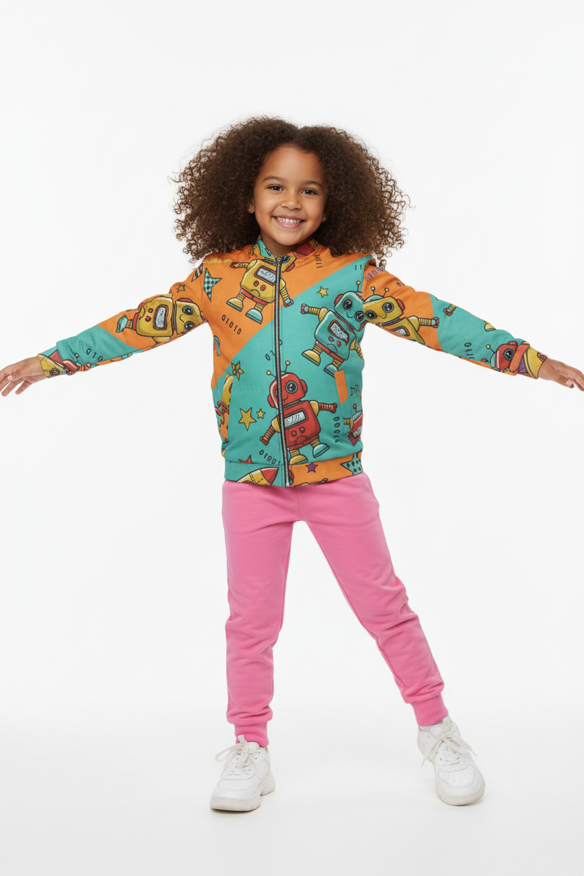 Celebrate their creative spirit. The Robot Friends Bomber Jacket is designed for kids who love technology, innovation, and having fun.