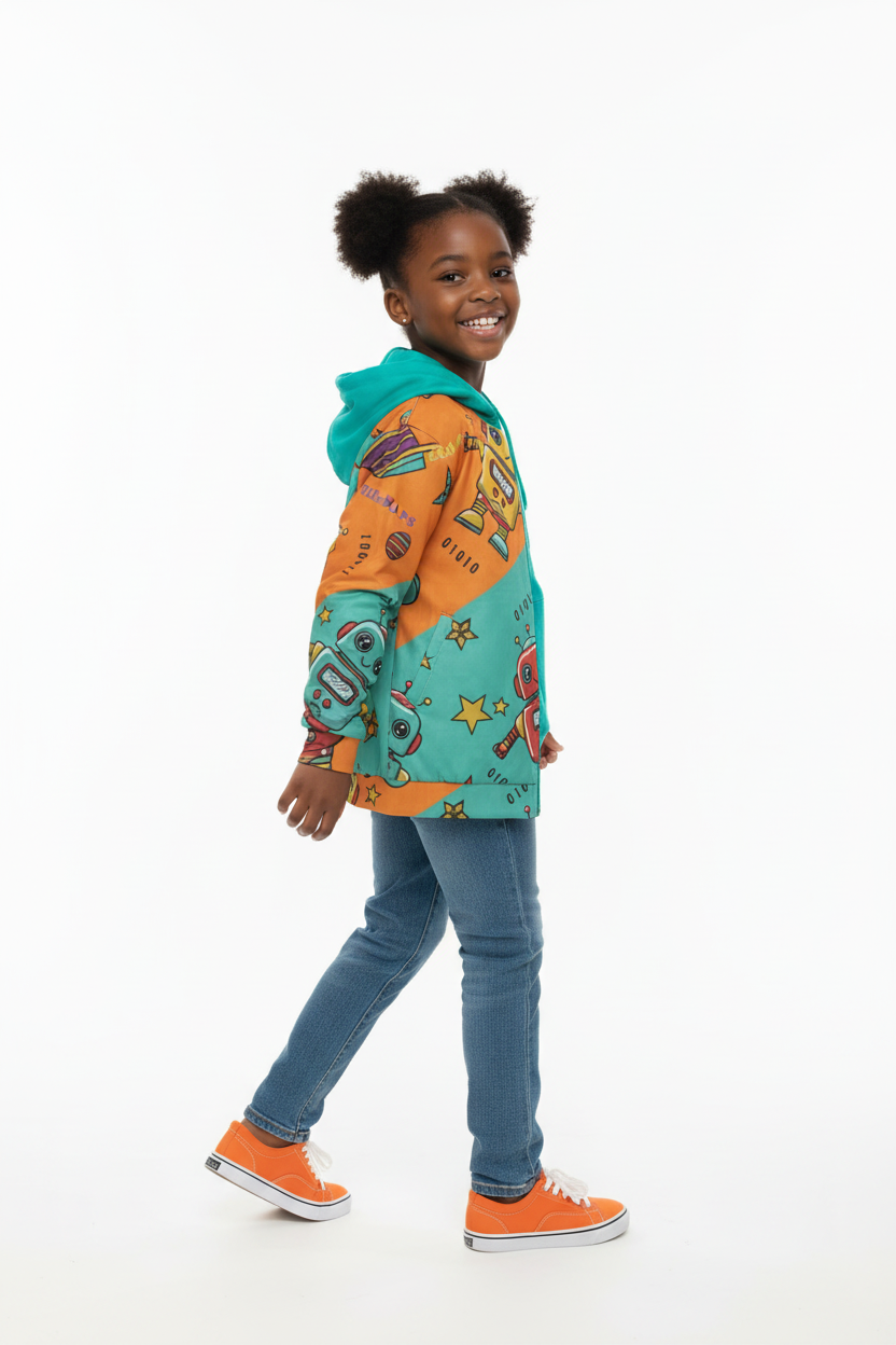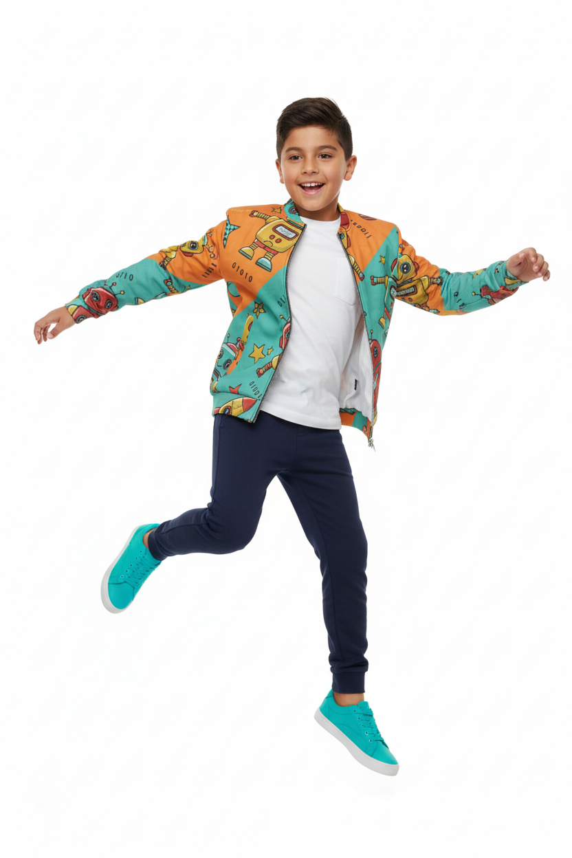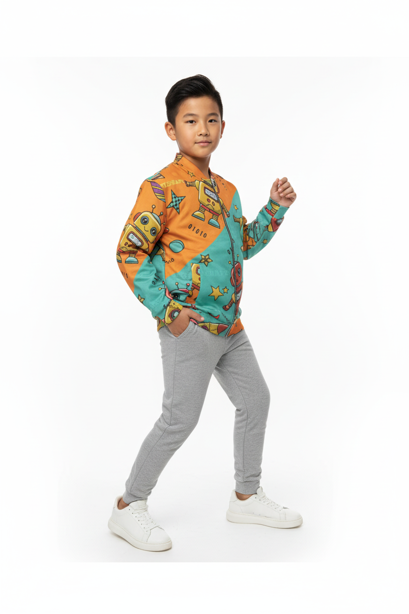 Perfect for school days, outdoor play, or weekend adventures. Layer over t-shirts for mild weather or hoodies for extra warmth. The vibrant robot design pairs effortlessly with jeans, joggers, or casual pants, making it a go-to piece for tech-loving kids.