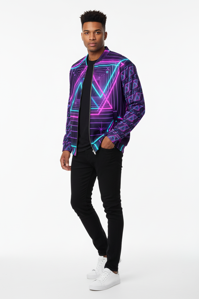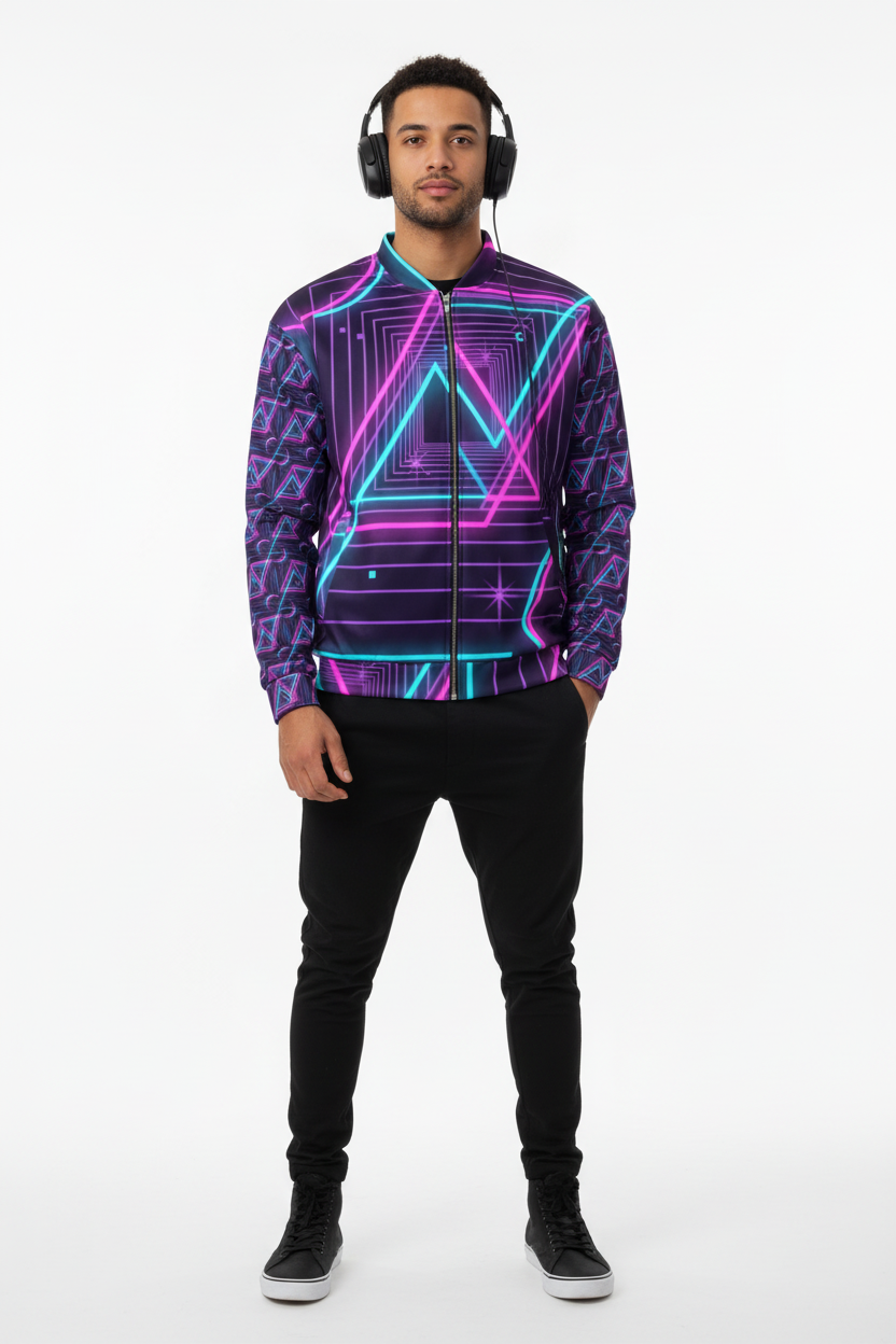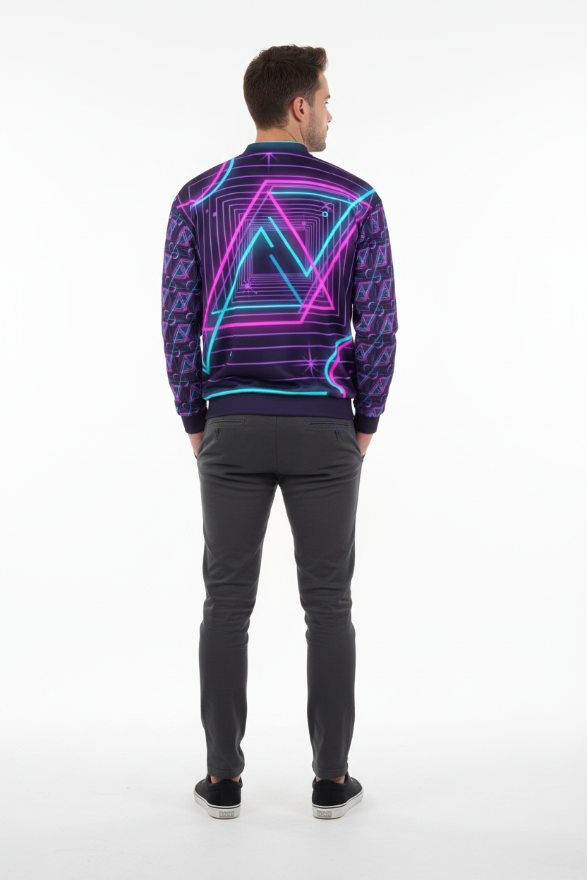 Introducing the Neon Nights Unisex Bomber Jacket—where futuristic neon aesthetics meet premium comfort. Featuring an electrifying design with vibrant pink and cyan geometric patterns, neon triangles, and Alppeer branding on the sleeves, this isn't just a jacket; it's a statement piece that commands attention.
