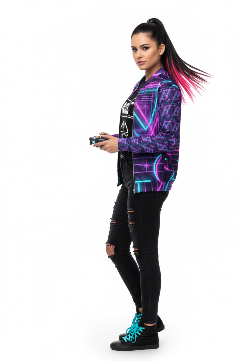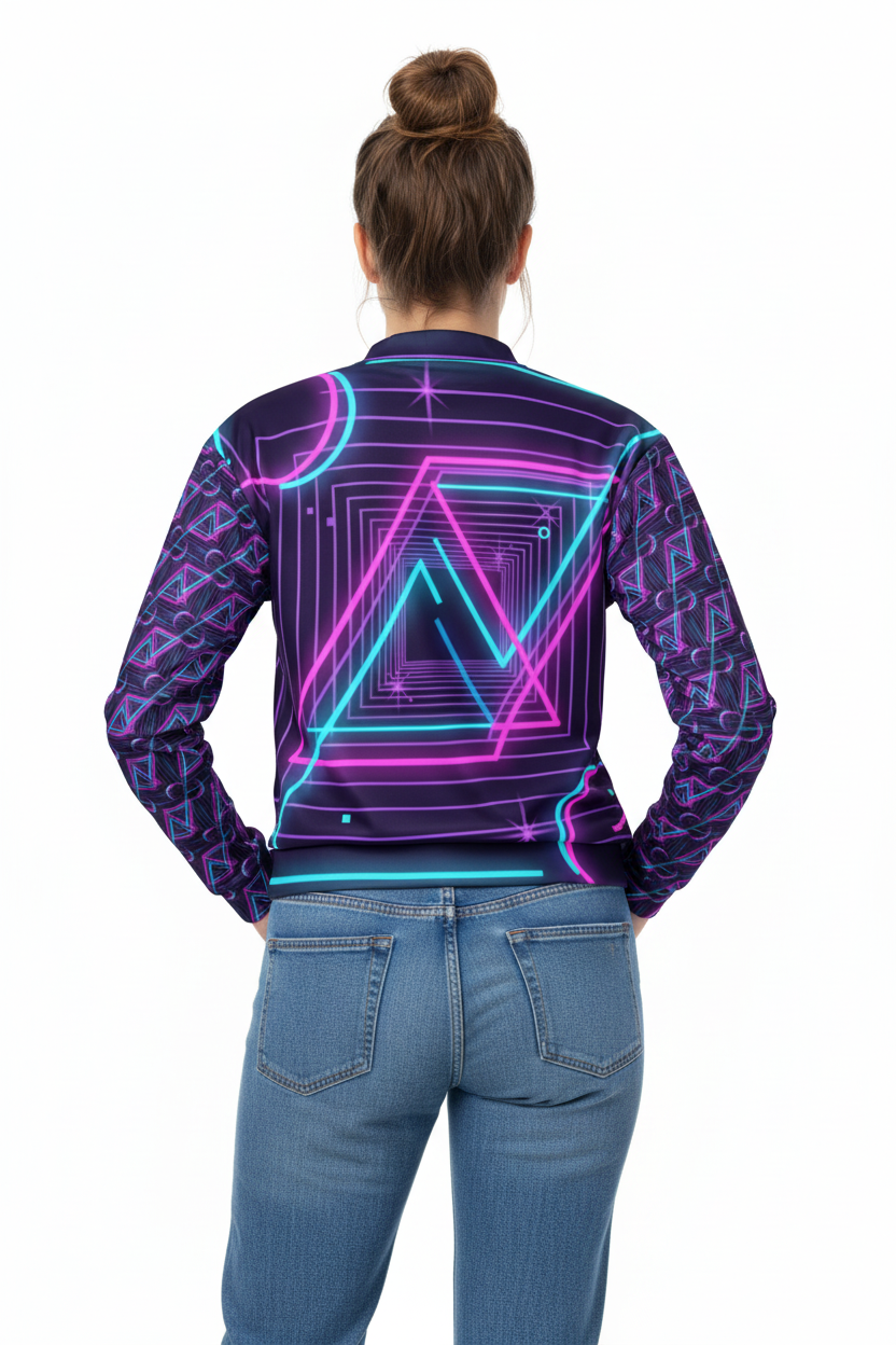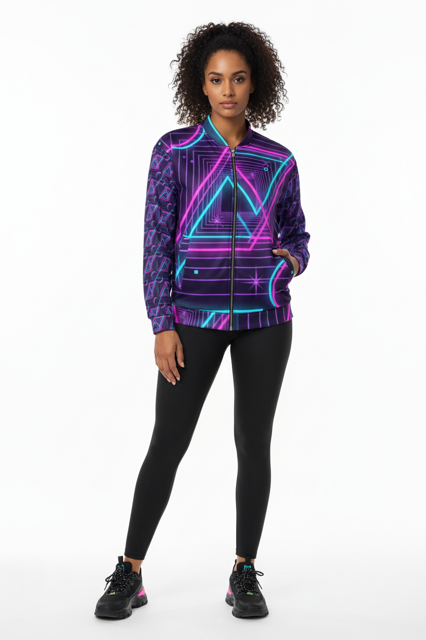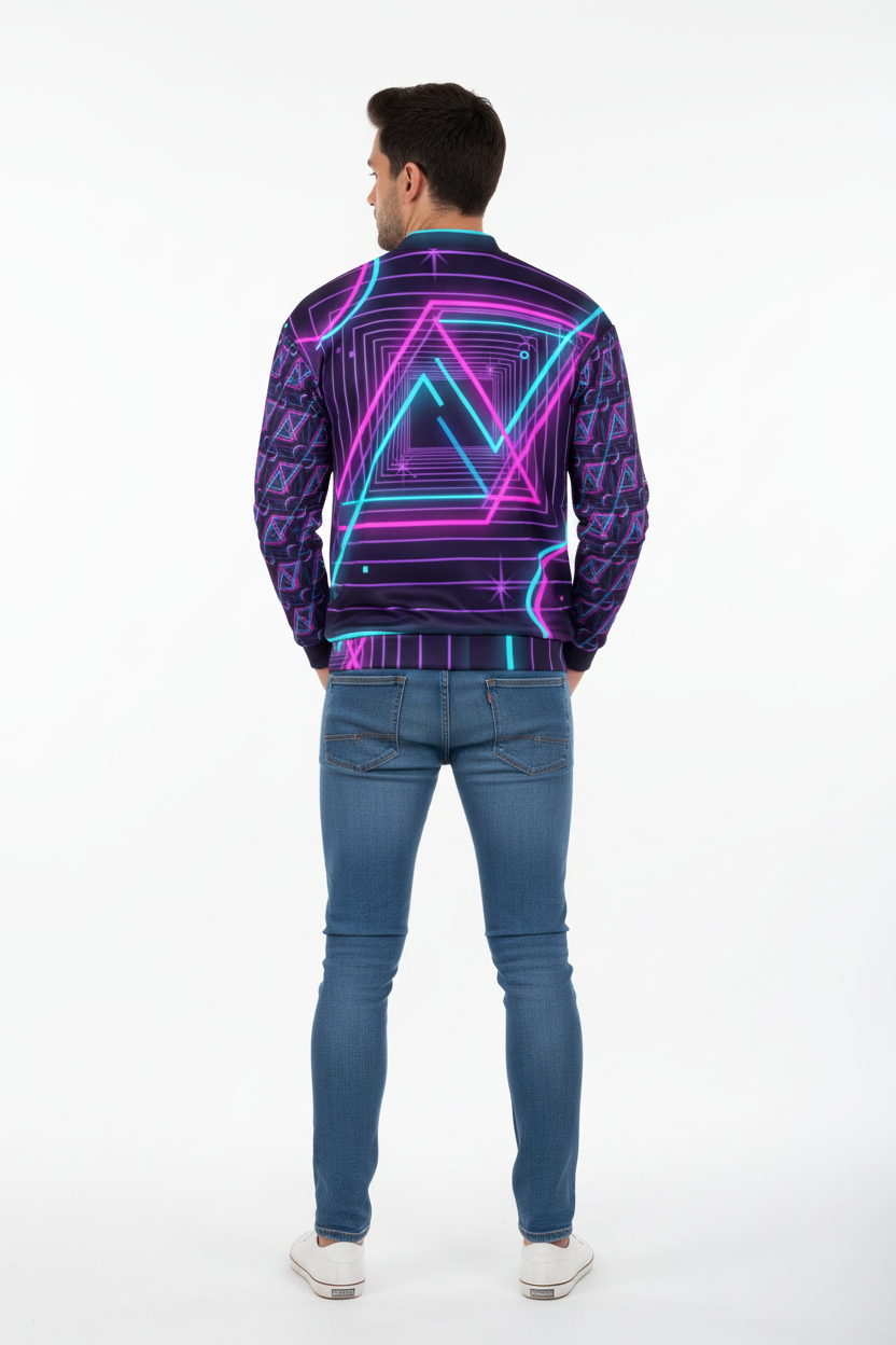 Introducing the Neon Nights Unisex Bomber Jacket—where futuristic neon aesthetics meet premium comfort. Featuring an electrifying design with vibrant pink and cyan geometric patterns, neon triangles, and Alppeer branding on the sleeves, this isn't just a jacket; it's a statement piece that commands attention.