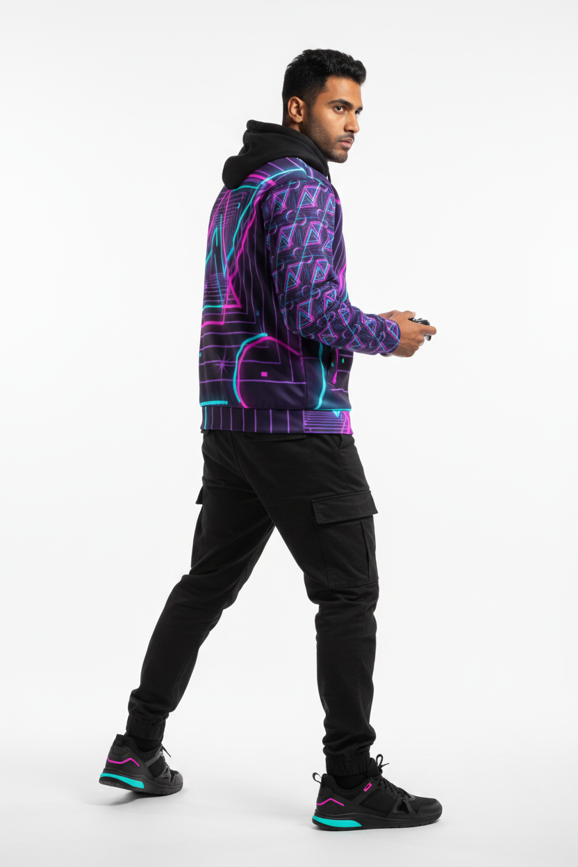 - Eye-catching design with neon pink and cyan geometric patterns, glowing triangles, and retro-futuristic vibes