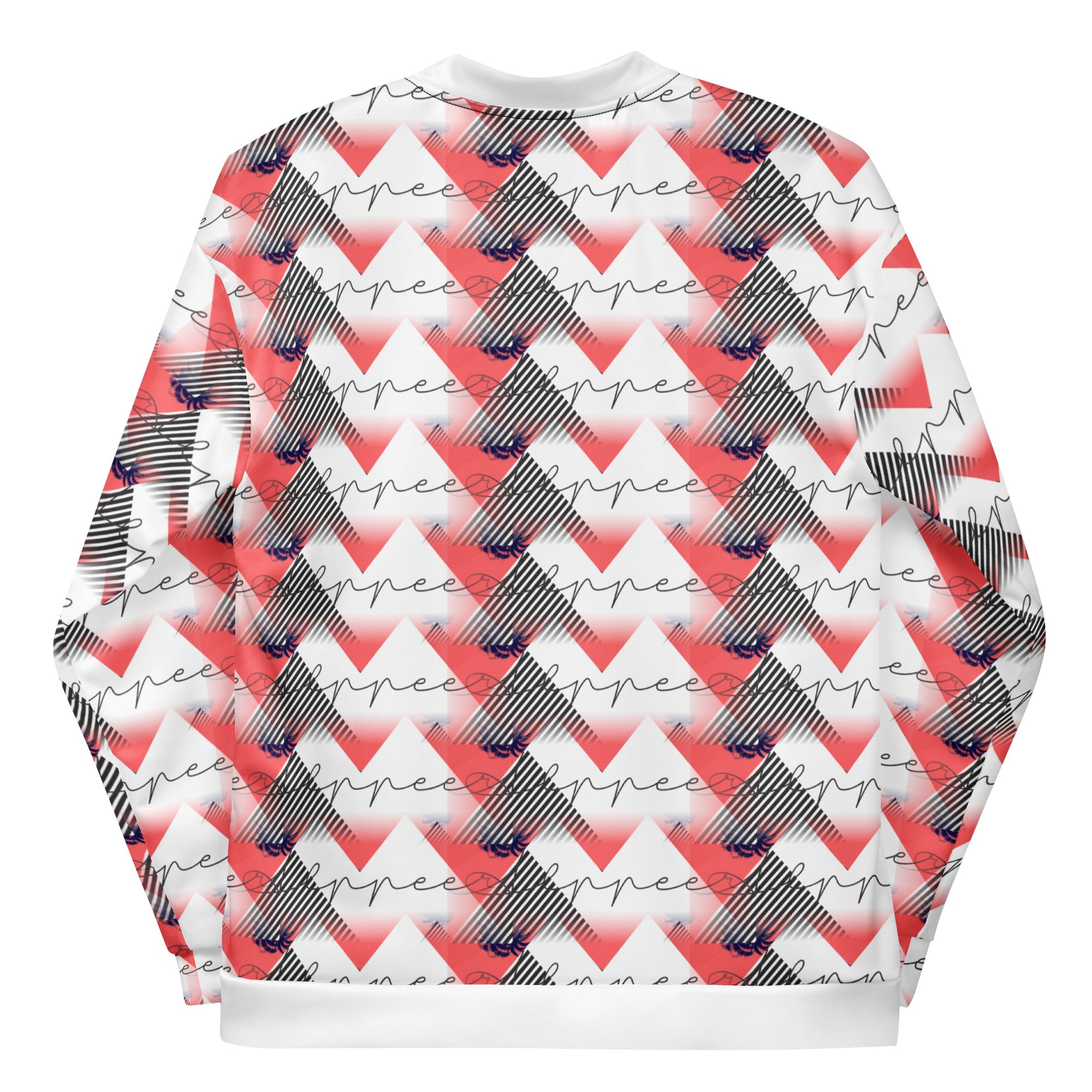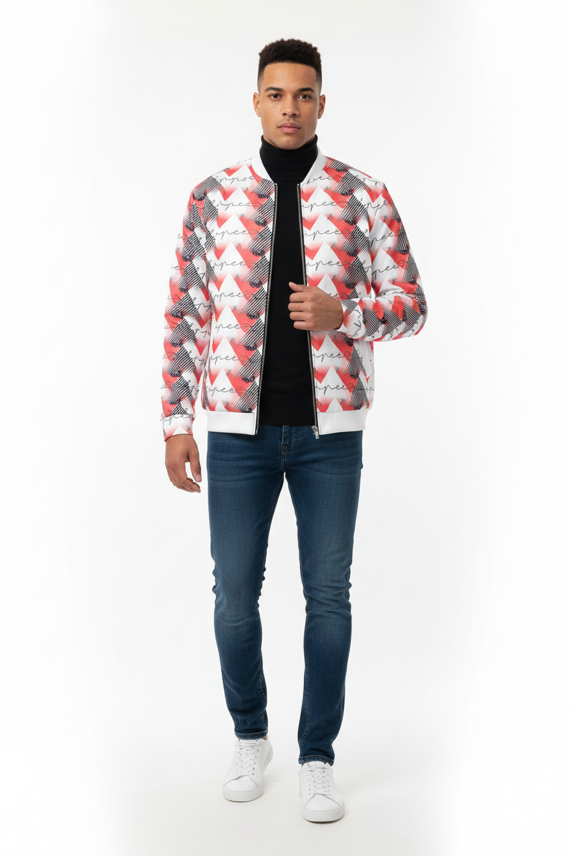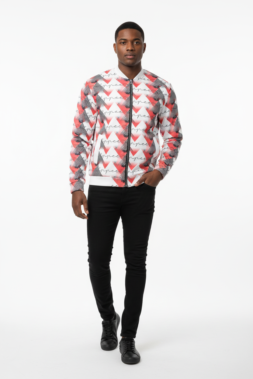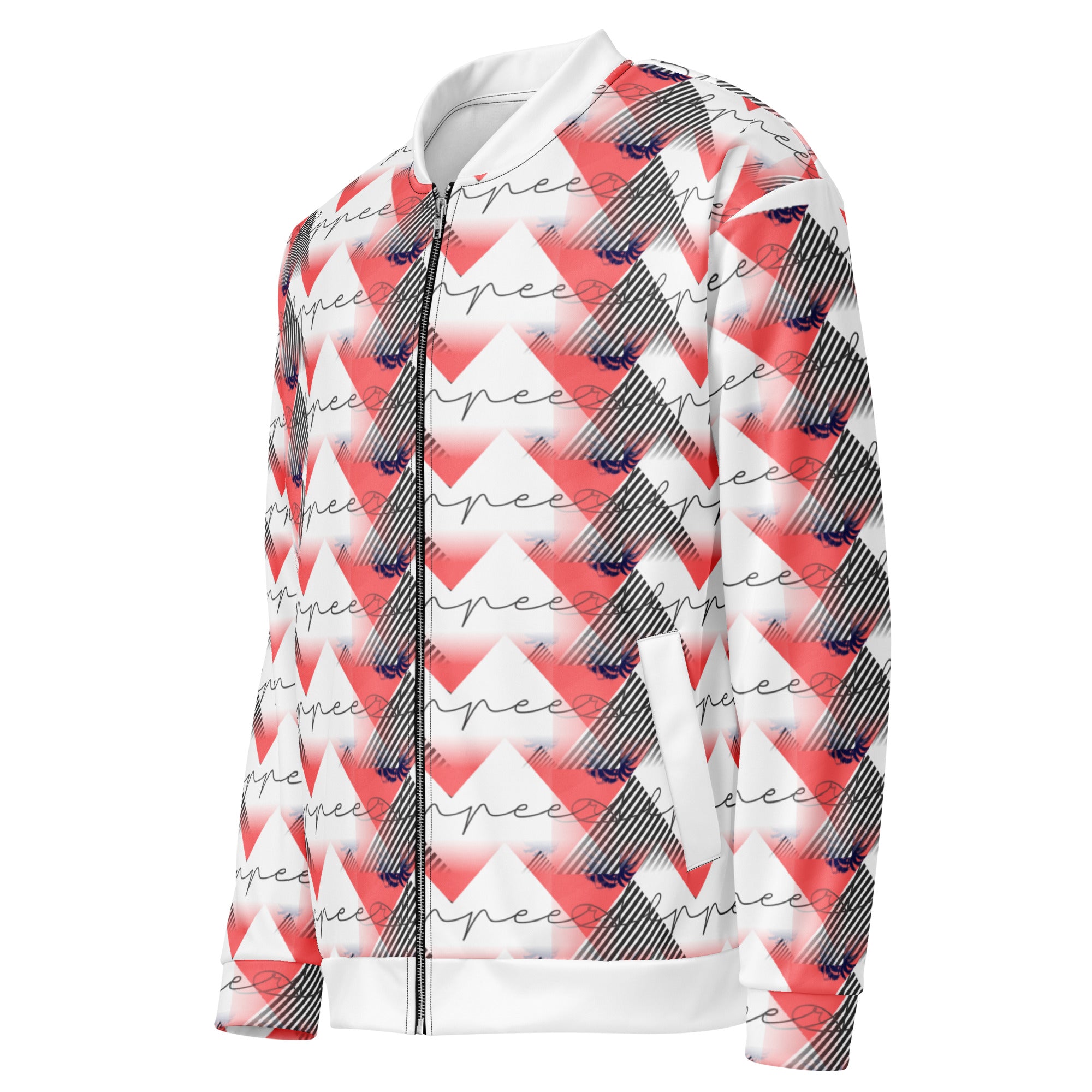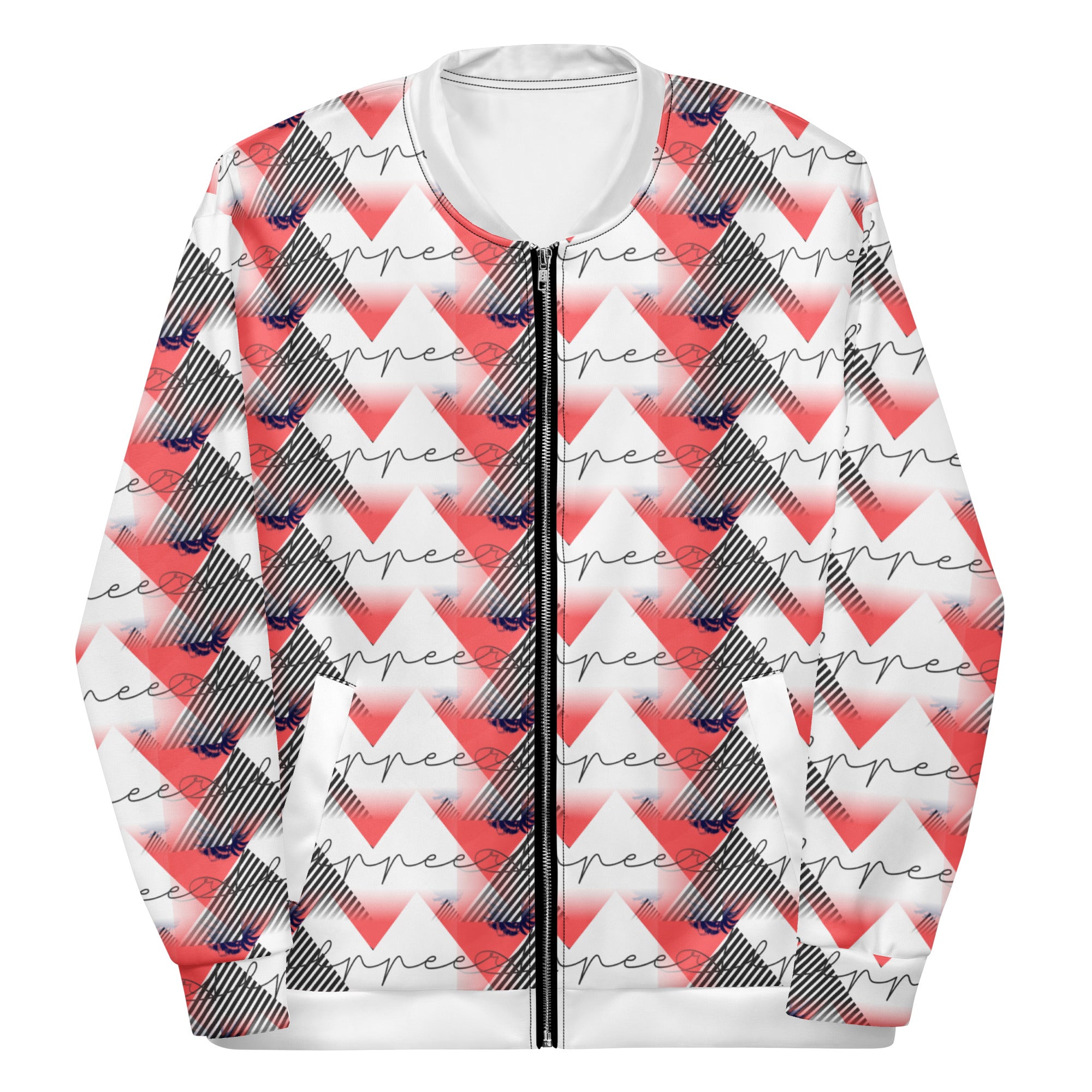 Introducing the Alppeer Signature Geometric Bomber Jacket—where contemporary design meets classic comfort. Featuring a striking red, navy, and white geometric pattern with diagonal stripes and the Alppeer script woven throughout, this isn't just a jacket; it's a statement of confidence and style.
