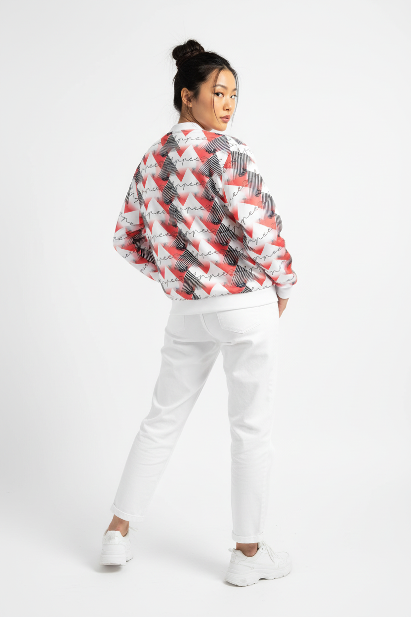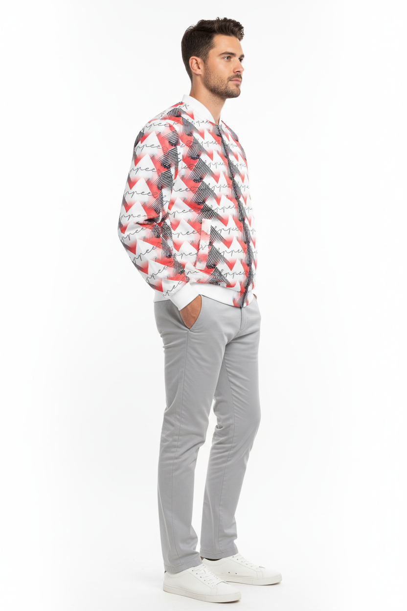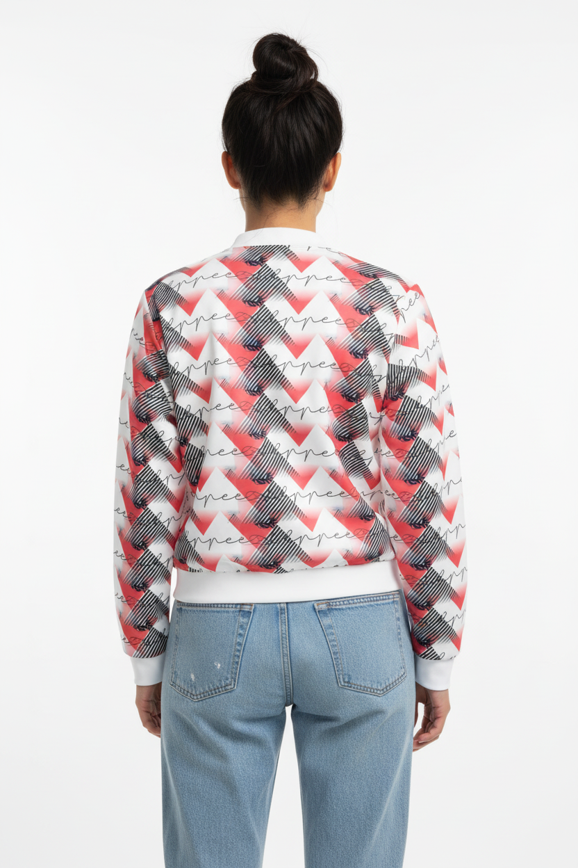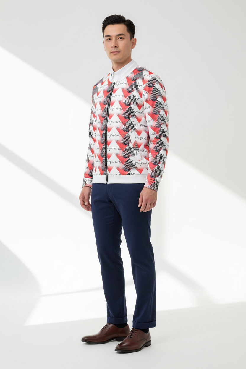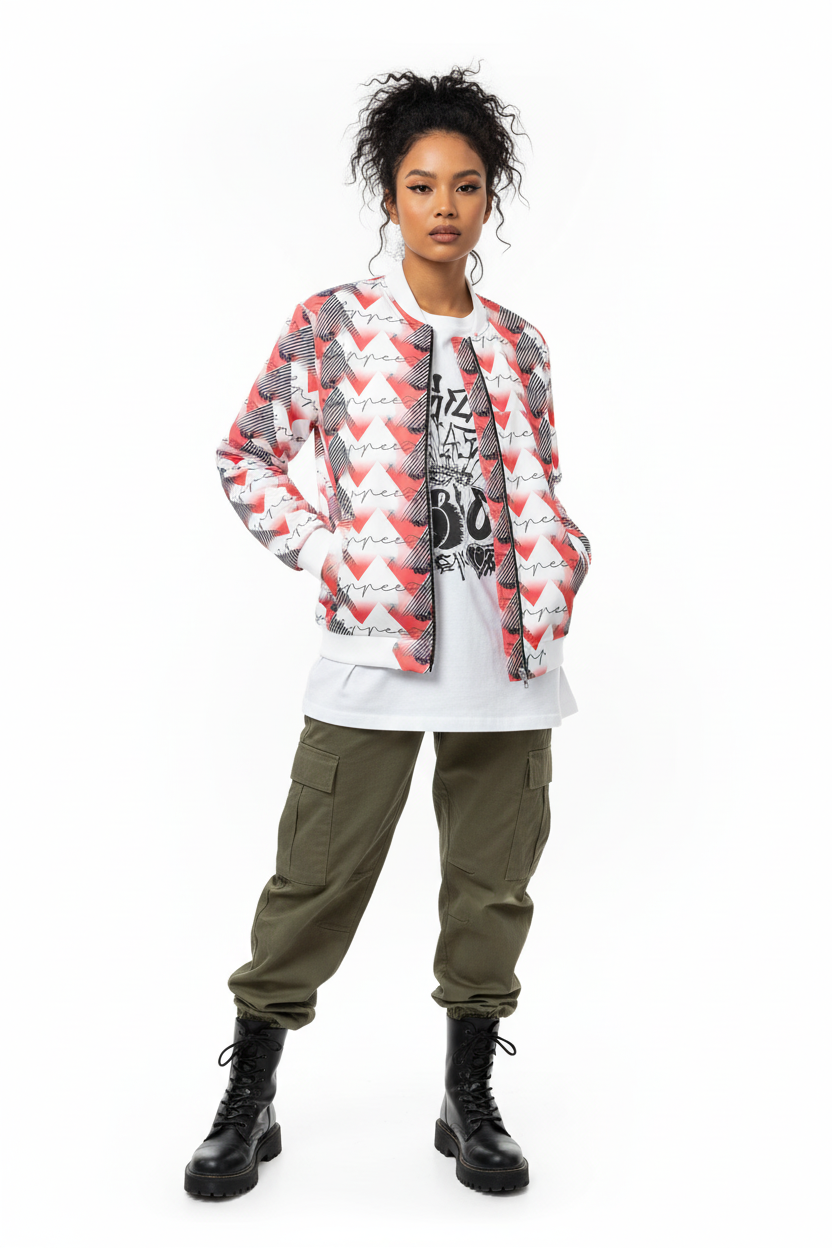 Introducing the Alppeer Signature Geometric Bomber Jacket—where contemporary design meets classic comfort. Featuring a striking red, navy, and white geometric pattern with diagonal stripes and the Alppeer script woven throughout, this isn't just a jacket; it's a statement of confidence and style.